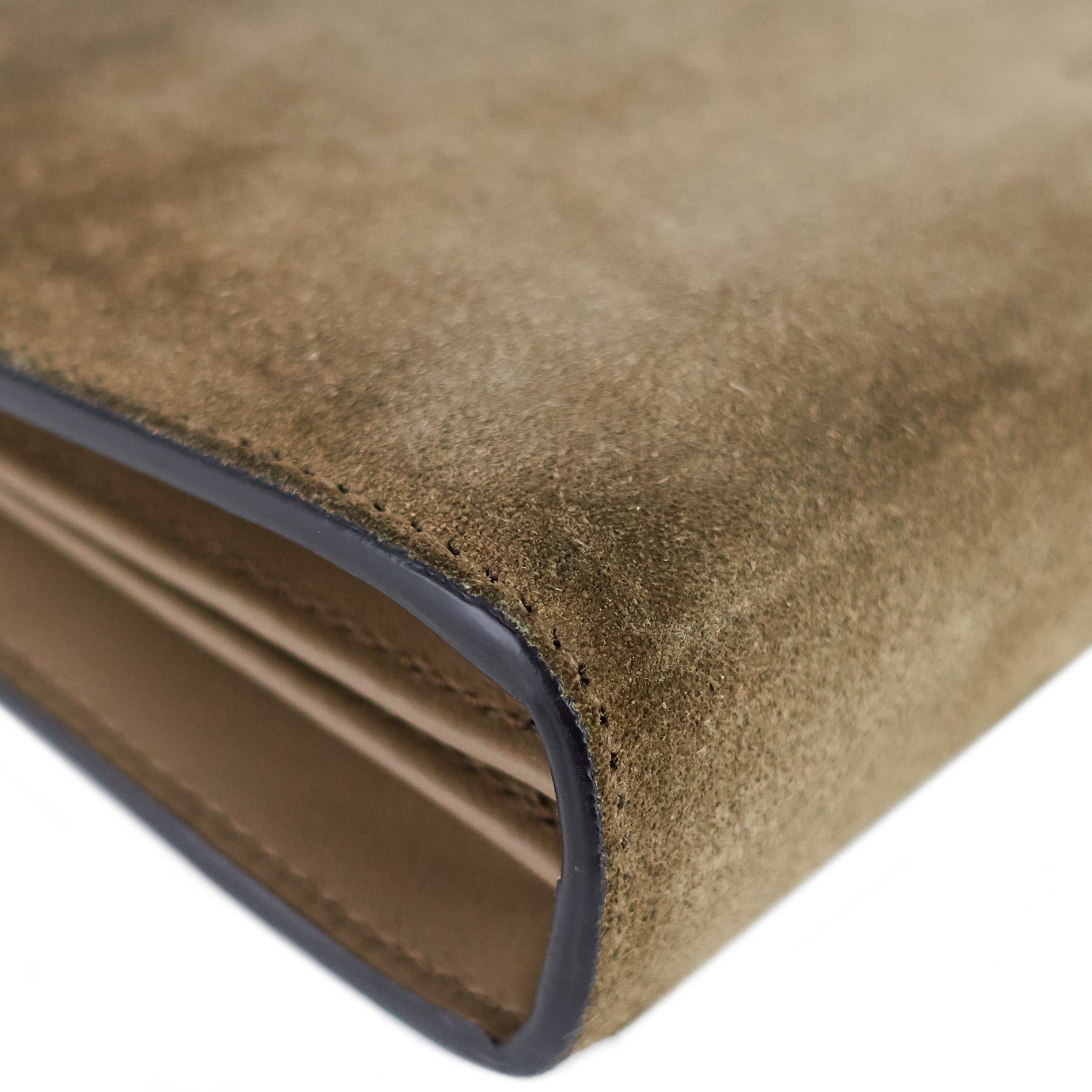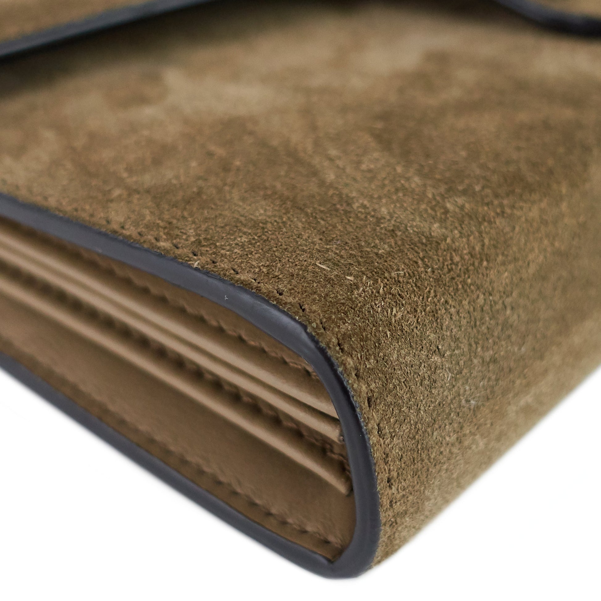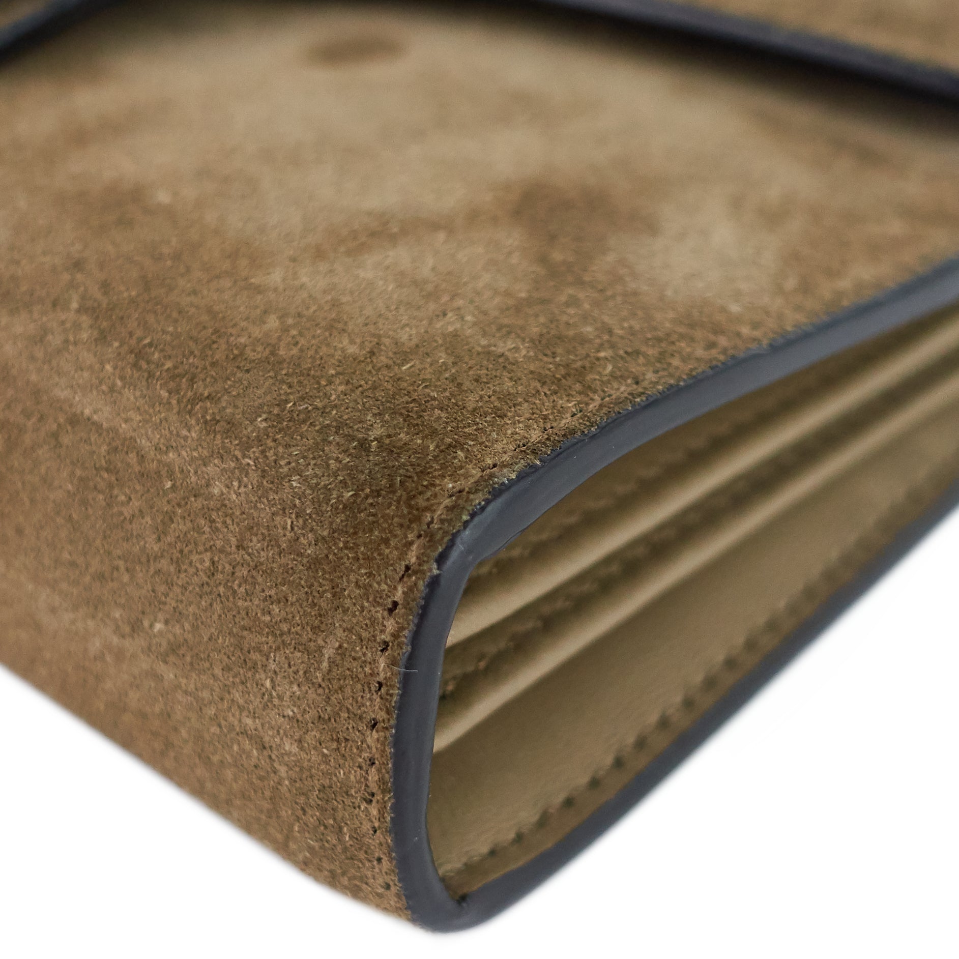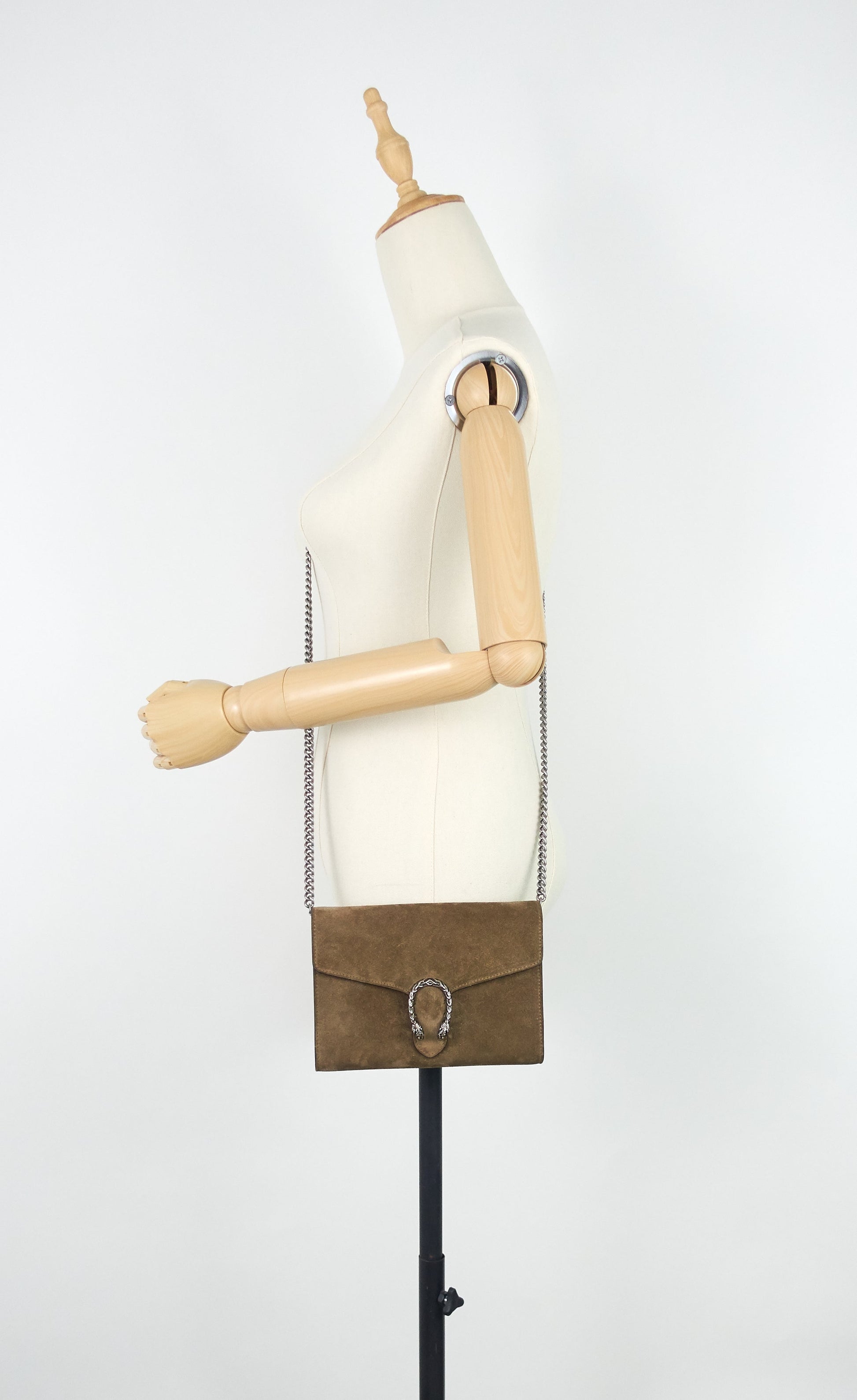 Inspired by the ancient Greek god Dionysus, a two-headed tiger spur stands out on the front of a suede bag that can be slung over the shoulder or carried as a chic clutch. The interior is well-organized, with a pocket for virtually every essential.