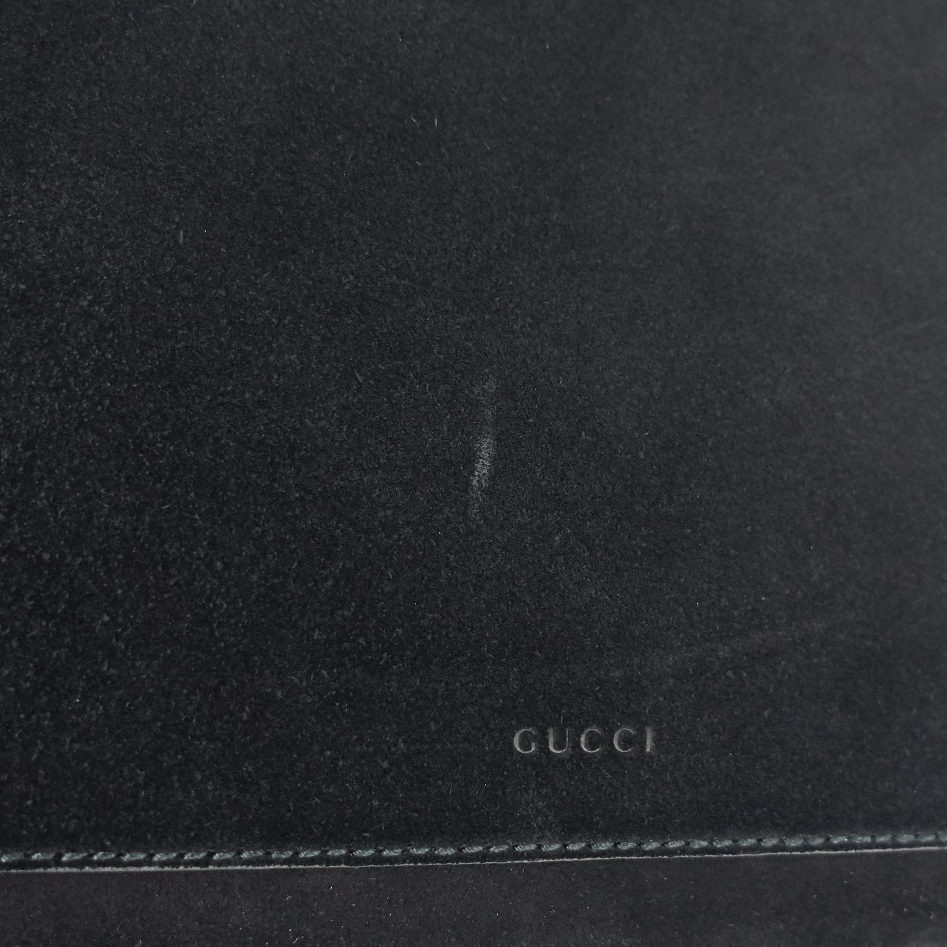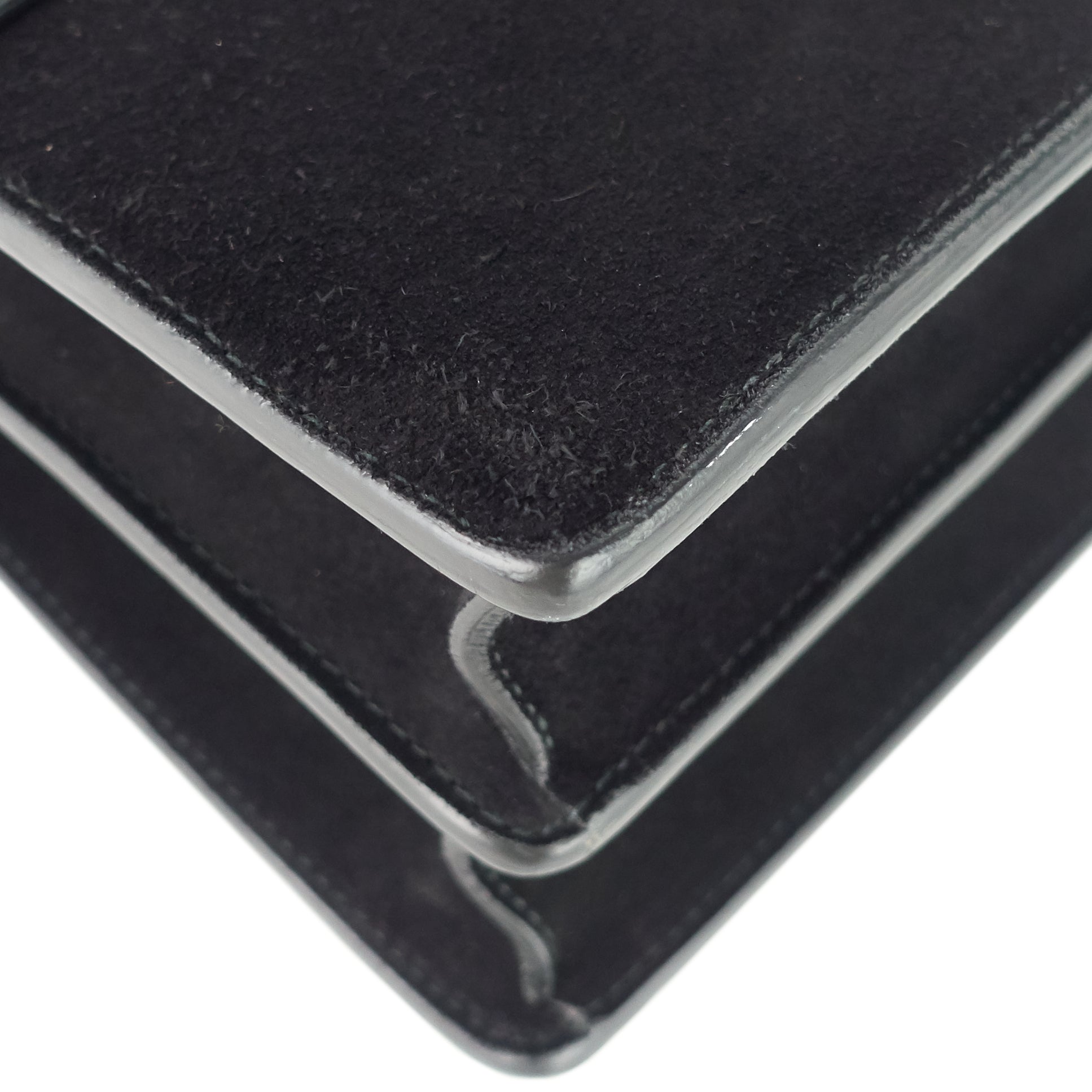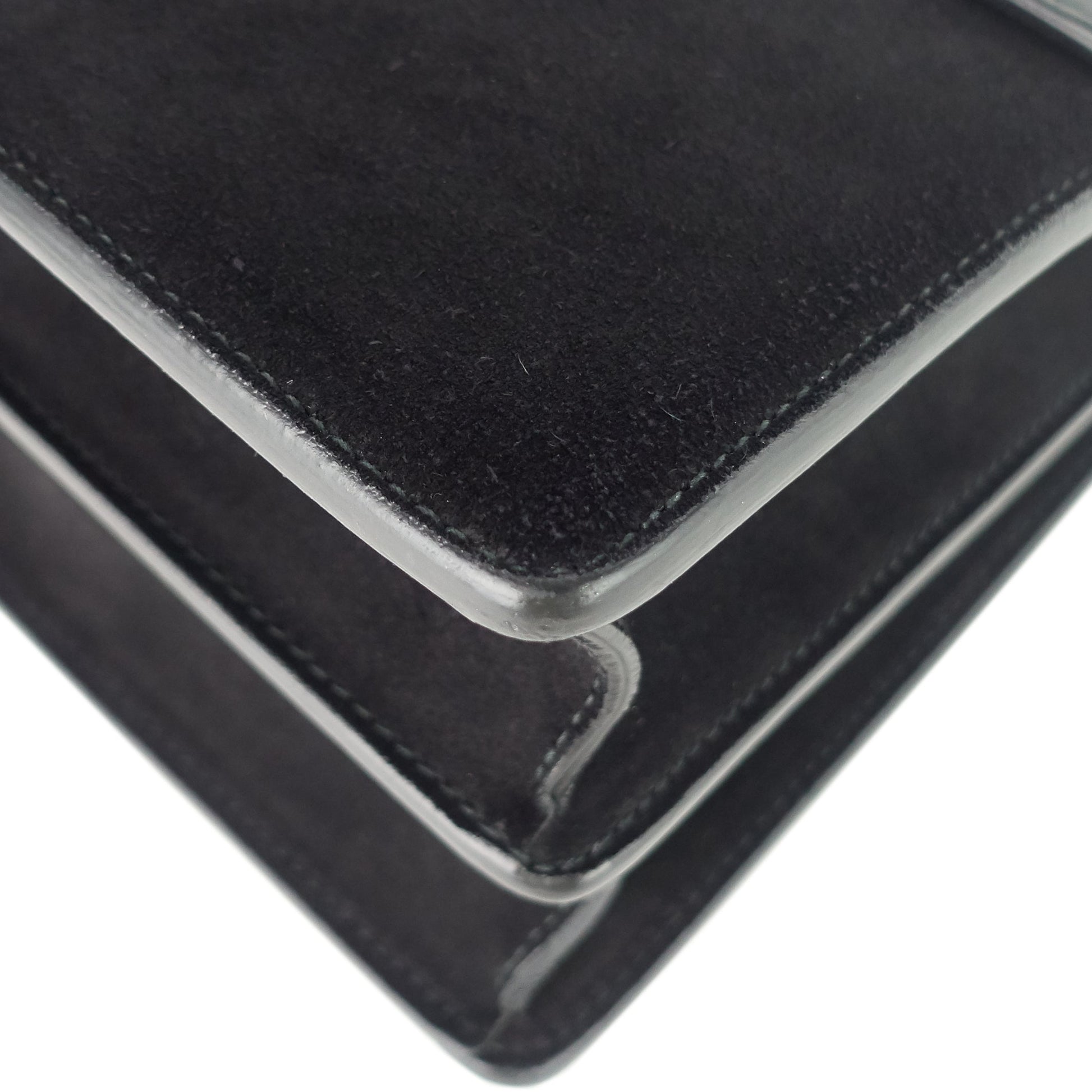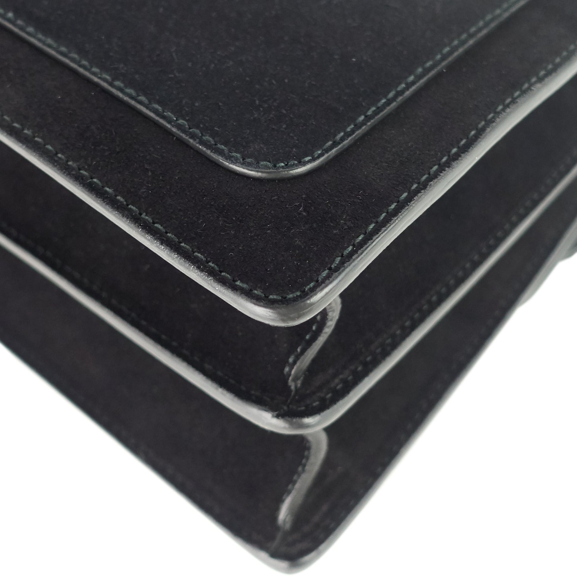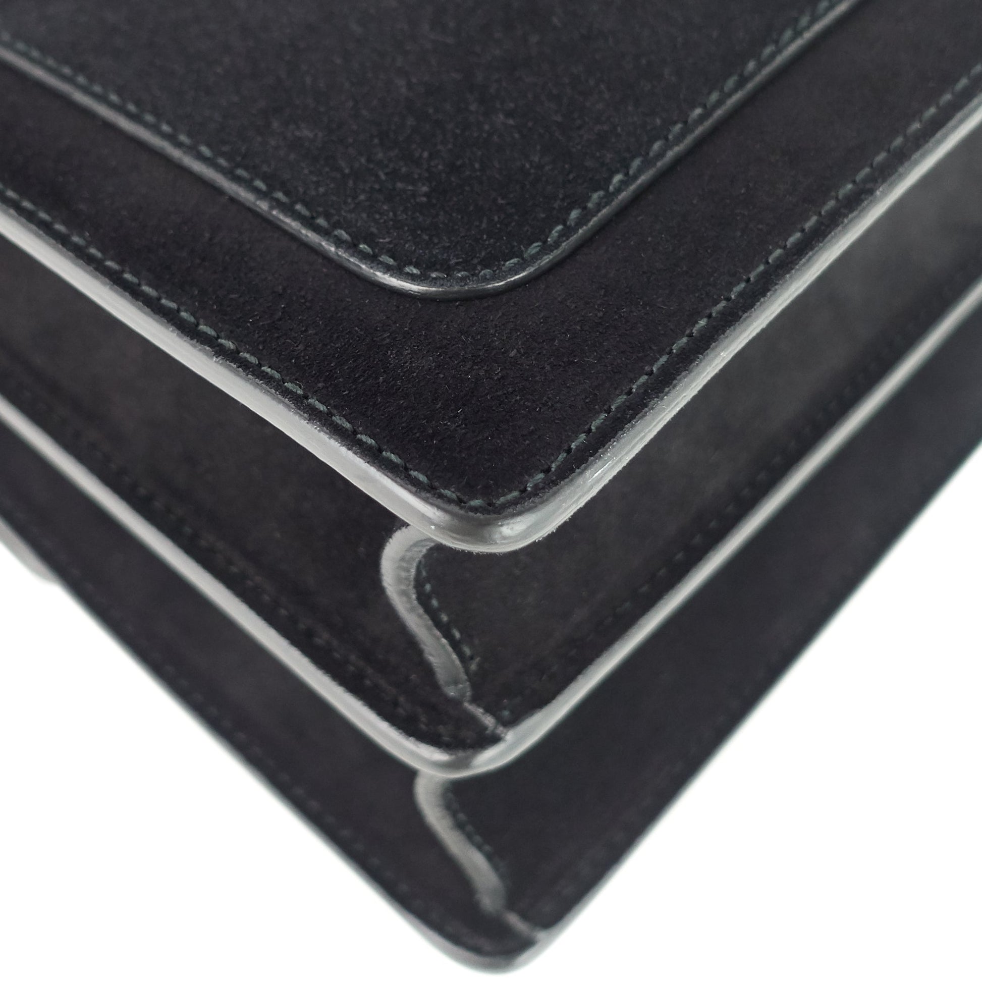 Overall: The exterior suede is in excellent condition with several minor scratches. The interior leather is in good condition with some faint scratches and marks as well as several small glue residue stains. The hardware remains shiny with no visible wear.