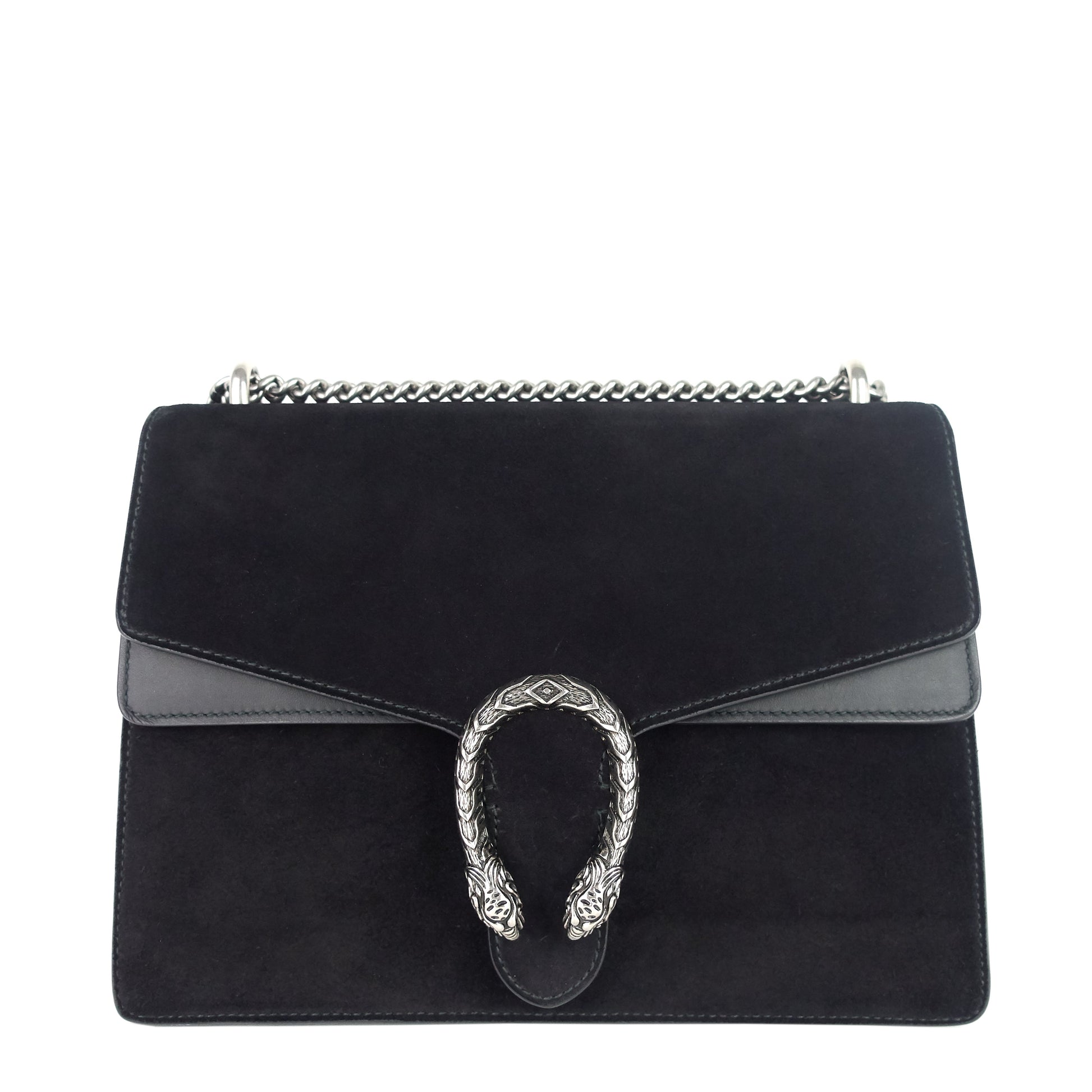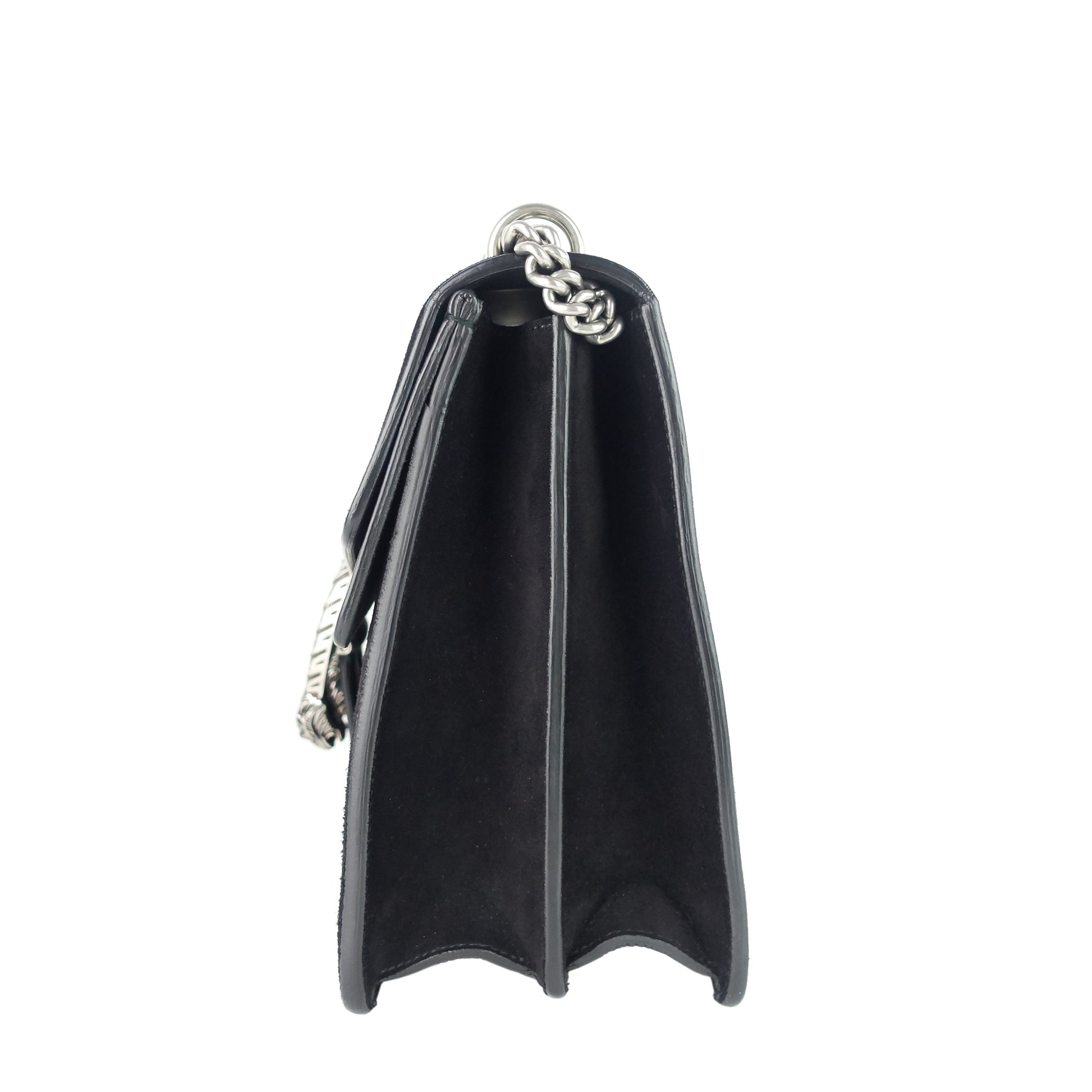 Inspired by the ancient Greek god Dionysus, a two-headed tiger spur stands out on the front of a spacious suede bag topped with a sliding chain-link strap for over-the-shoulder wear.