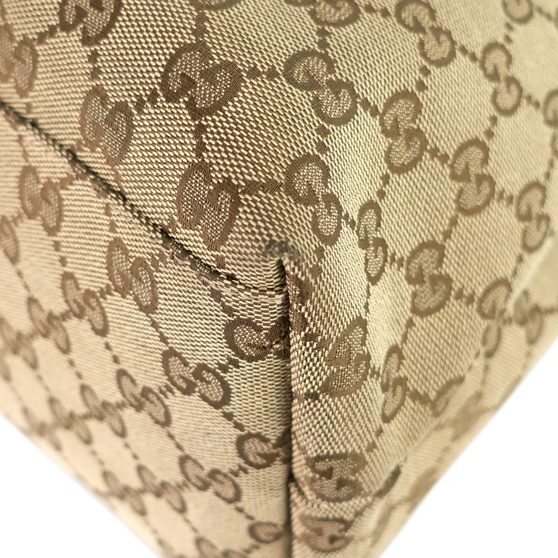 Overall: The exterior canvas is in excellent condition with no conspicuous wear. There are some loose threads along the the sides of the straps. The interior is clean with several faint stains. The hardware has minor wear consistent with age.