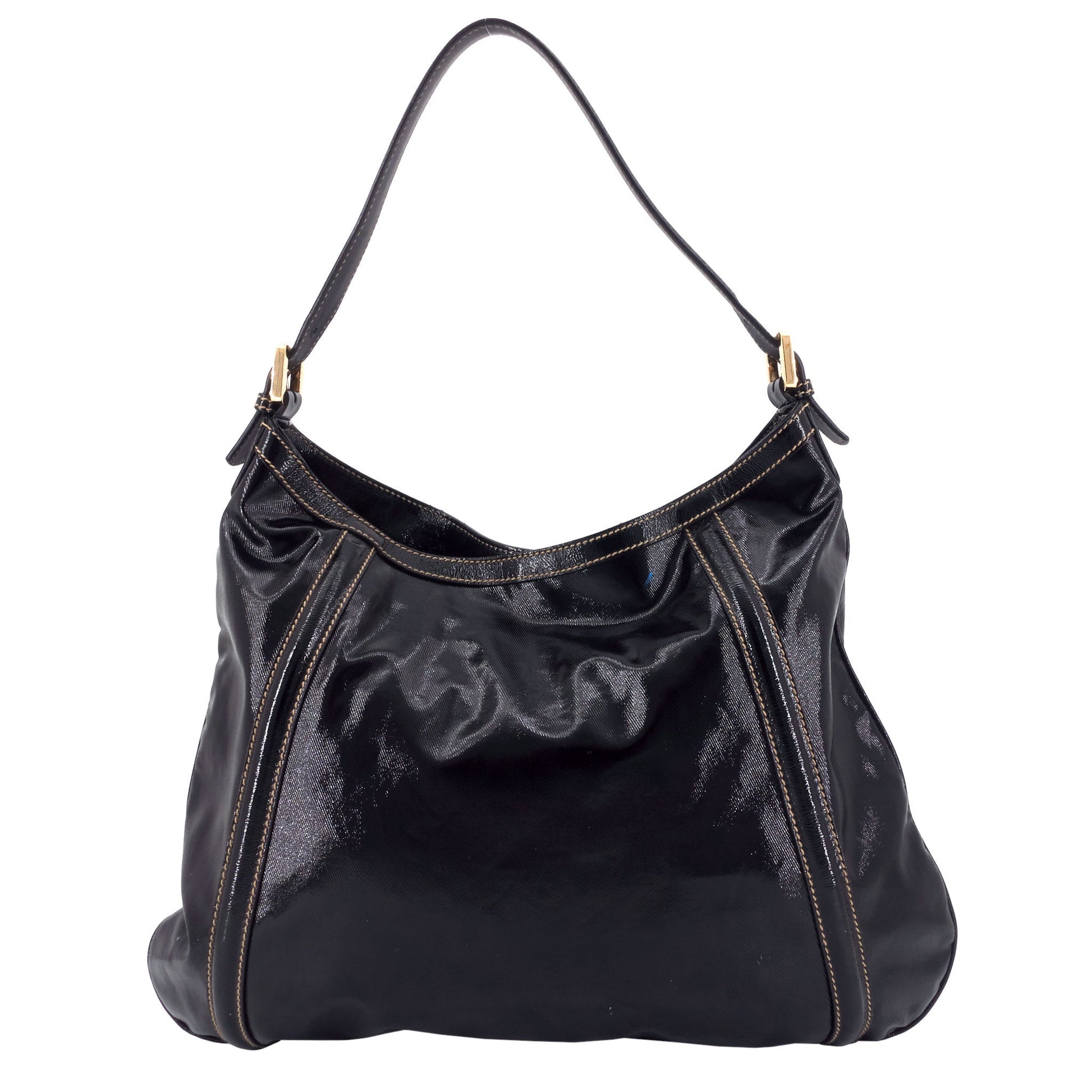 Gucci's iconic double-G logo takes center stage on this slim shoulder bag made from a shiny coated twill material known as dialux.