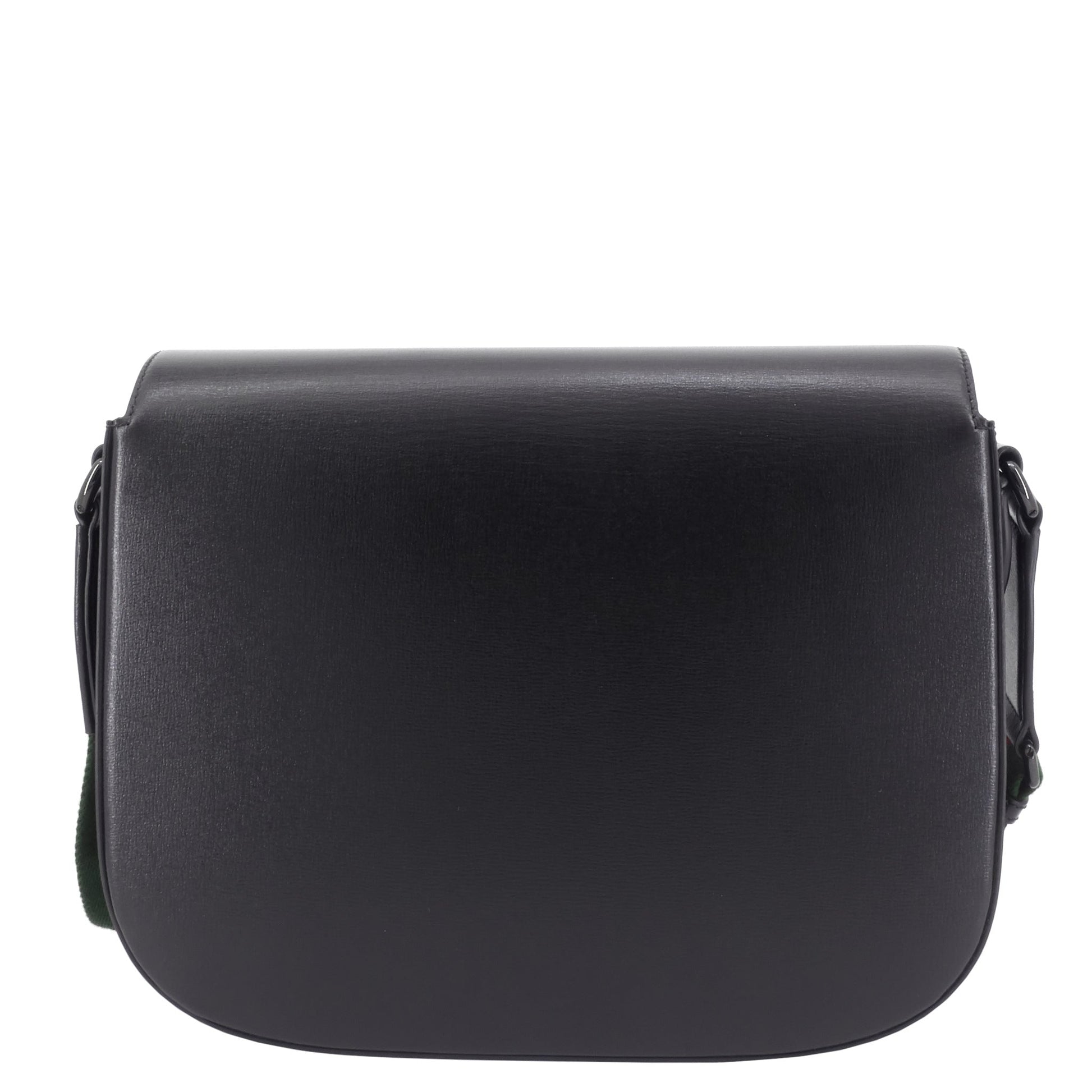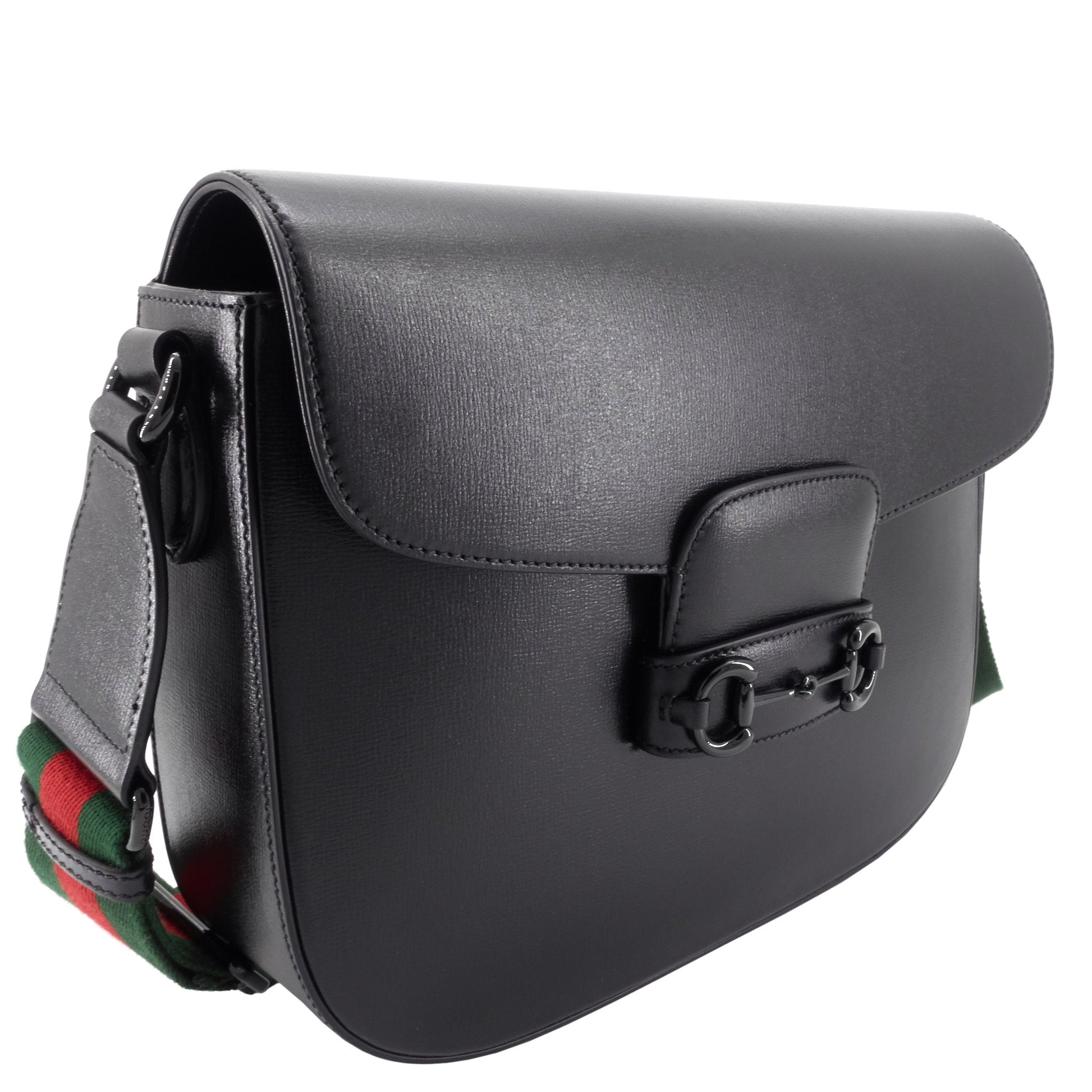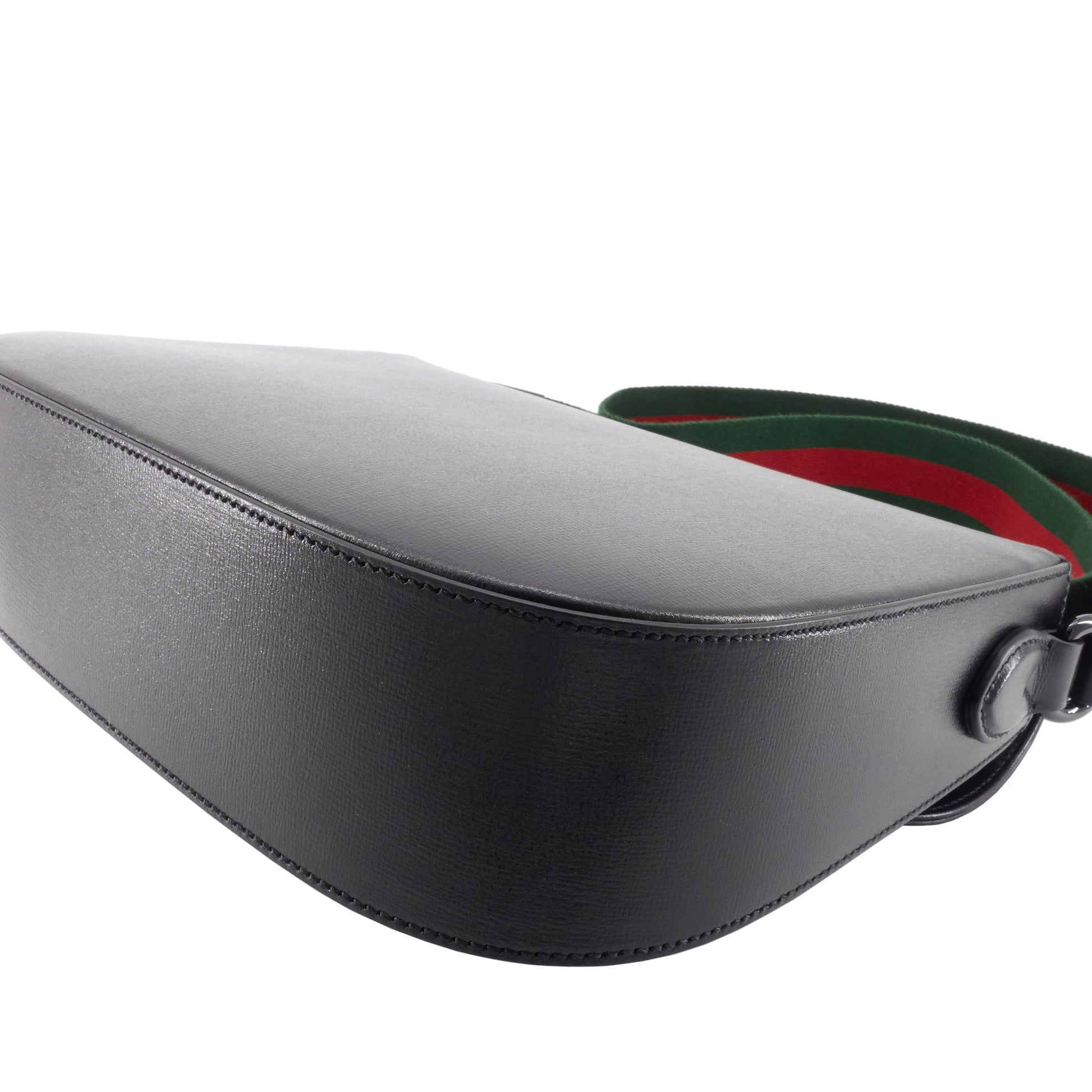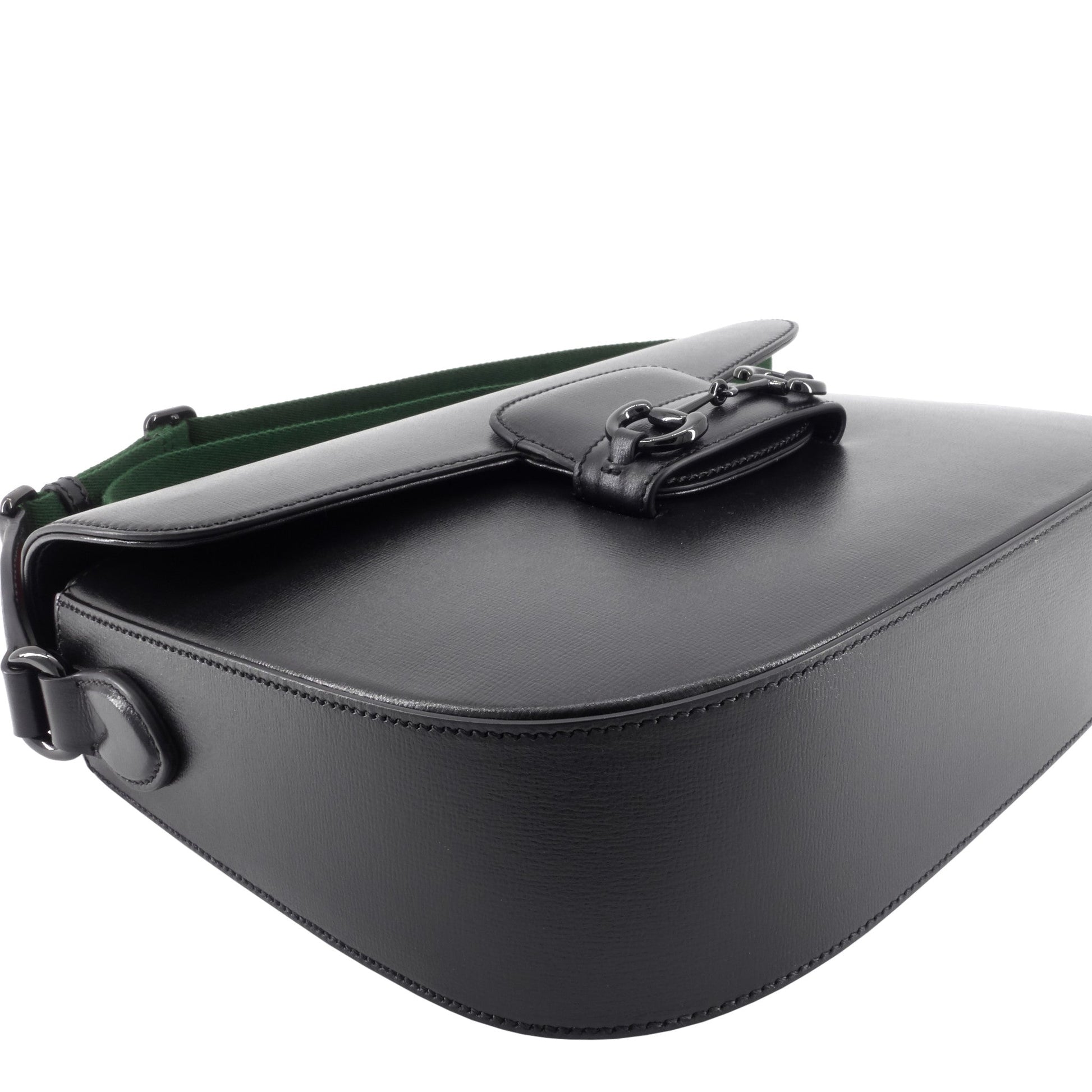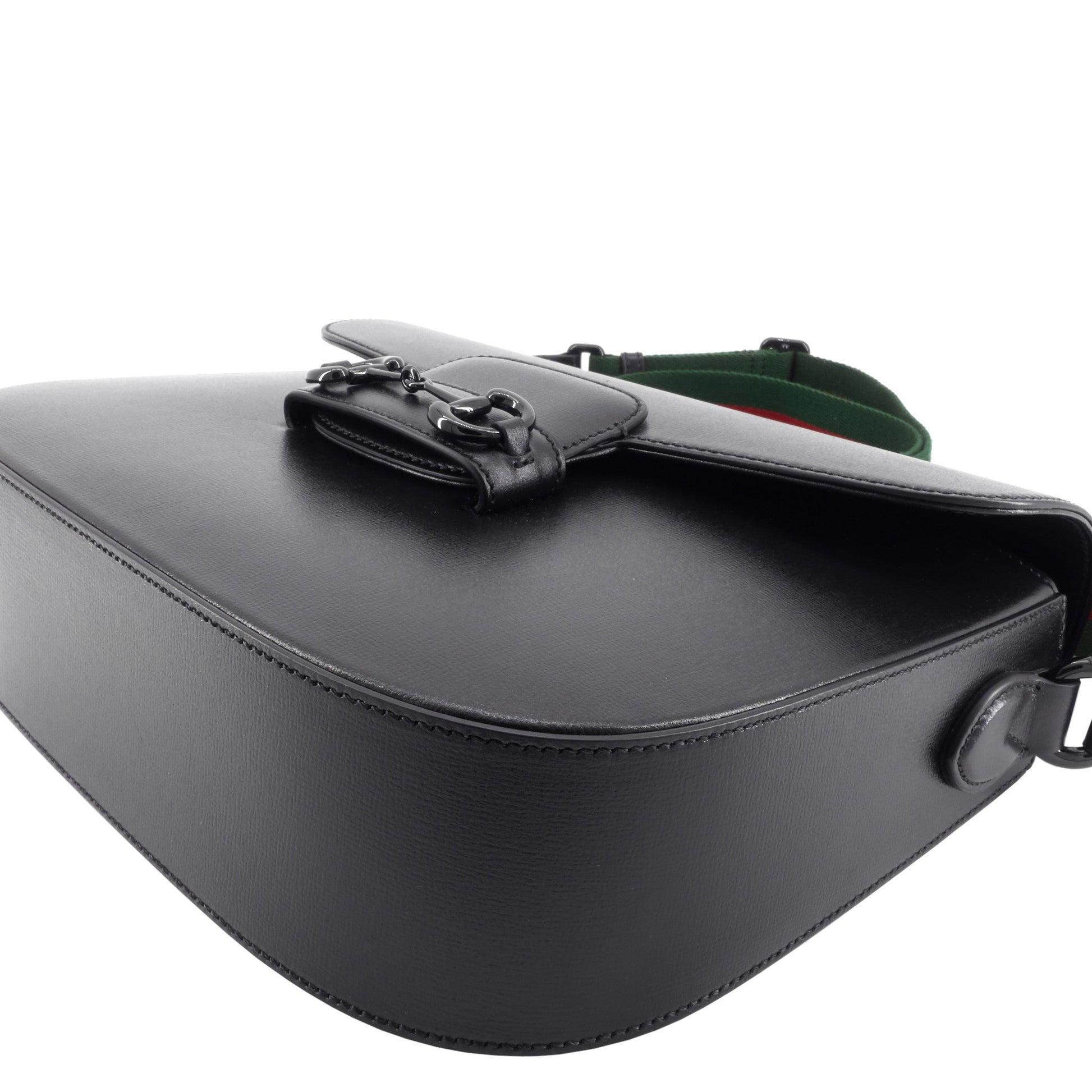 Gucci's iconic horsebit takes centre stage on a jet-black crossbody bag featuring a bold, contrasting green-and-red web strap that adds a pop of colour.