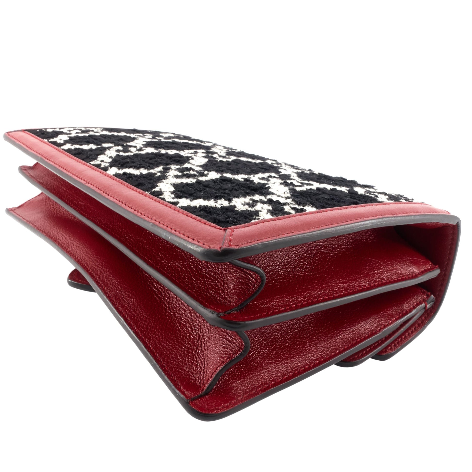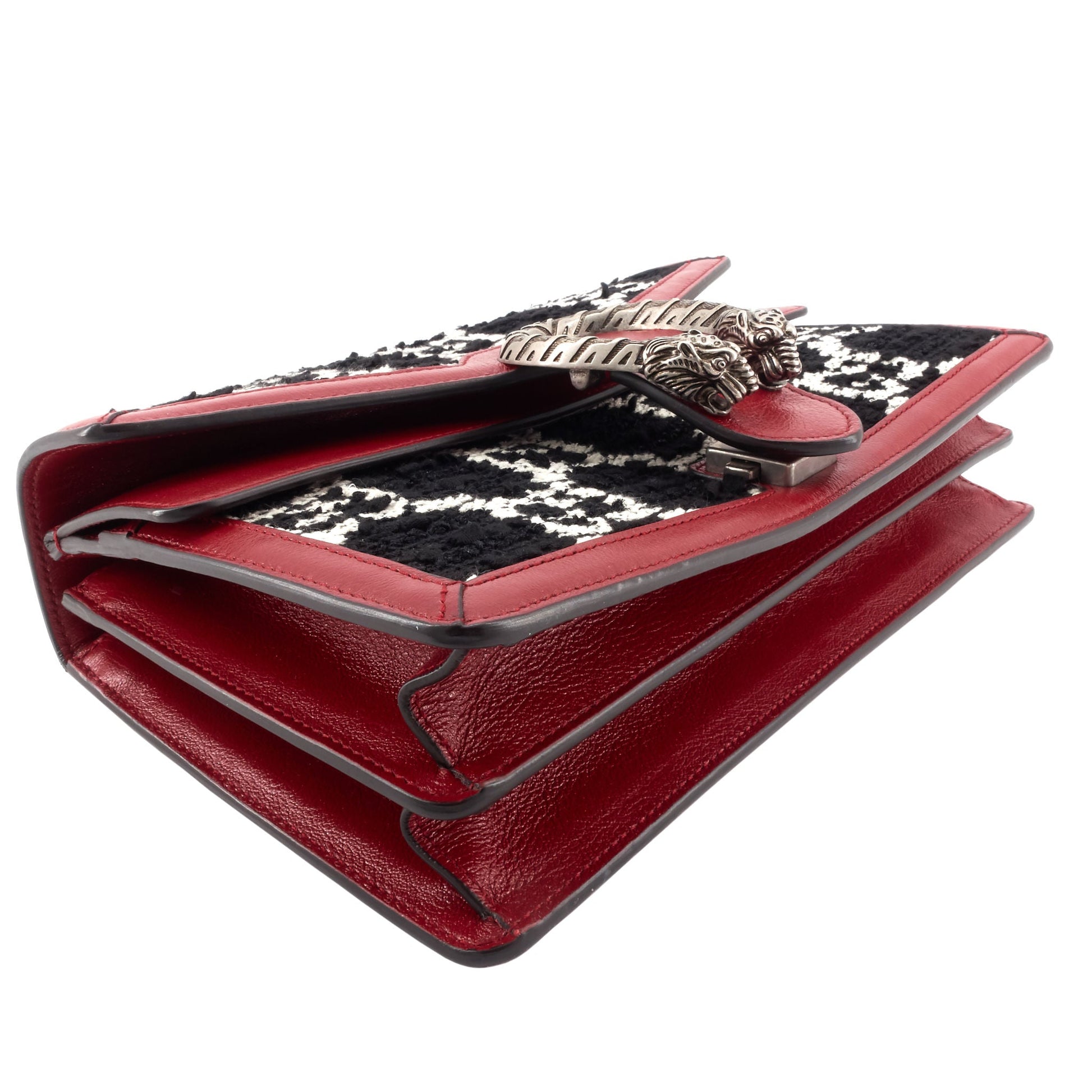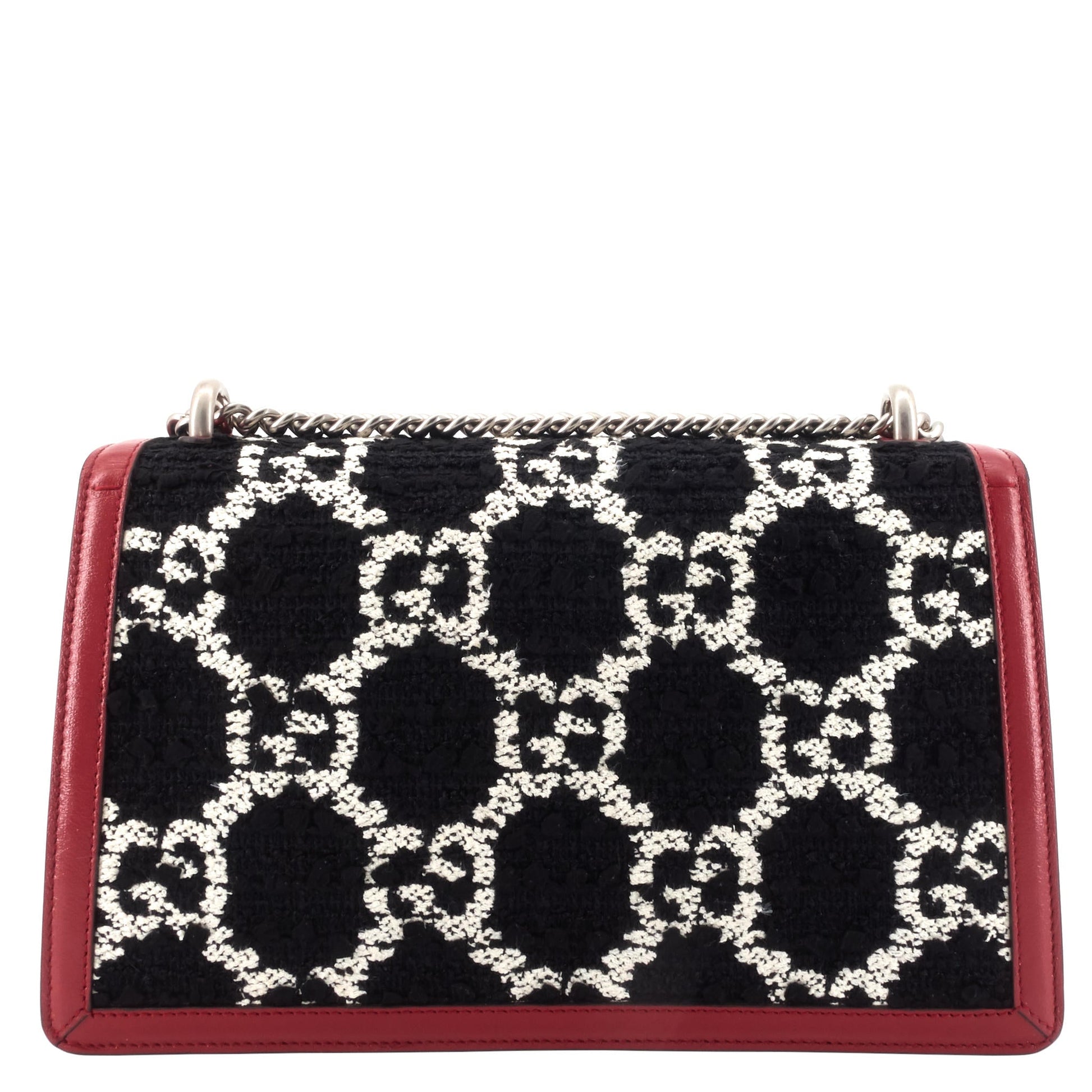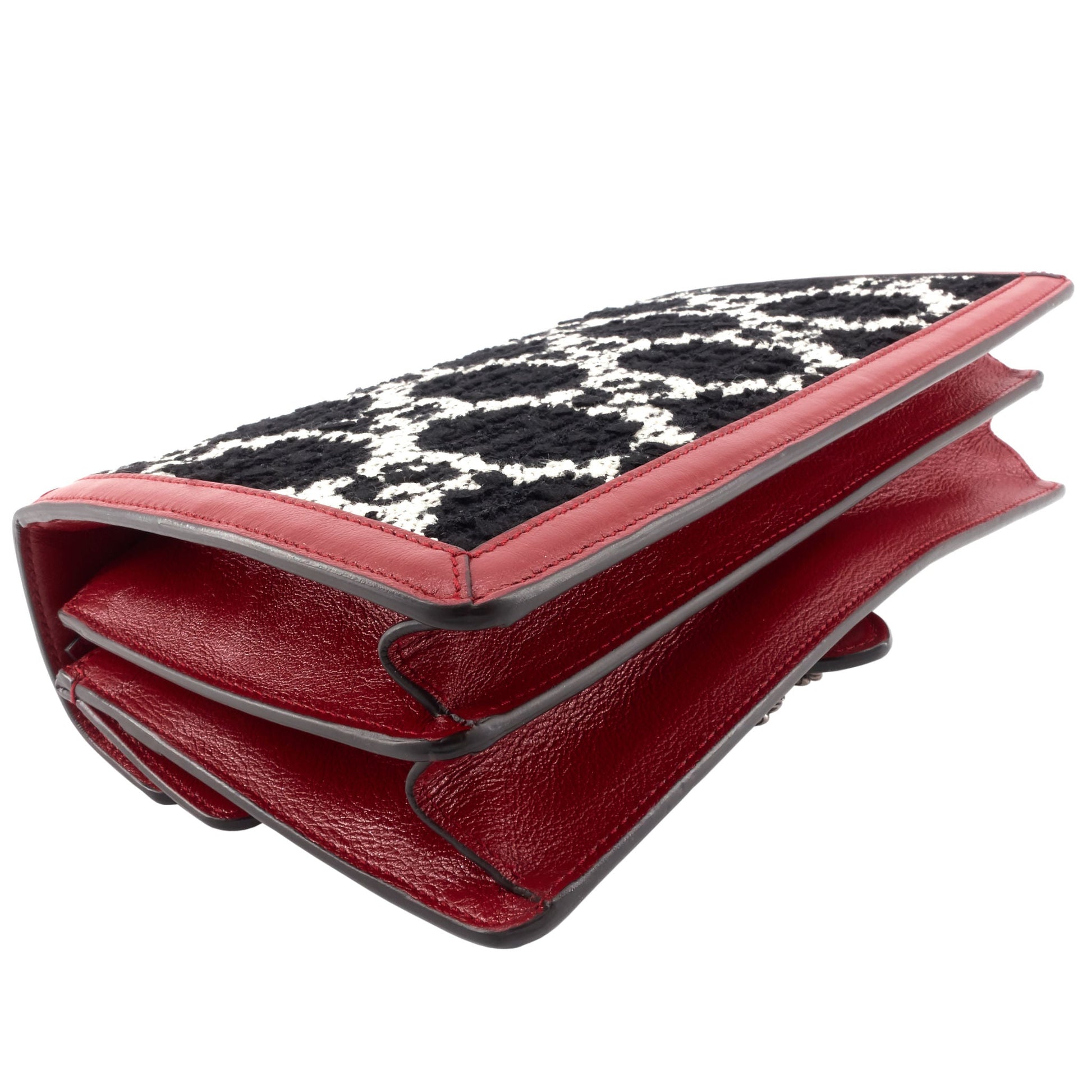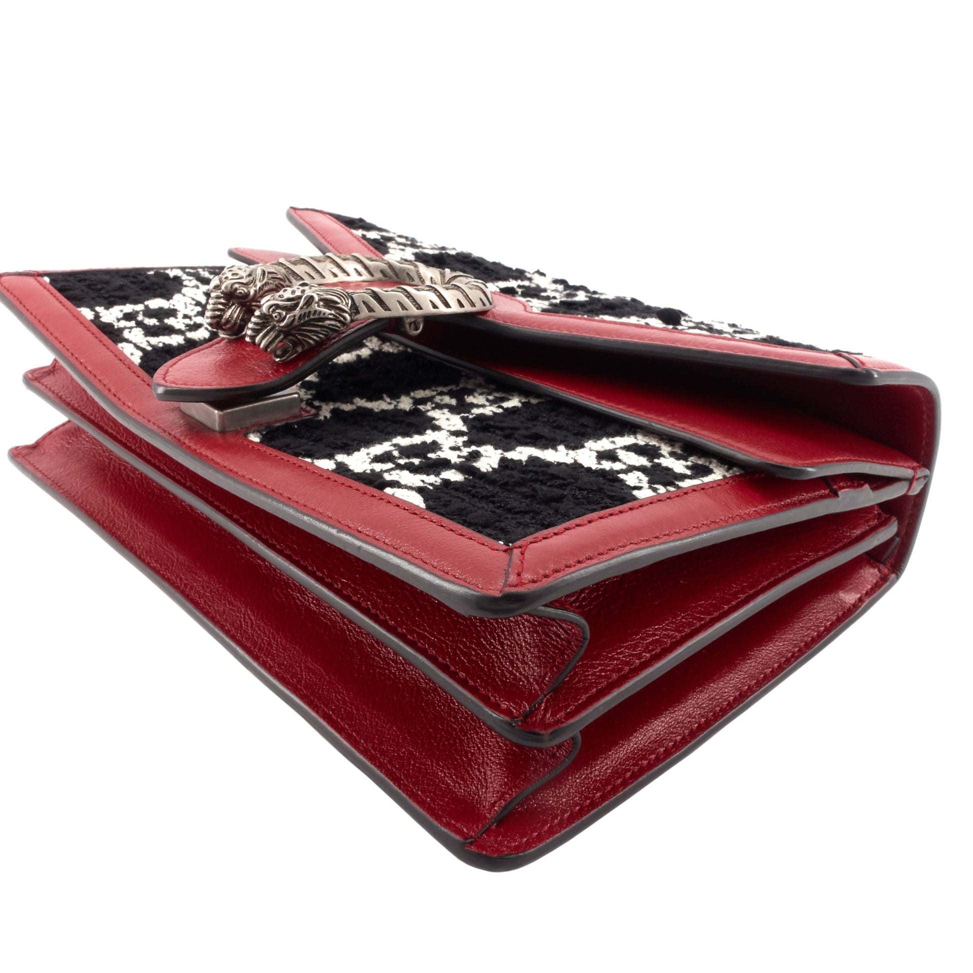 Two-tone tweed with Gucci's emblematic monogram motif details a leather-trimmed crossbody fitted with a two-headed tiger spur—a reference to the ancient Greek god Dionysus.