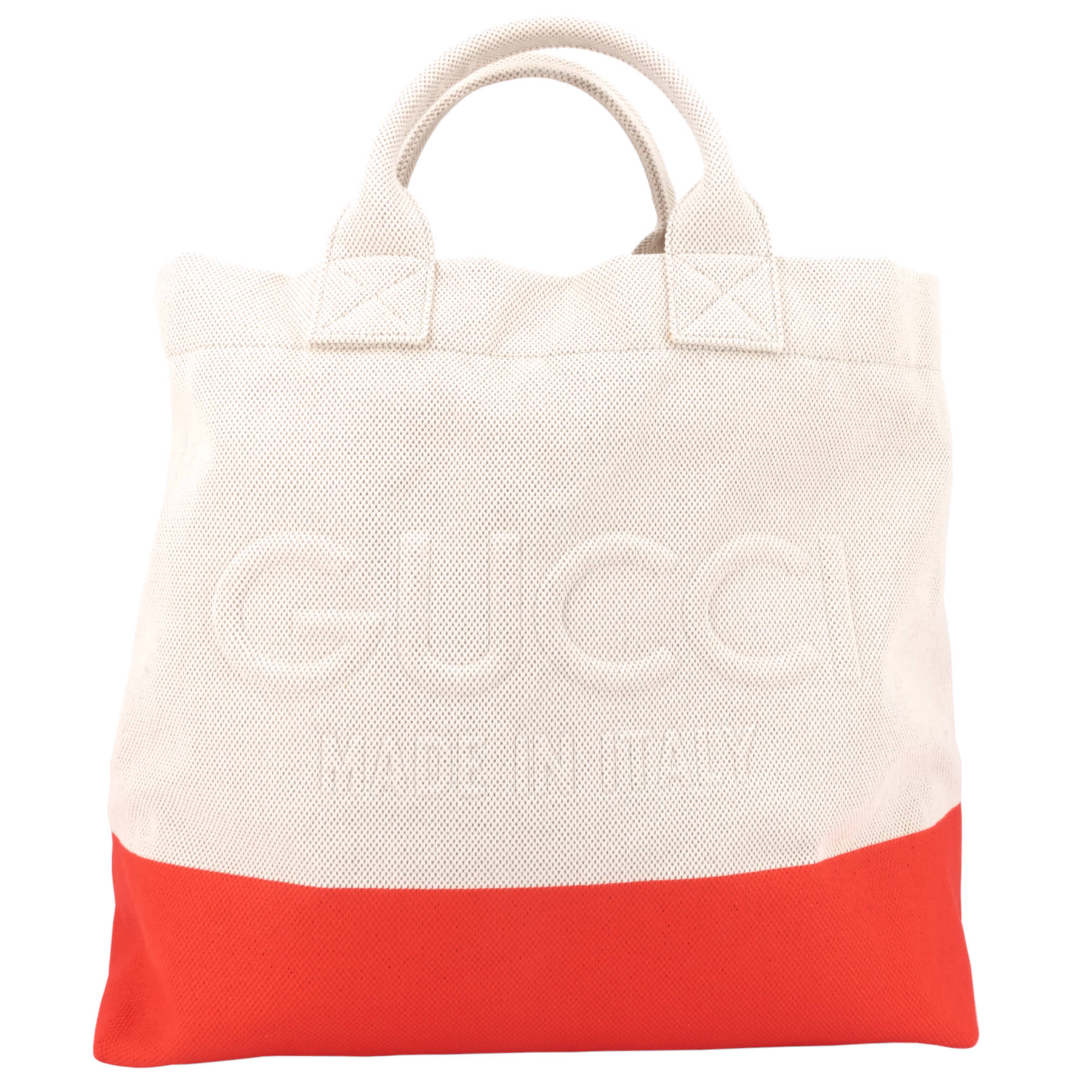 Drawing inspiration from the summer spirit and Italian beach clubs, this canvas tote bag features a relaxed silhouette and a natural texture that's perfect for warmer weather. An orange trim accents the base, and "Gucci Made in Italy" is subtly embossed on the front. Part of the Gucci Lido collection, it is designed with top-carry handles and shoulder straps for versatile carrying options.