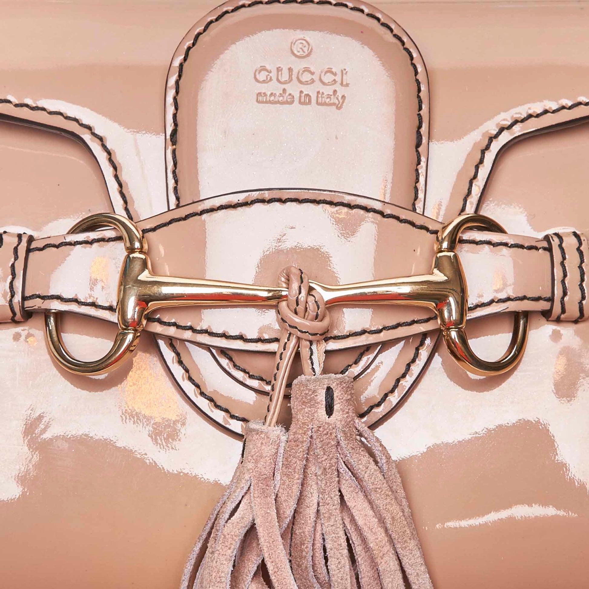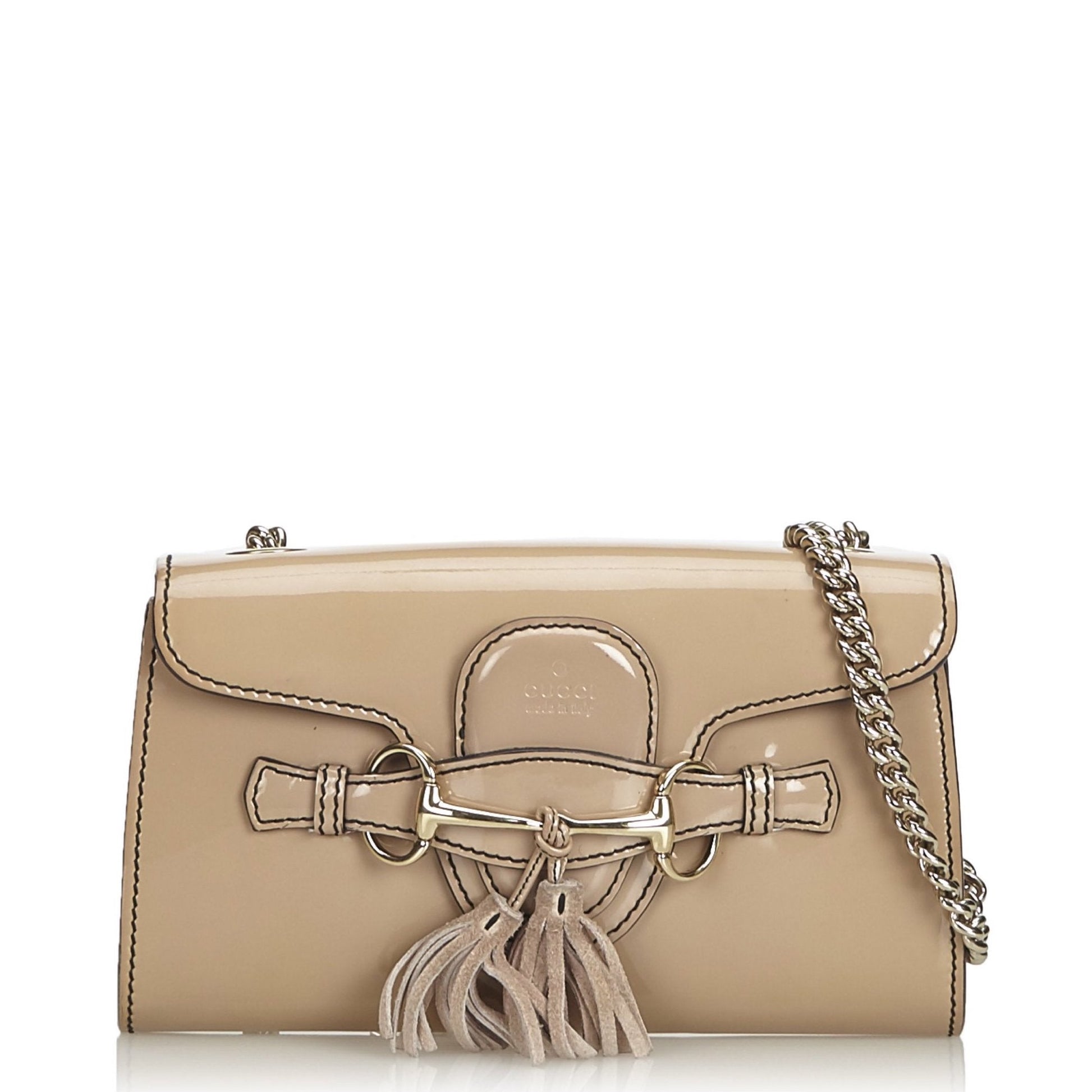 This authentic Gucci Emily bag is crafted of smooth patent leather in beige. It has a silver-tone chain strap, tassels suspended off the front horsebit detail, and a tucked front flap. It opens to a beige fabric interior with a slip pocket.�A modern classic, this is a gorgeous day or evening bag from Gucci.