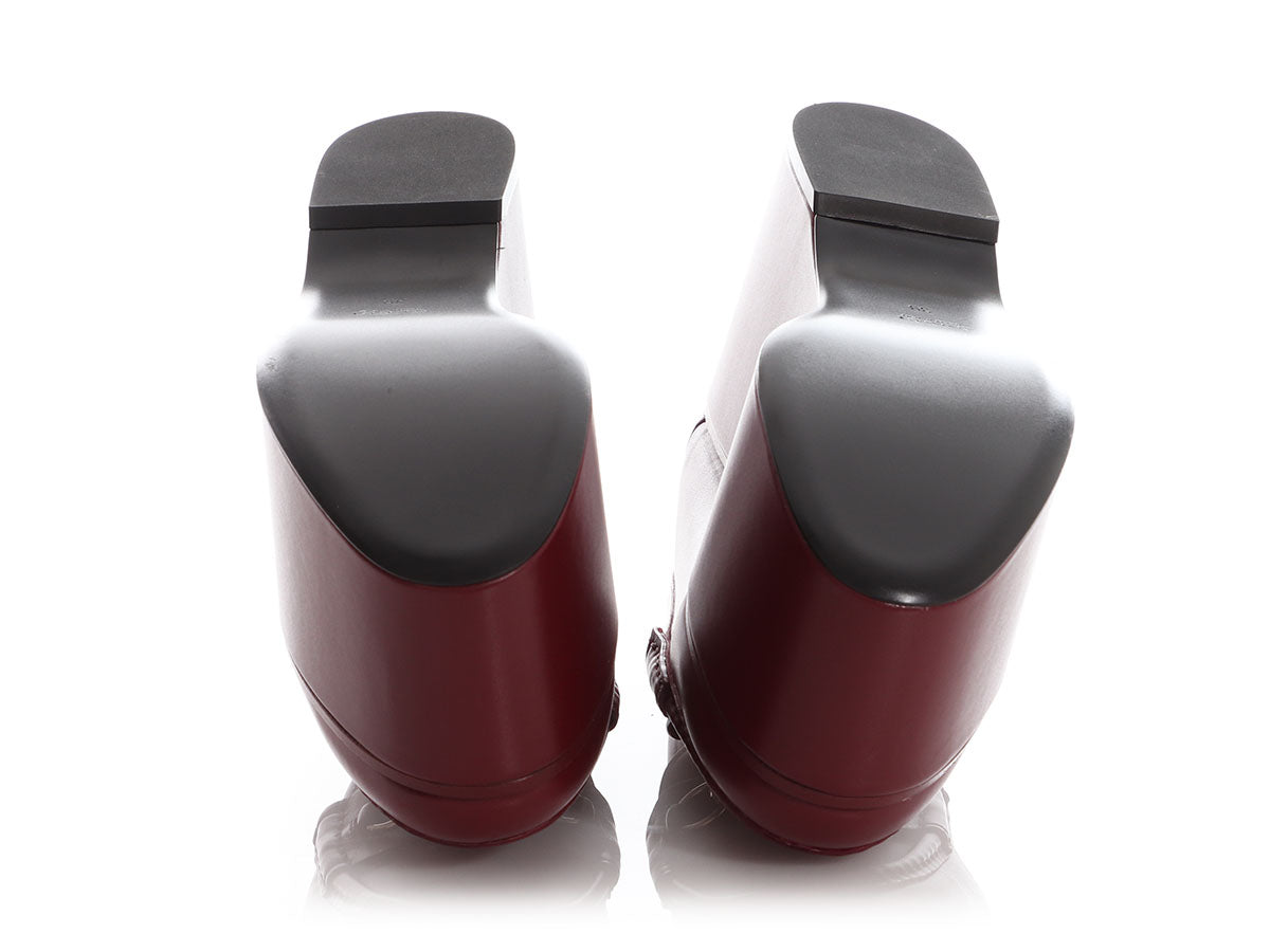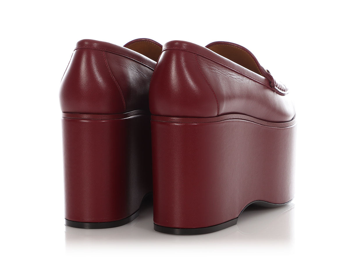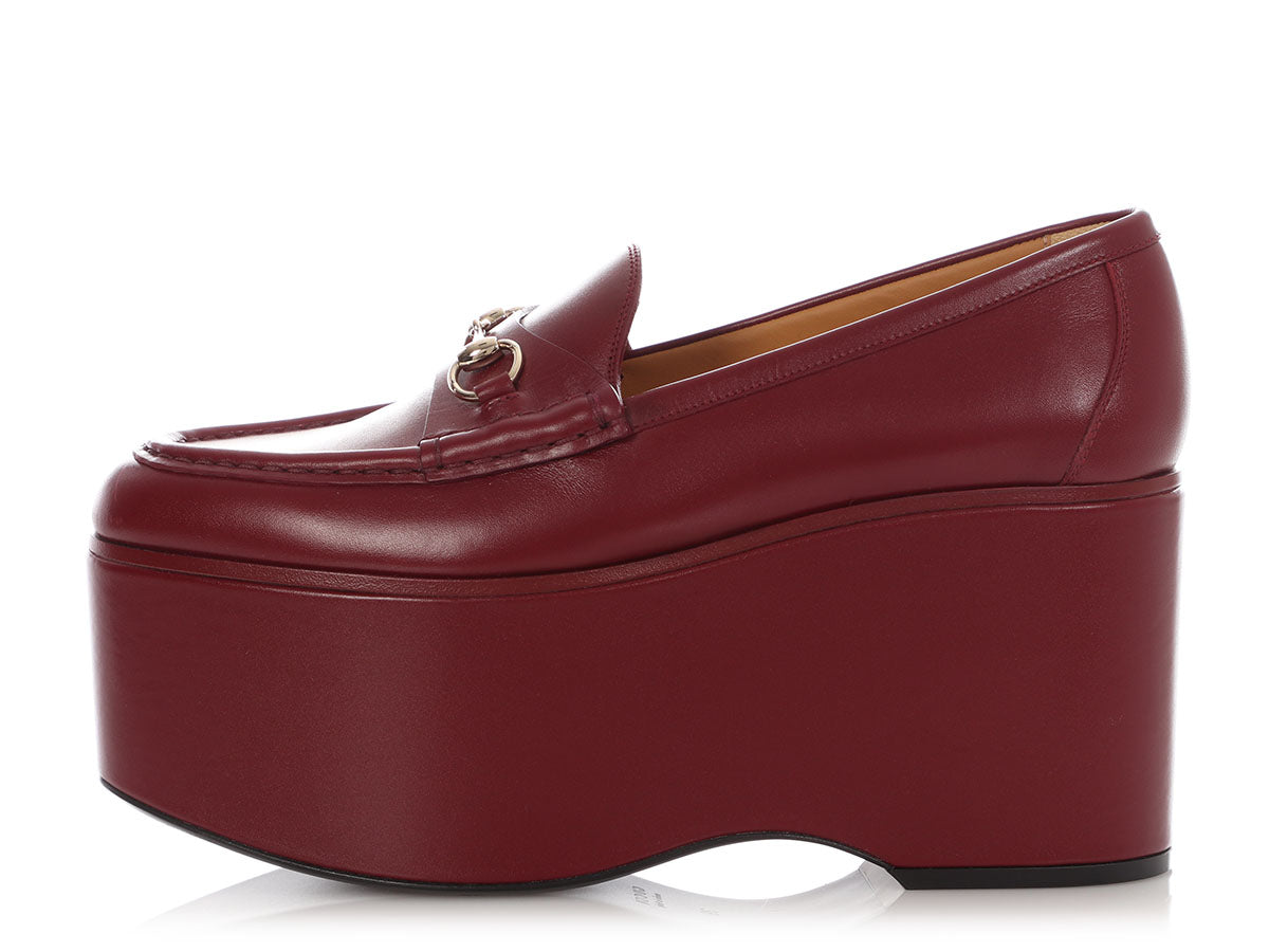 Gucci�s Oxblood Horsebit High Platform Loafers take a timeless silhouette and raise the bar�literally! Made from rich dark red leather with signature gold-tone horsebit hardware, they feature towering 3.75-inch platforms that give a funky, modern lift to the classic loafer design. In excellent condition with leather inners and soles, they�ve never been worn but have a few scratches and some stressing from storage. With their bold profile and iconic details, these lifted loafers are a standout!