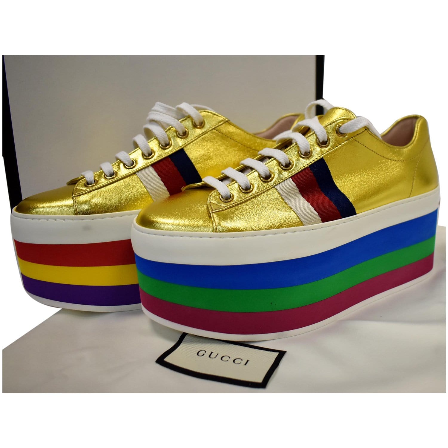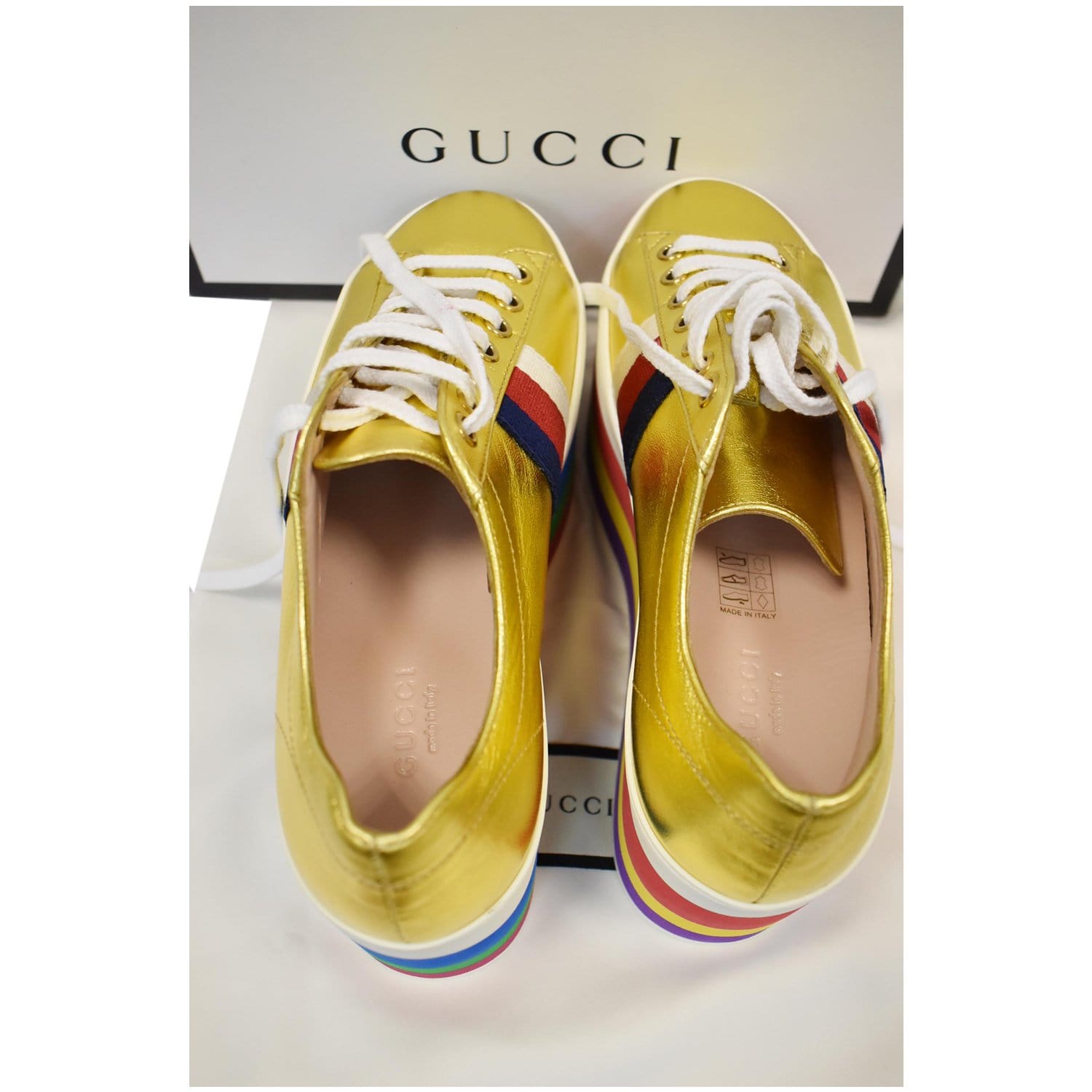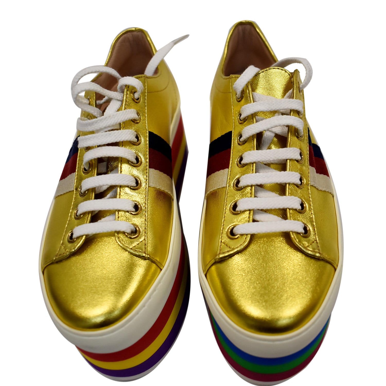 GUCCI Peggy Rainbow Metallic Nappa Silk Platform Sneakers Gold 474538 Size 36 - Final Sale