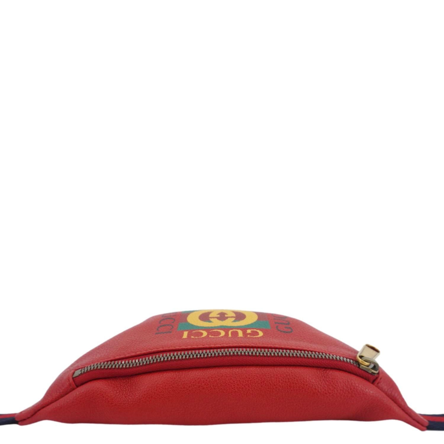 The GUCCI Print Small Leather Belt Bag in red features the classic Gucci logo print with a retro-inspired design. This versatile bum bag can be worn around the waist or crossbody, adding a bold pop of color and style to any casual look.