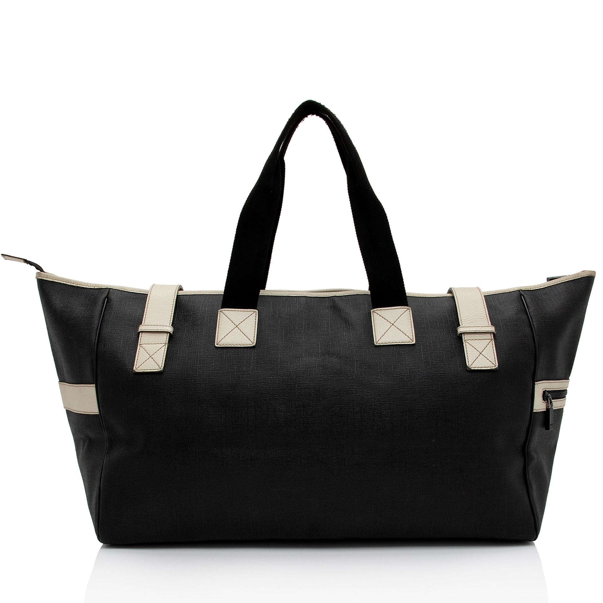 Condition Notes: Minor scuffs to exterior bottom corners. Light darkening and marks throughout exterior leather trim. Darkening and marks to exterior stitching on leather trim. Minor creasing throughout exterior. Cracking and wear throughout luggage tag. Tarnishing to hardware. Light marks and wear throughout interior.