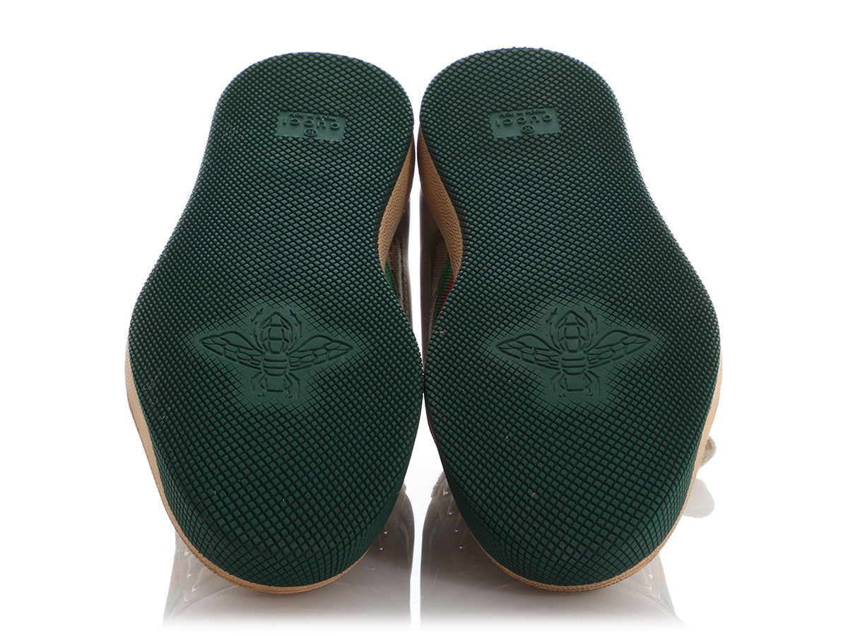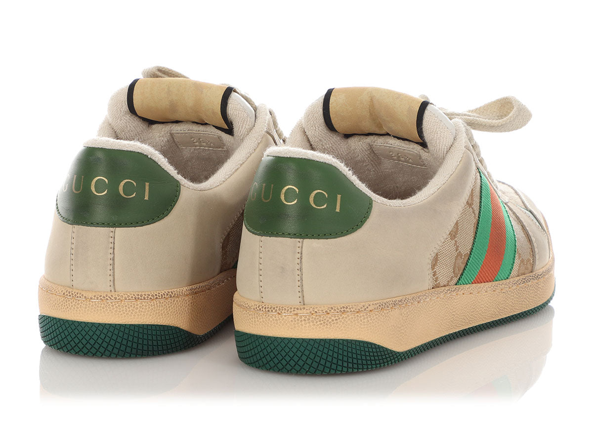 Bring a laid-back look to high fashion with Gucci’s Sand and Vintage Green Screener Sneakers! Made of a combo of GG canvas, green leather, and beige nubuck, they’re lace-up trainers with leather inners and rubber soles. In excellent condition with a box, two dustbags, and extra laces, they are distressed by design and haven’t been worn but have a bit of stressing from being tried on. With logos on the backs of the heels, these are some cool, casual kicks!