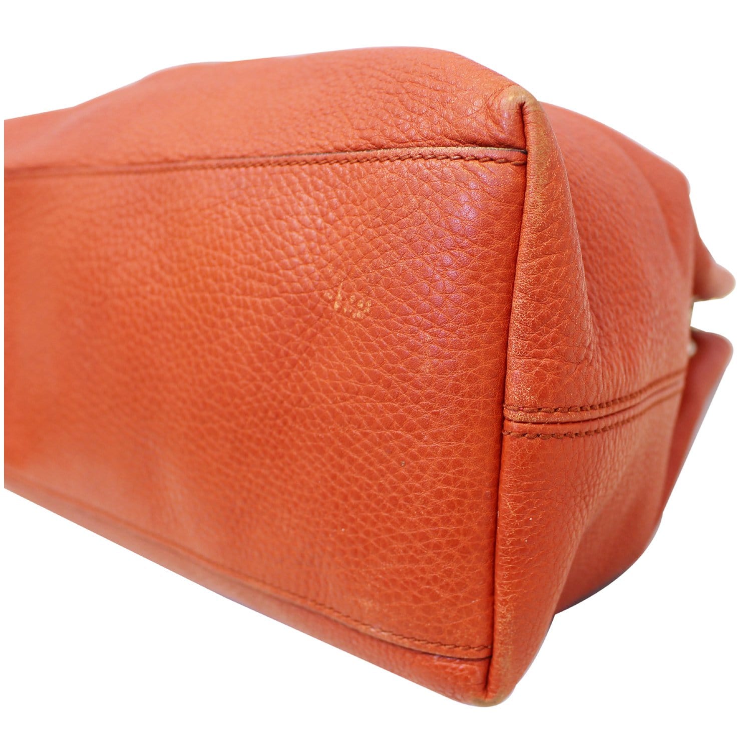 Gucci Red Pebbled Calfskin Leather Soho Chain Tote Bag features the iconic bold GG logo embroidered on the front.