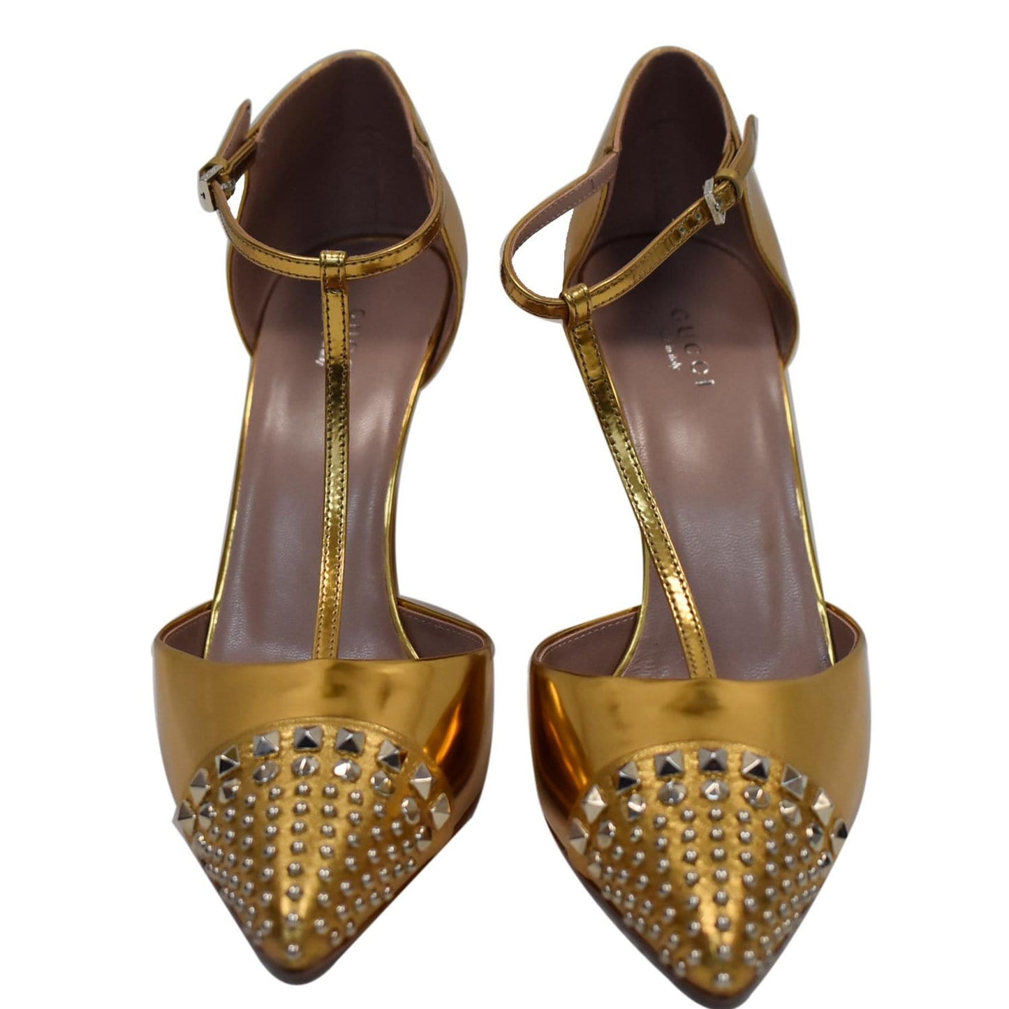 GUCCI Studded T-Strap Metallic Leather Heel Pumps Gold Size 39 1/2