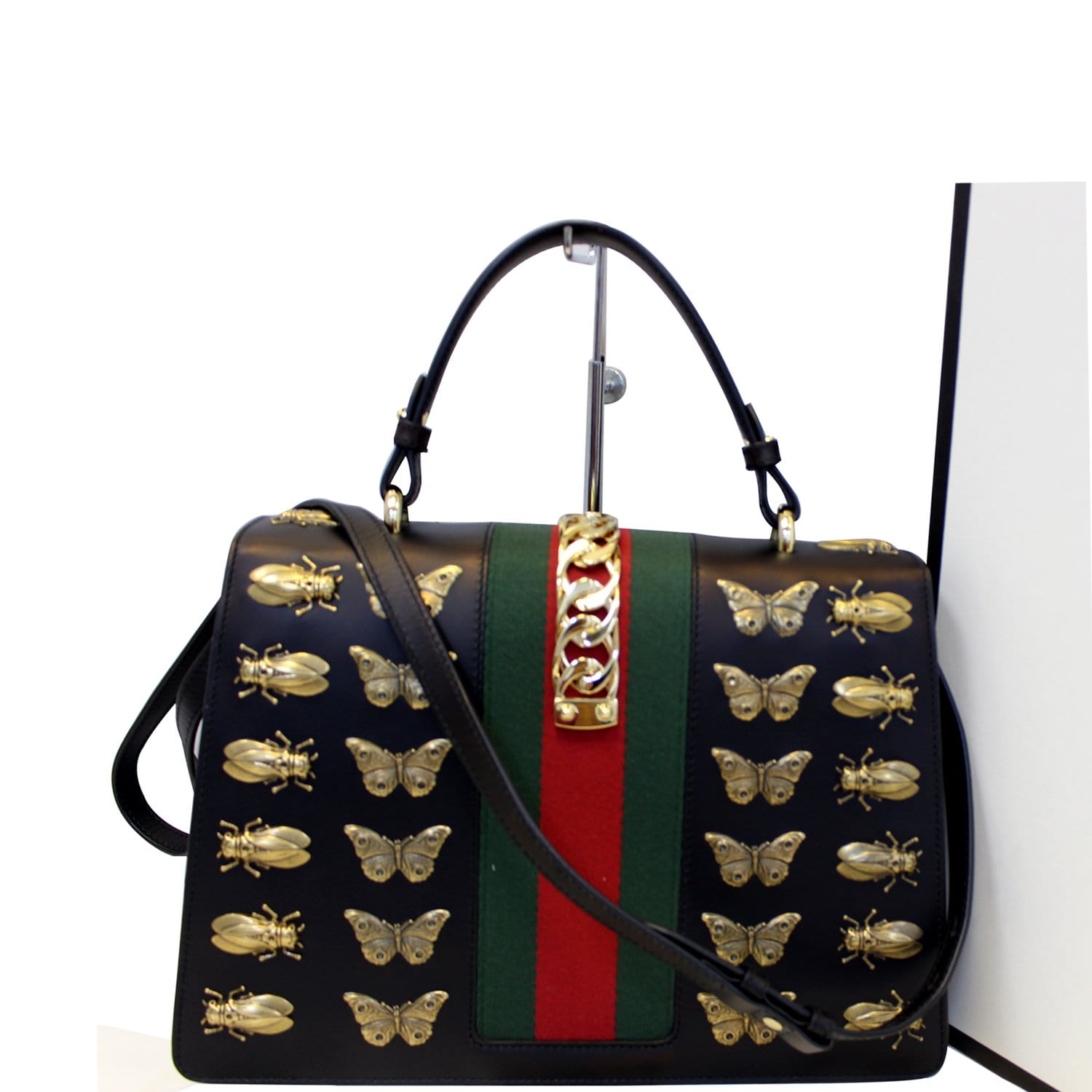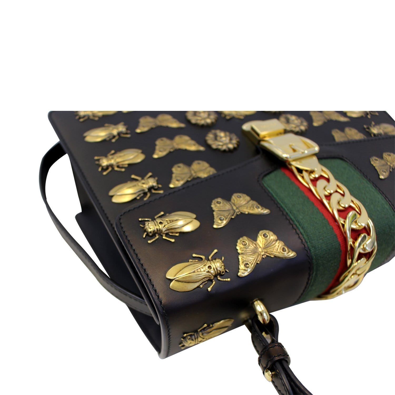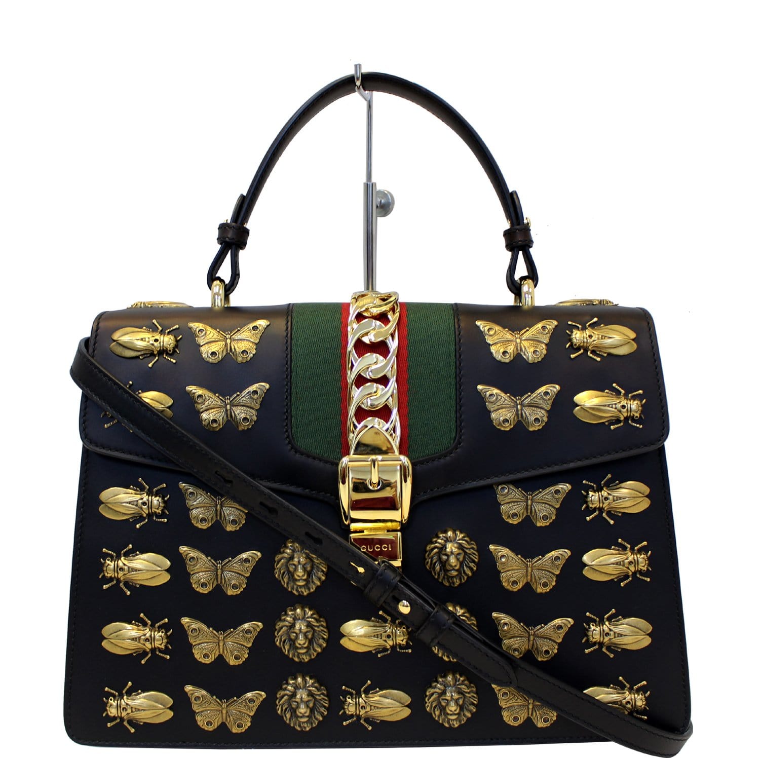 GUCCI Sylvie Animal Studs Calfskin Medium Top Handle Bag Black