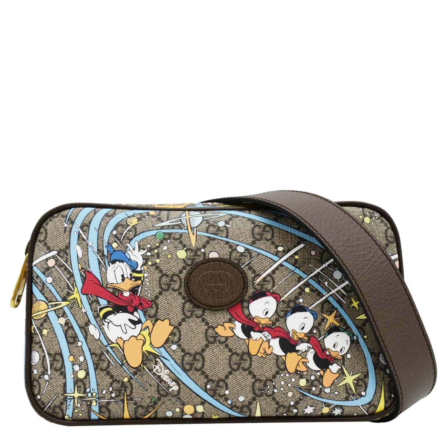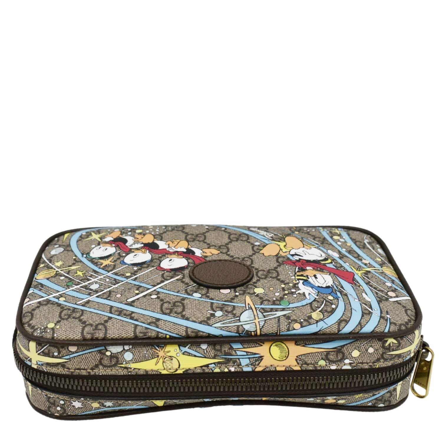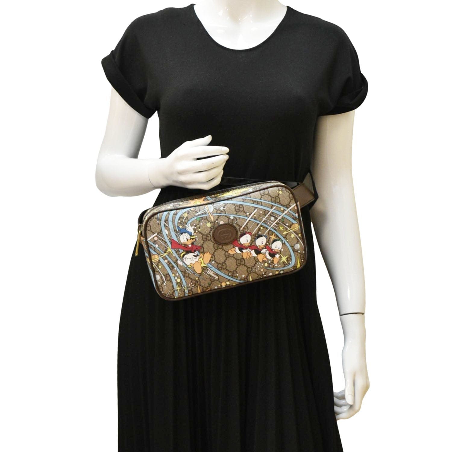 The GUCCI x Disney GG Supreme Canvas Belt Bag in Beige features the iconic GG Supreme canvas with playful Disney motifs. This versatile bag includes an adjustable belt strap and multiple compartments for practical, stylish wear.