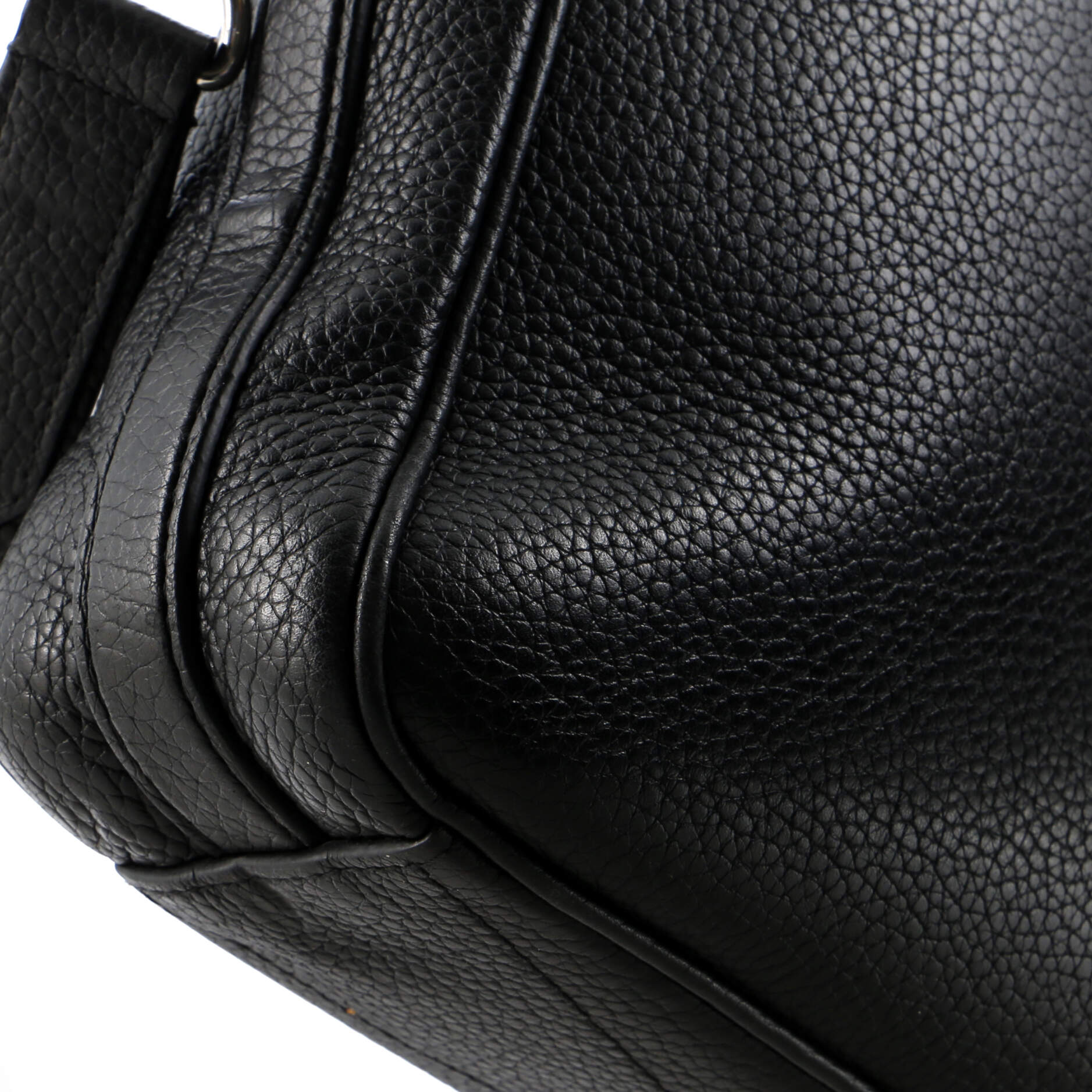 Condition: Very good. Creasing, wear, minor scuffs and marks on exterior and strap, moderate wear on base corners and handles, loss of shape on front handle. Cracking on handle and strap base trim wax edges, wear and minor marks in interior, scratches and slight tarnish on hardware.
