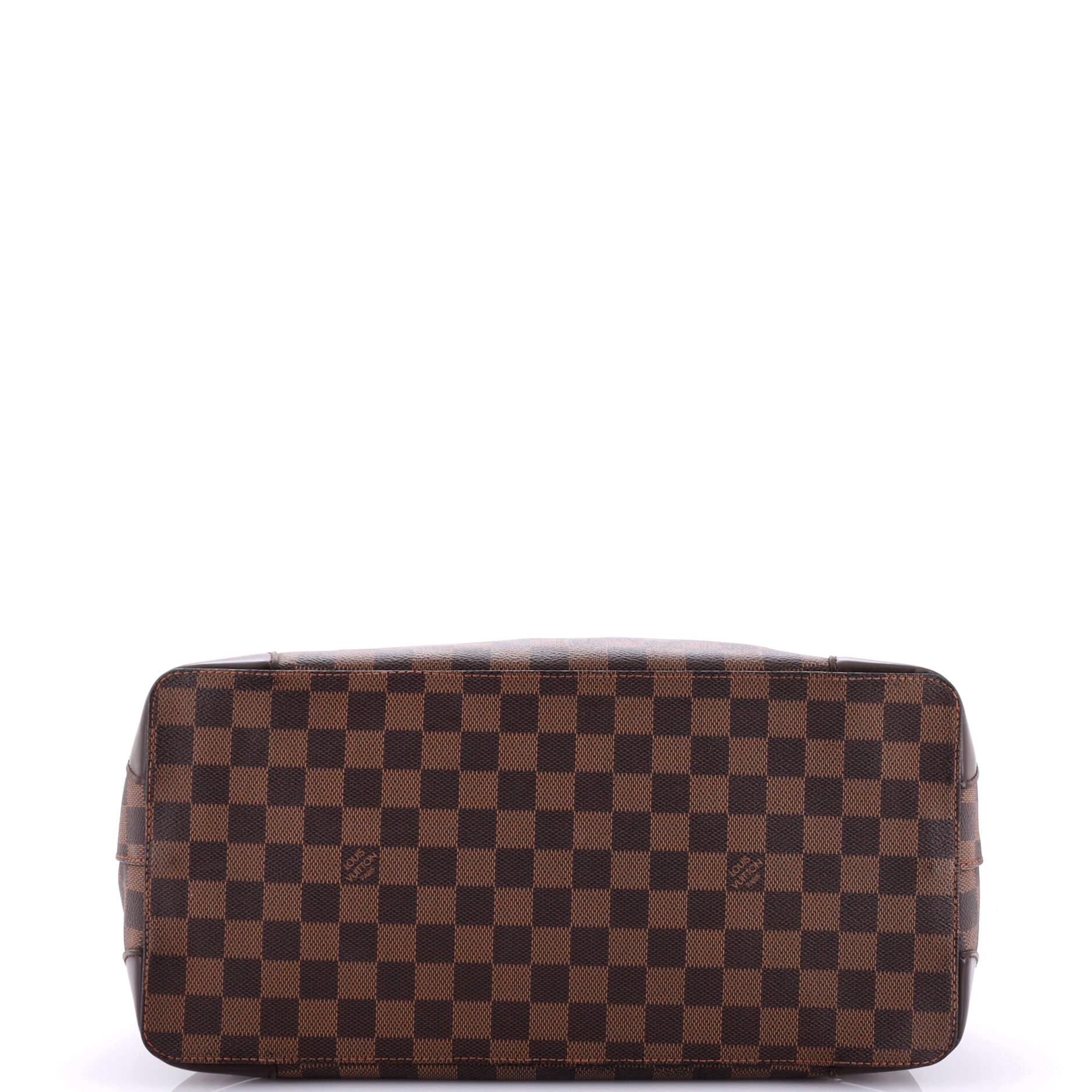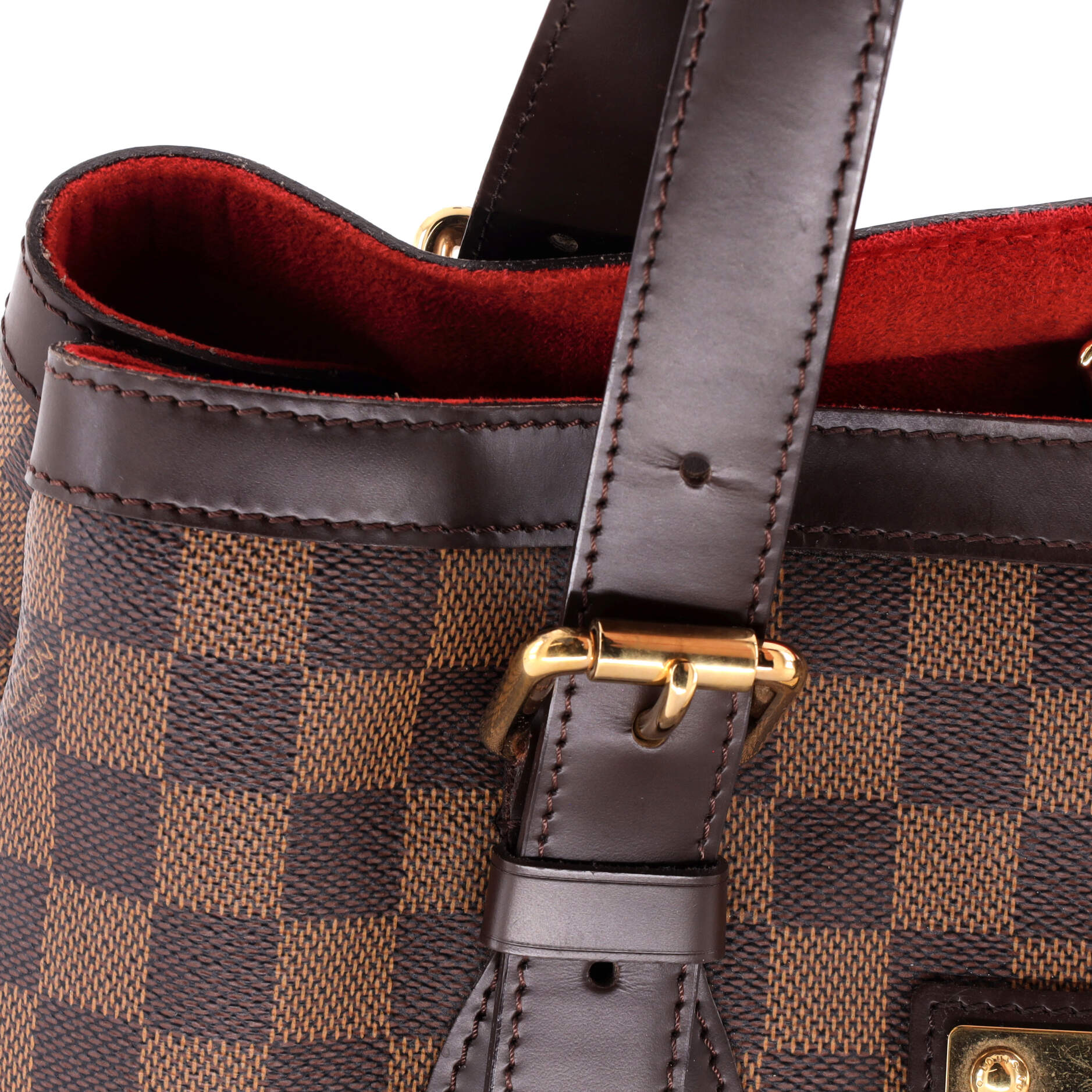 Condition: Very good. Odor in interior. Creasing on exterior, wear and darkening on base corners, moderate wear and scuffs on leather trims and handles. Wear and marks in interior, scratches and tarnish on hardware.