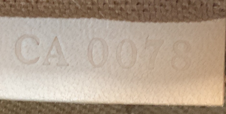 Condition: Very good. Minor creasing on exterior, darkening, wear, slight cracking, scuffs and watermarks on leather trims and straps, wear and marks in interior, scratches on hardware.