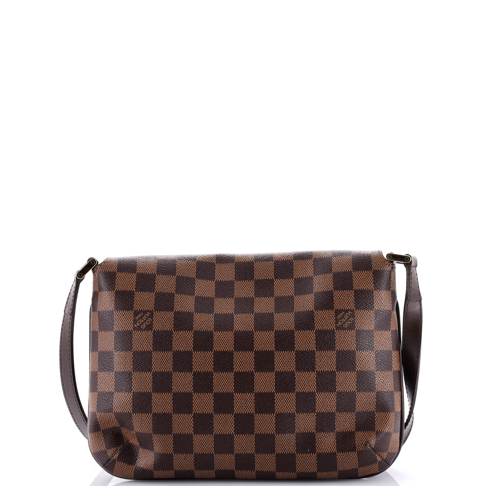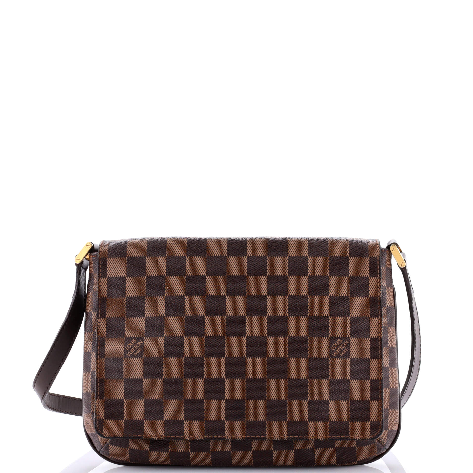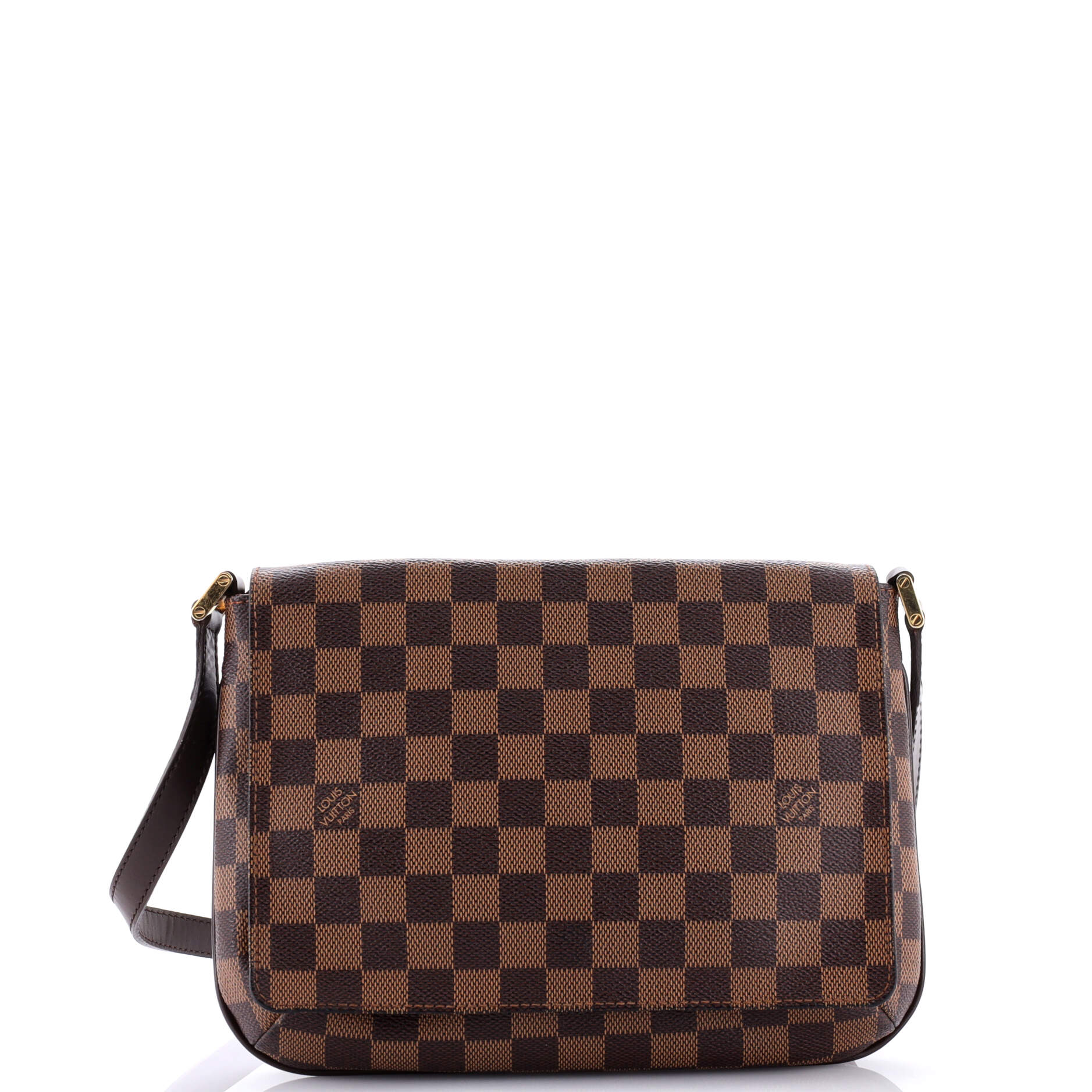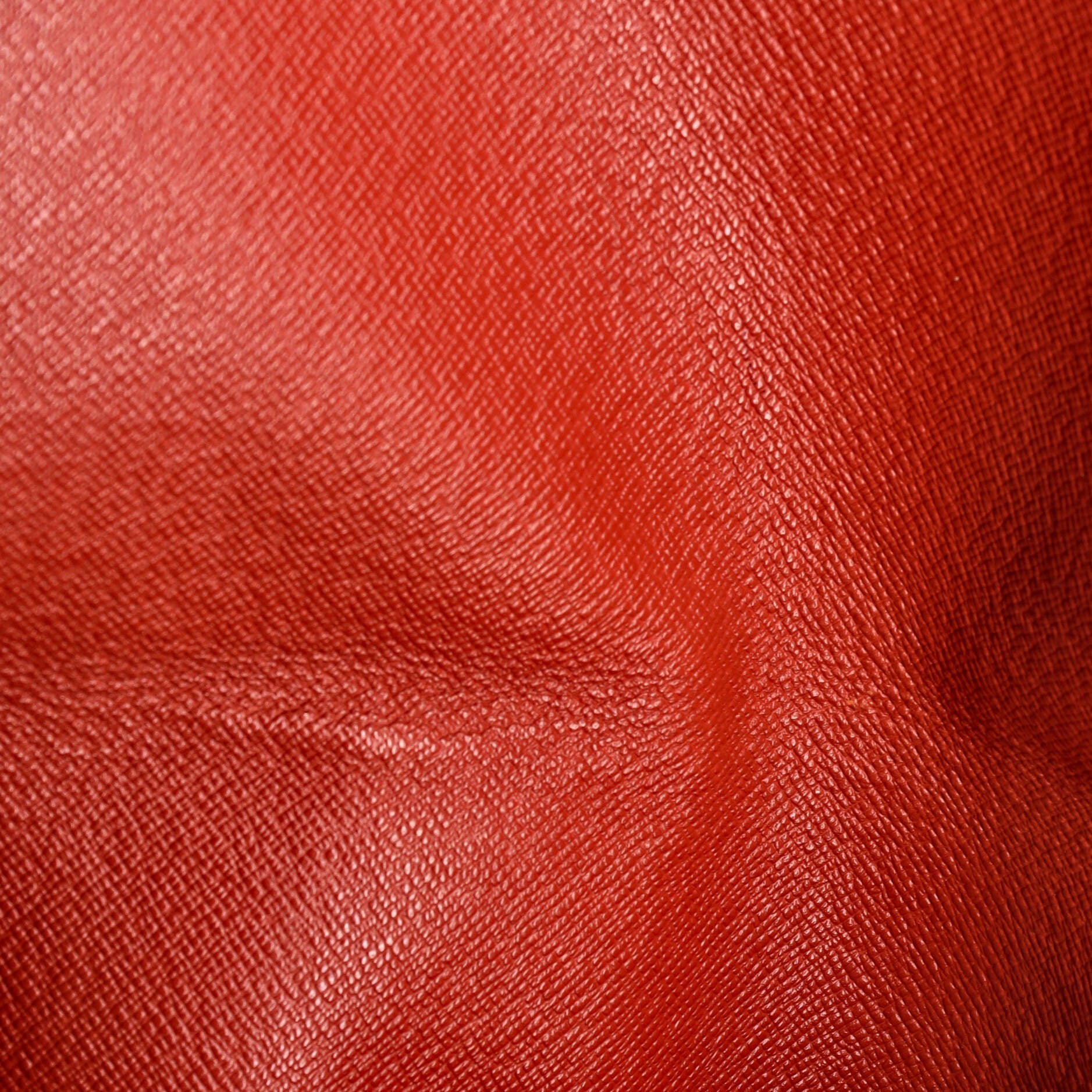 Condition: Very good. Odor throughout. Creasing on exterior and underneath flap, moderate darkening and wear on base corners and flap edges. Cracking on flap opening corners, creasing, wear and scuffs on leather trims and strap. Wear and darkening in interior, scratches and discoloration on hardware.