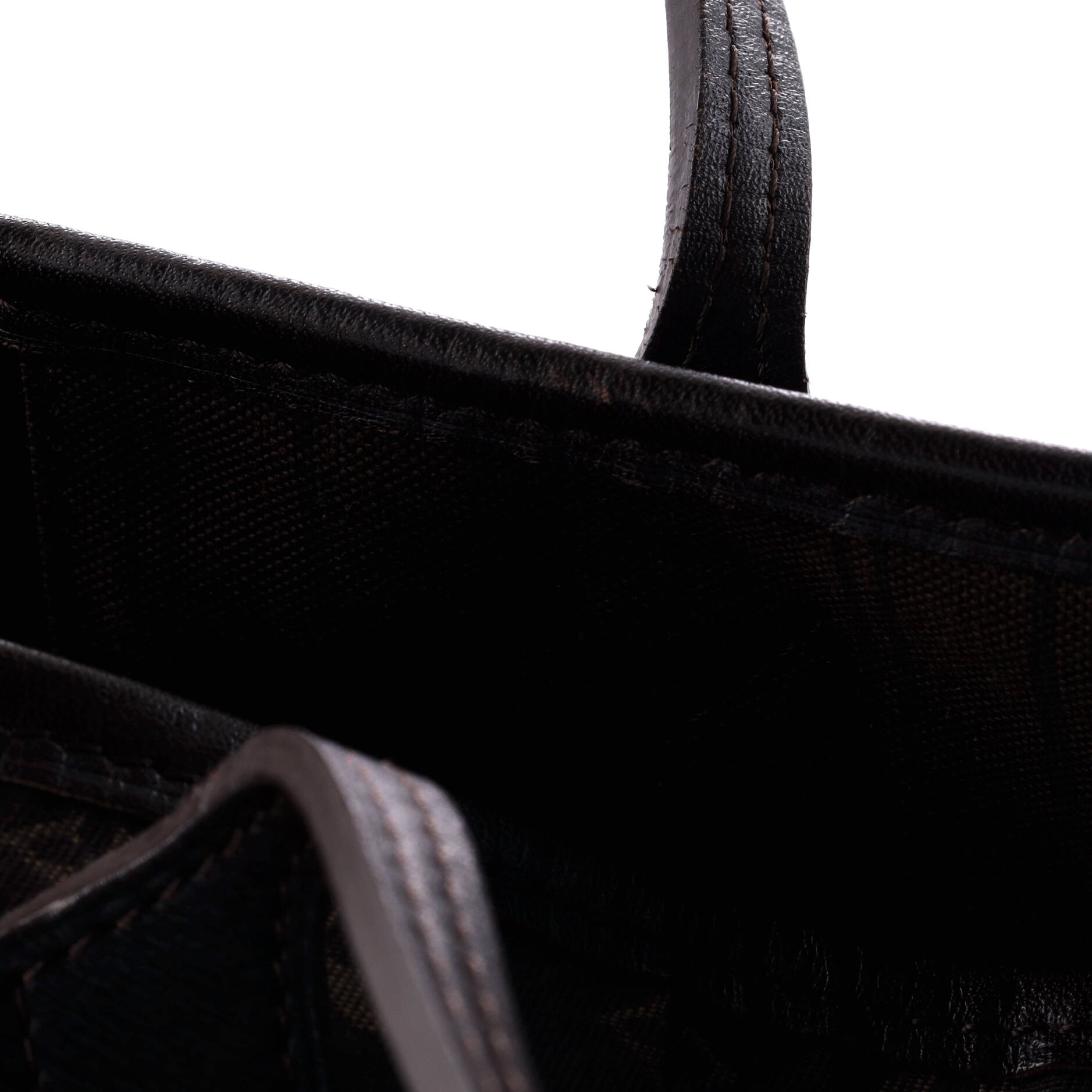 Condition: Very good. Creasing and wear on exterior and handles, threadbare and discoloration on base edges. Cracking on handle base wax edges, minor wear in interior, scratches on hardware.