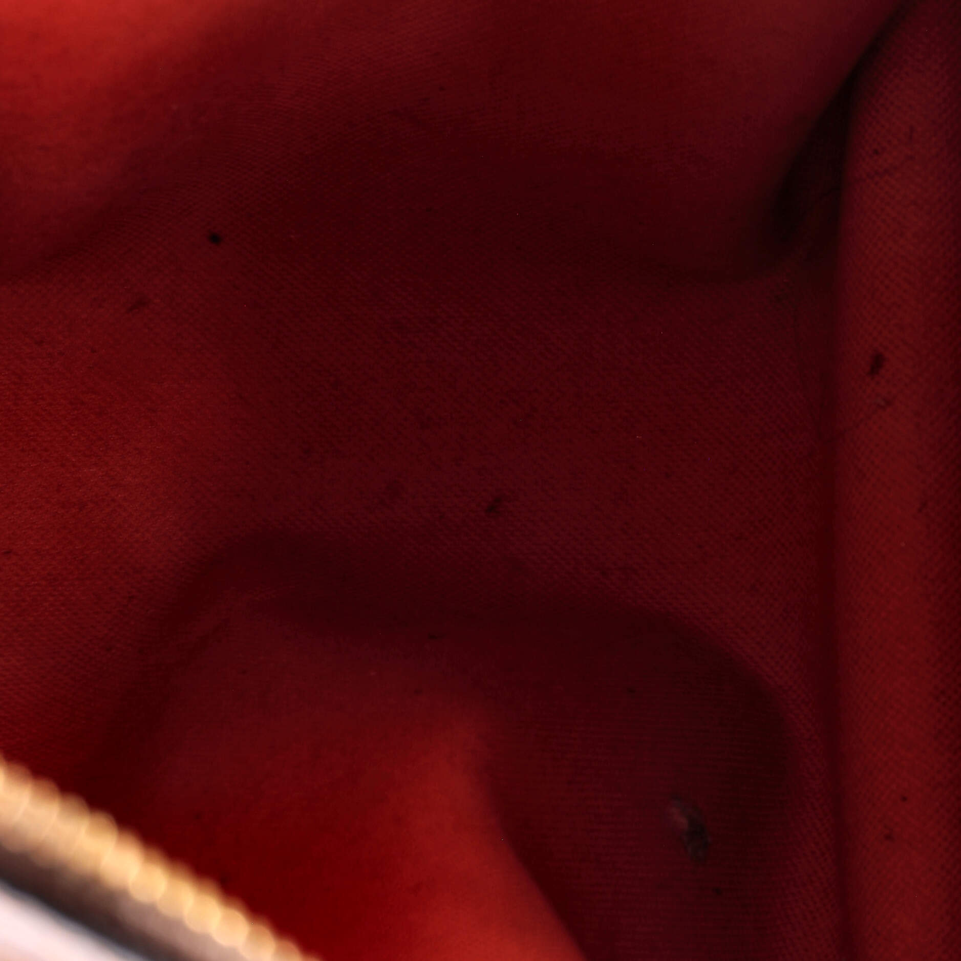 Condition: Good. Odor in interior. Moderate wear on exterior edges, scuffs and wear on leather trims, handles and strap, bubbling on strap. Wear, darkening, small stains and glitter in interior, scratches, discoloration and tarnish on hardware.