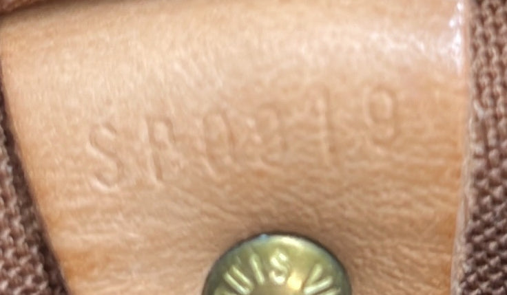 Condition: Good. Small nicks on handles. Odor in interior. Creasing on exterior, moderate darkening, scuffs, watermarks and wear on leather trims and handles, scratches and heavy tarnish on hardware.