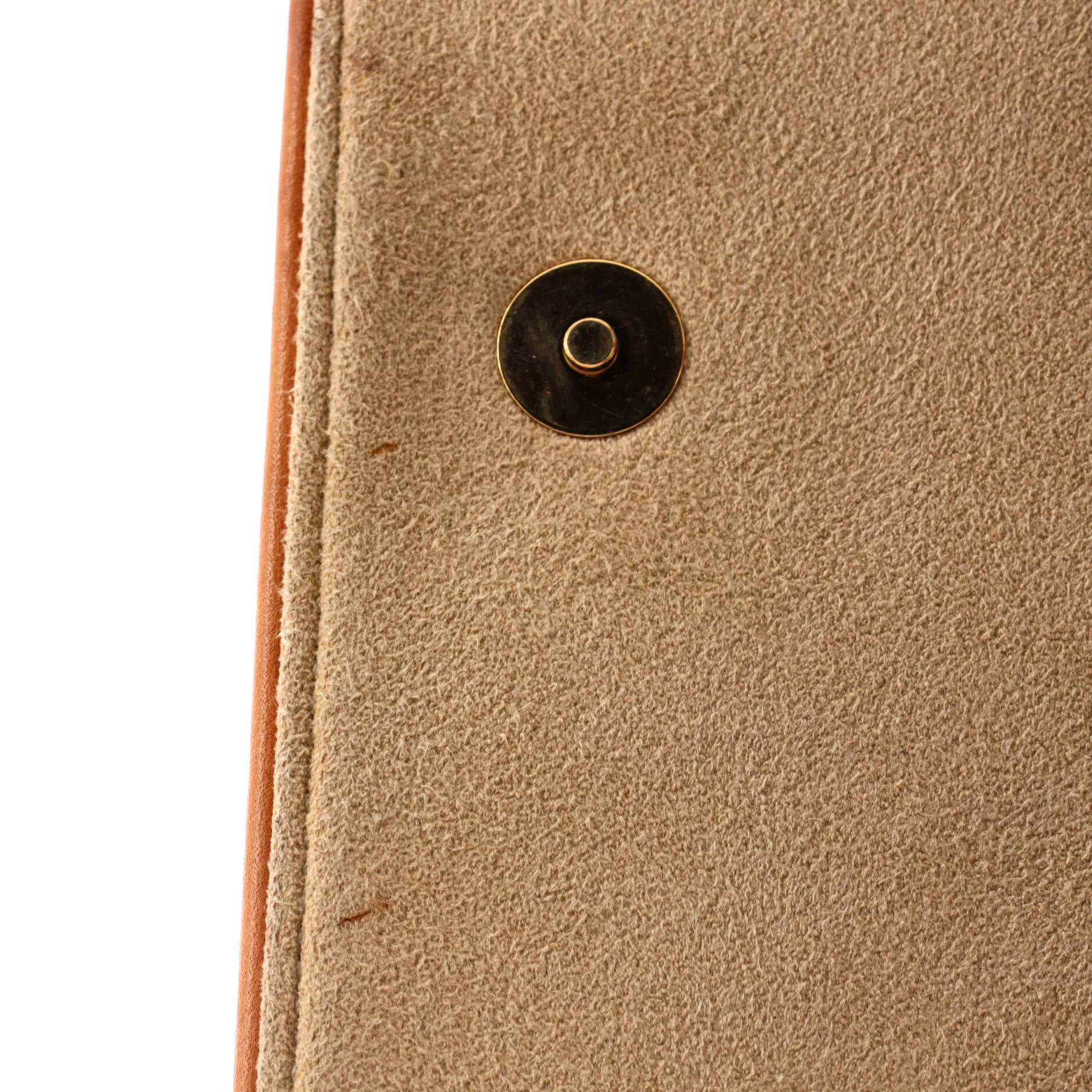 Condition: Fair. Minor wear on exterior, heavy darkening, wear, scuffs, marks and moderate cracking on leather trims and strap, wear and marks underneath flap and in interior, scratches on hardware.