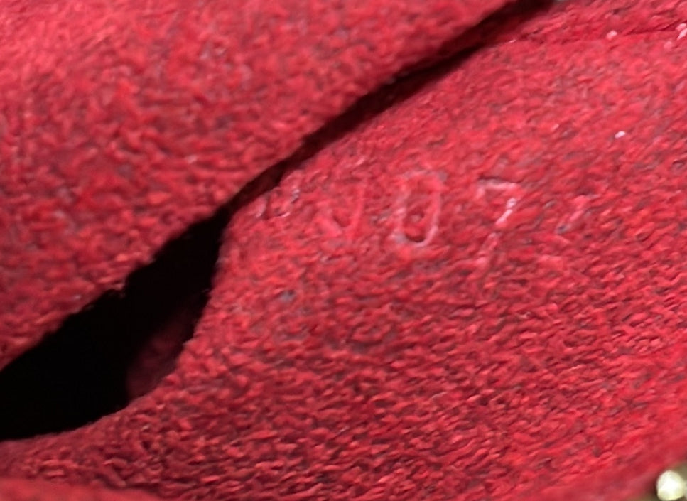 Condition: Very good. Odor in interior. Creasing and wear on exterior and strap, moderate wear on base corners, darkening, scuffs and watermarks on leather trims and strap. Wear, minor marks and light glitter in interior, scratches, discoloration and tarnish on hardware.