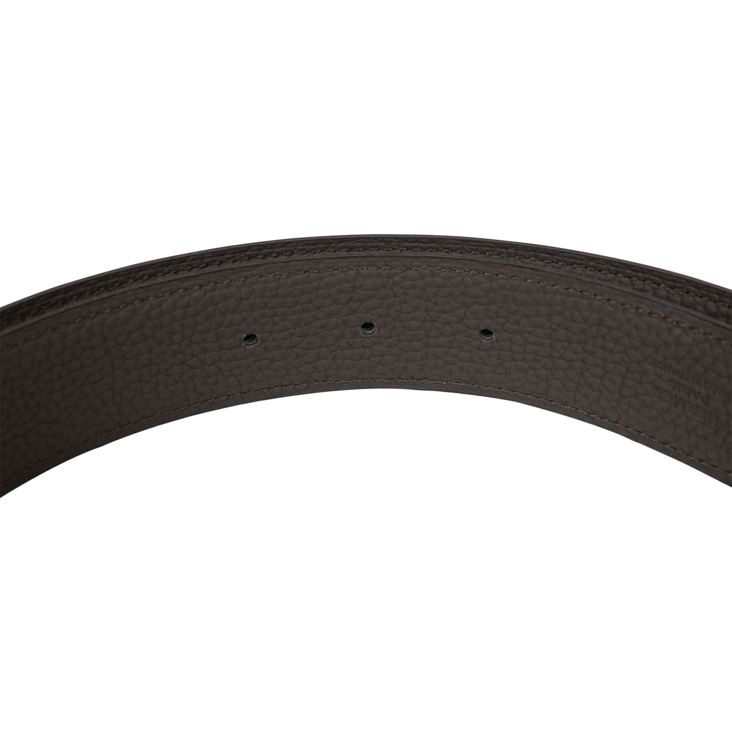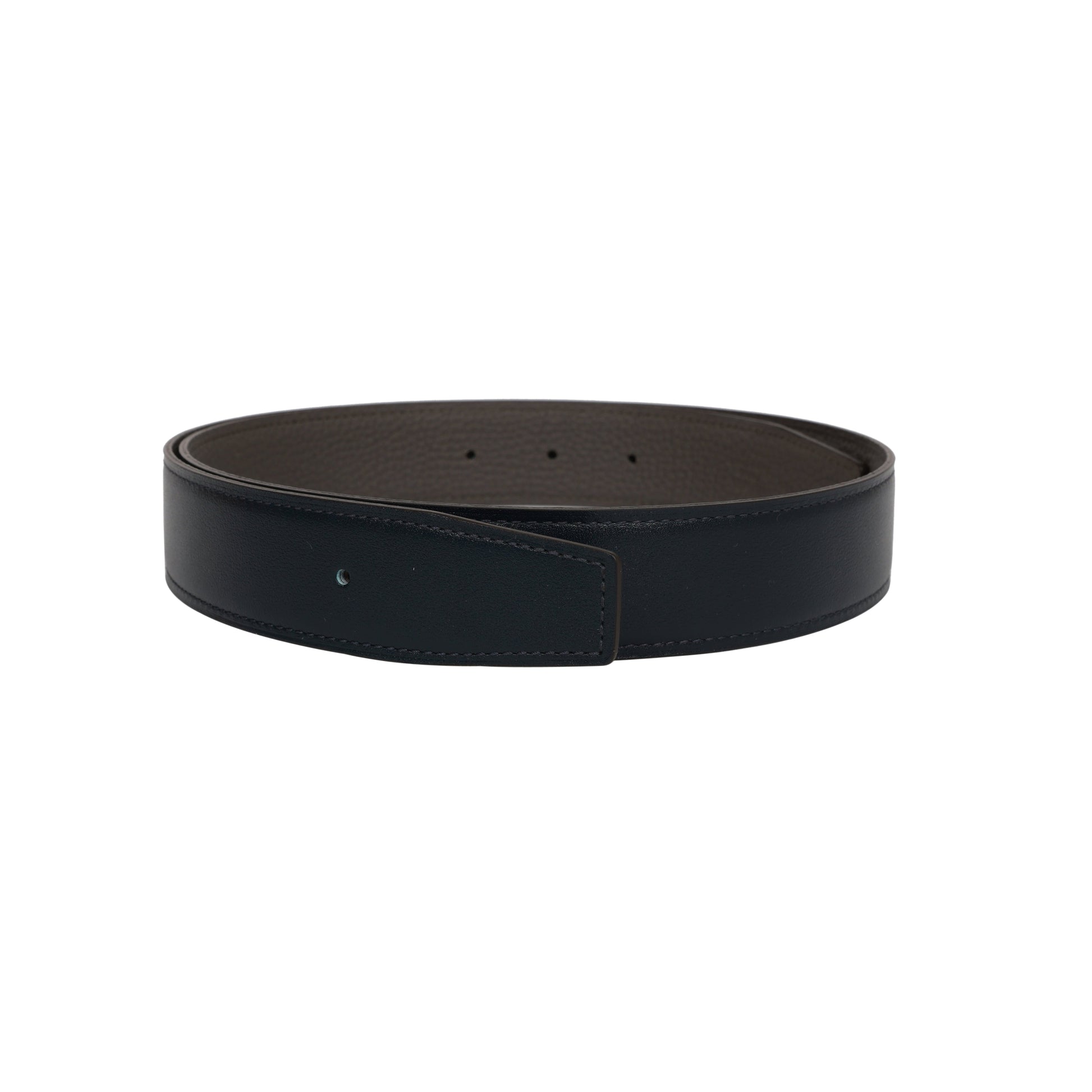 This Constance Belt kit has a wide belt strap in bleu marine calfskin leather reversing to etain togo leather accompanied by removable H buckle of brushed gold plated hardware.