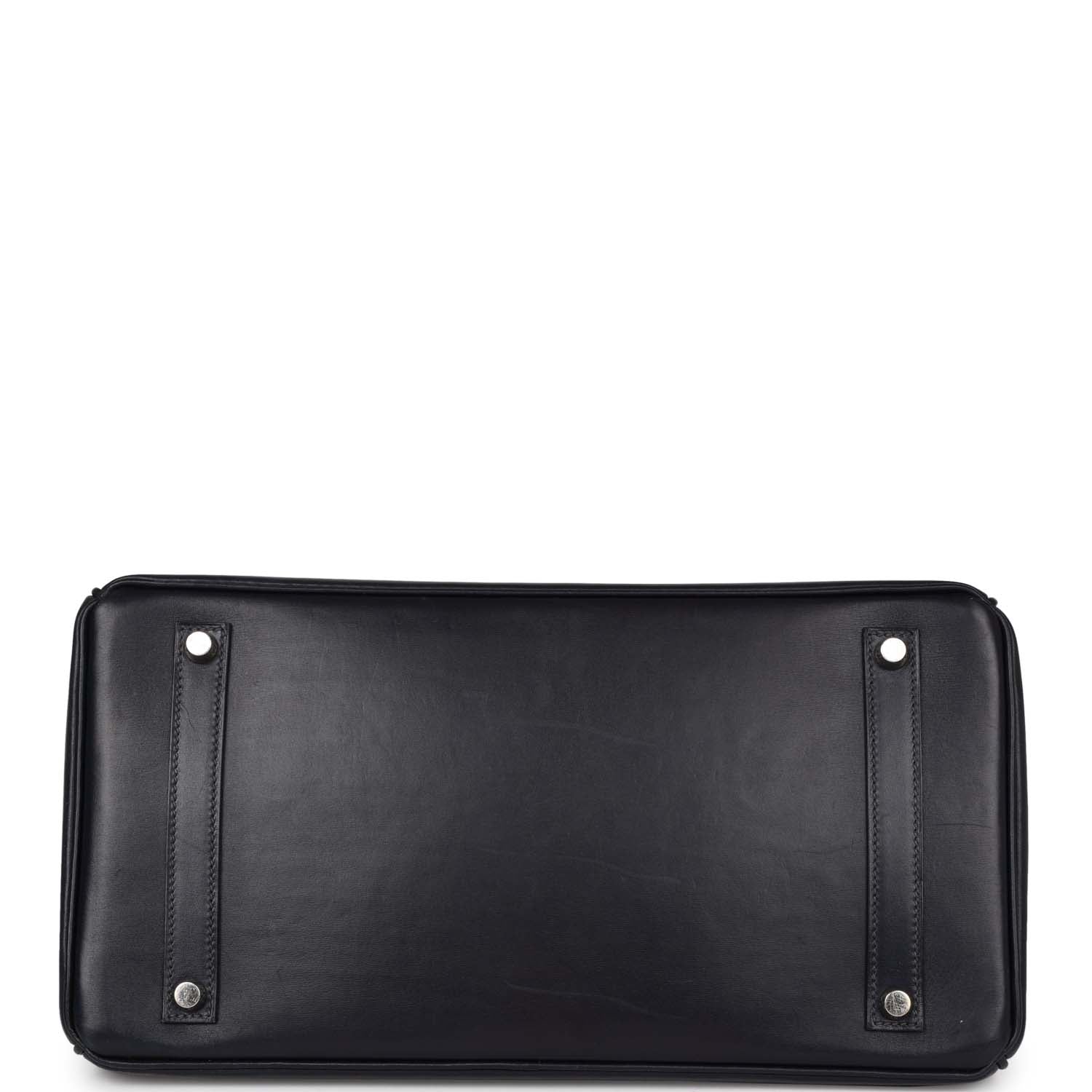 This Birkin is in Bleu Navy box calf leather with palladium hardware, tonal stitching, front flap with two straps, front toggle closure, clochette with lock and two keys, double rolled handles.