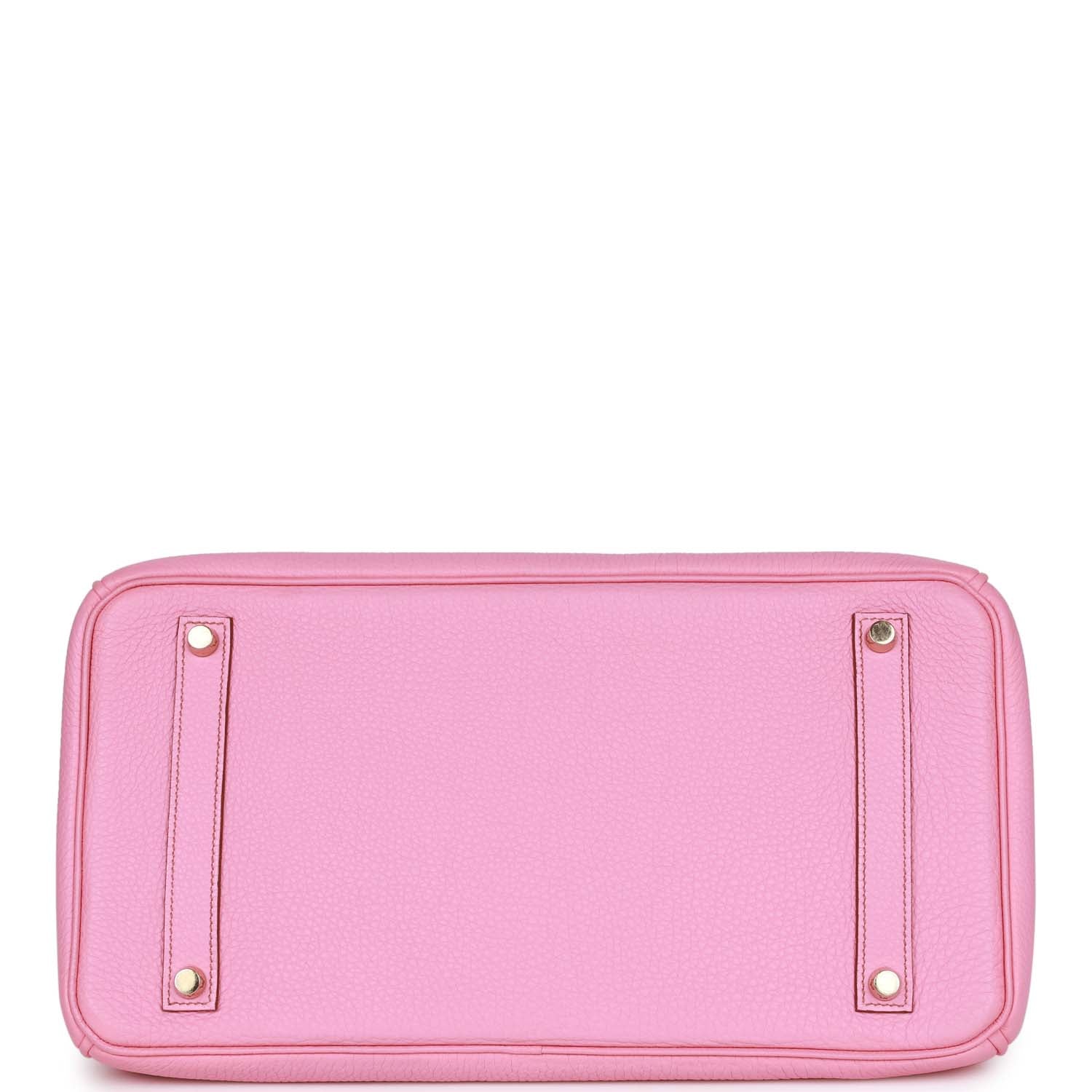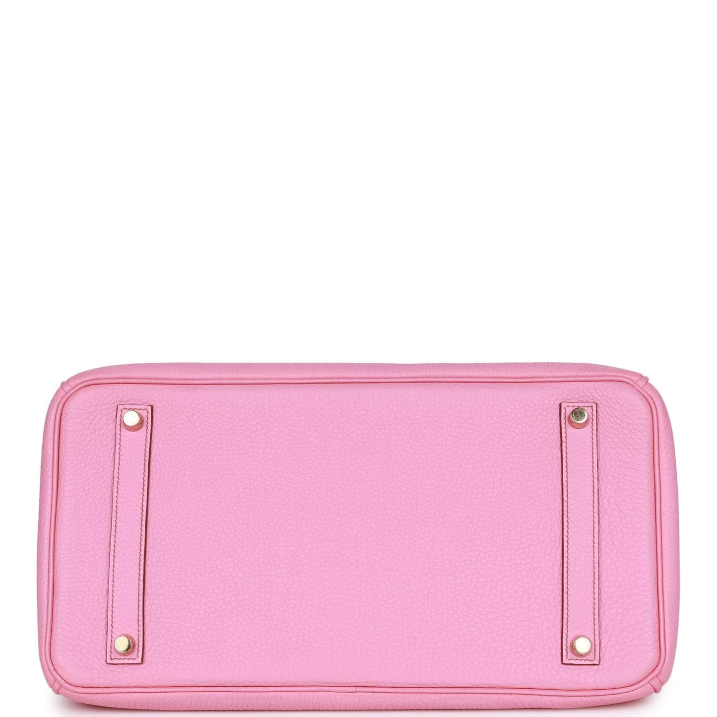This super collectible Birkin is in Bubblegum togo leather with gold hardware and has contrast stitching, a front toggle closure, a clochette with lock and two keys, and double rolled handles.
