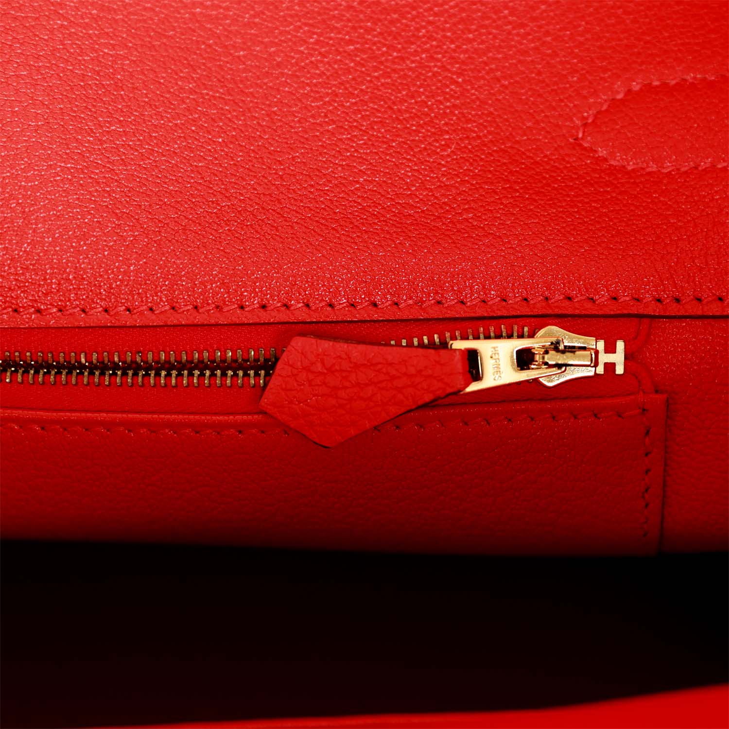 The interior is lined with Capucine chevre and has one zip pocket with an Hermes engraved zipper pull and an open pocket on the opposite side.