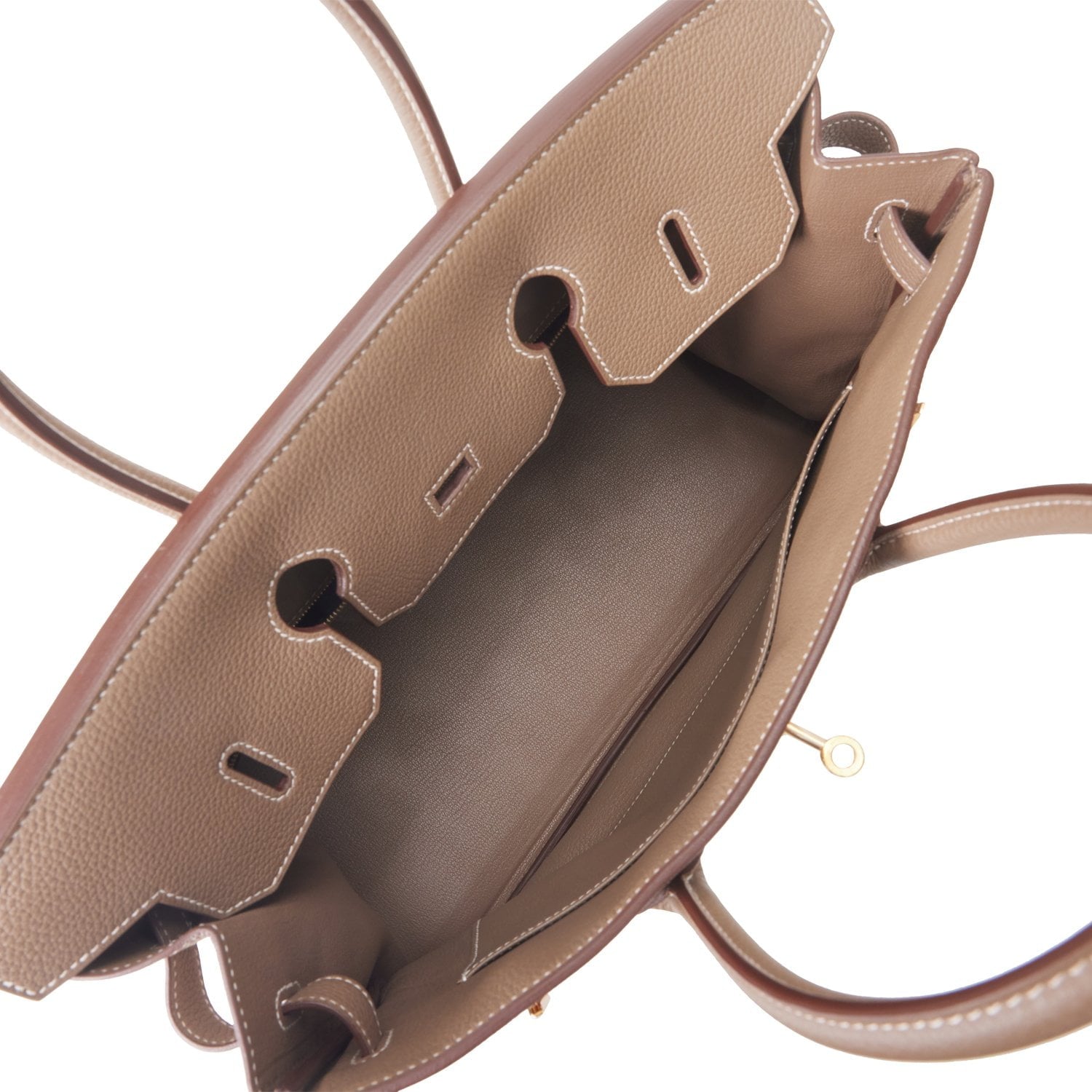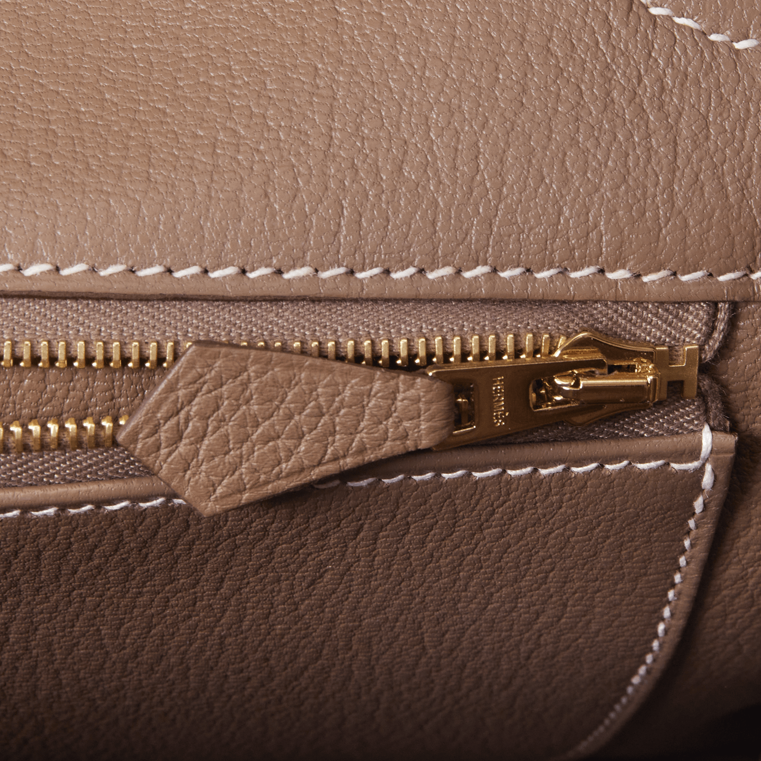 The interior is lined with Etoupe chevre and has one zip pocket with an Hermes engraved zipper pull and an open pocket on the opposite side.