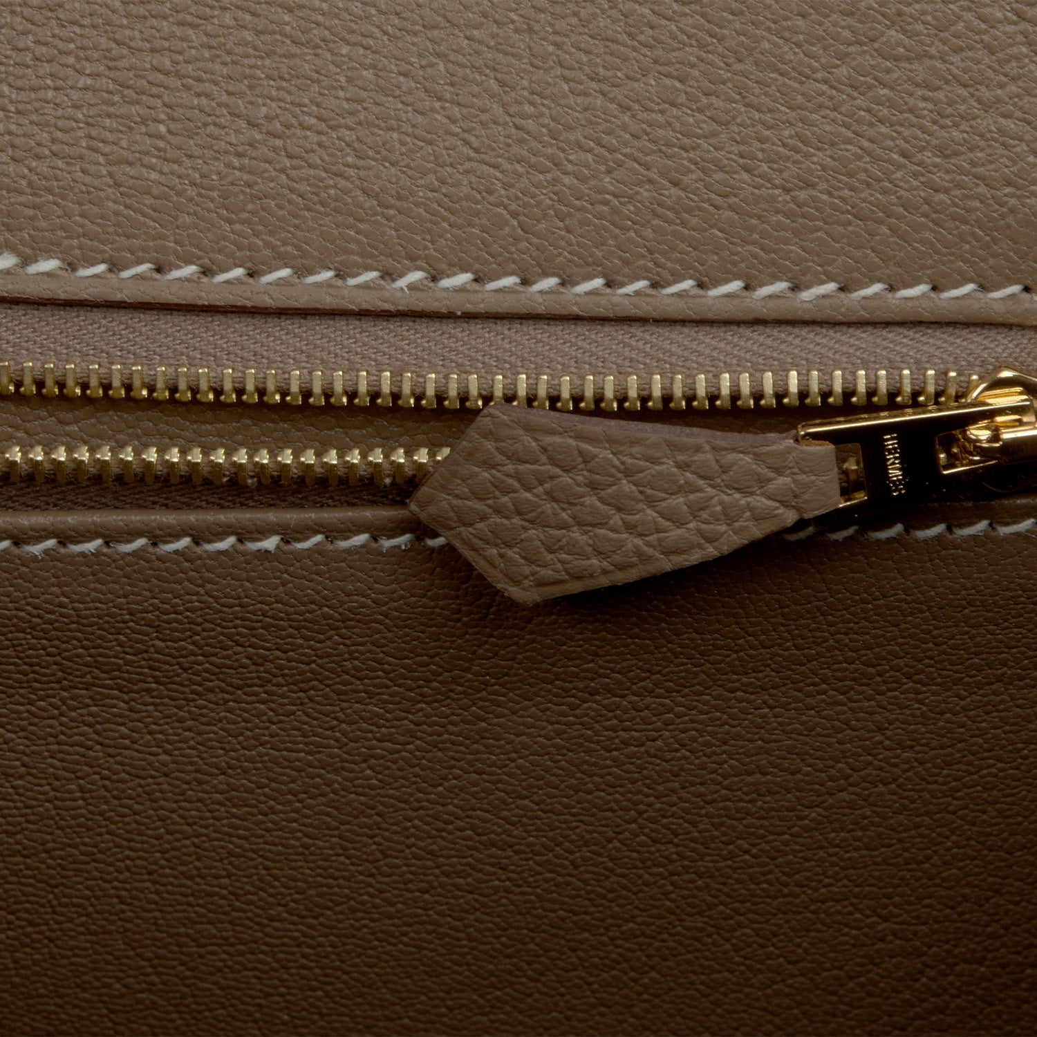 This Birkin is in Etoupe togo leather with gold hardware and has contrast stitching, front flap, two straps with center toggle closure, clochette with lock and two keys, and double rolled handles.