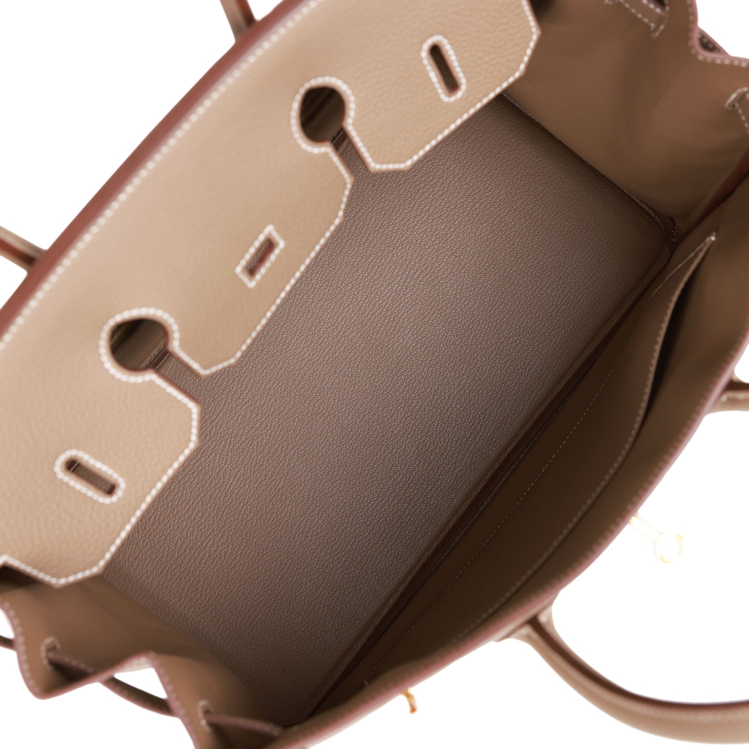 The interior is lined with Etoupe chevre and has one zip pocket with an Hermes engraved zipper pull and an open pocket on the opposite side.