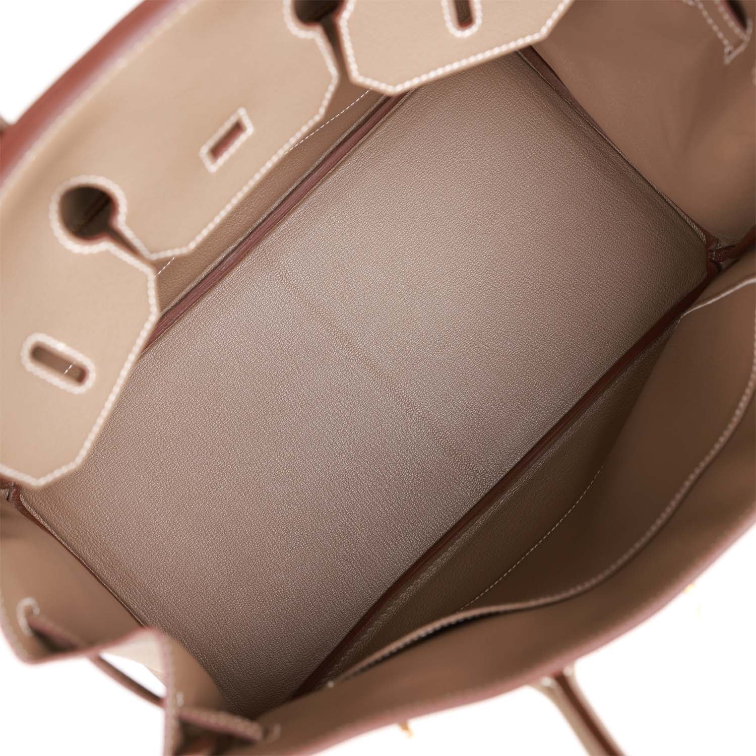 The interior is lined with Etoupe chevre and has one zip pocket with an Hermes engraved zipper pull and an open pocket on the opposite side.