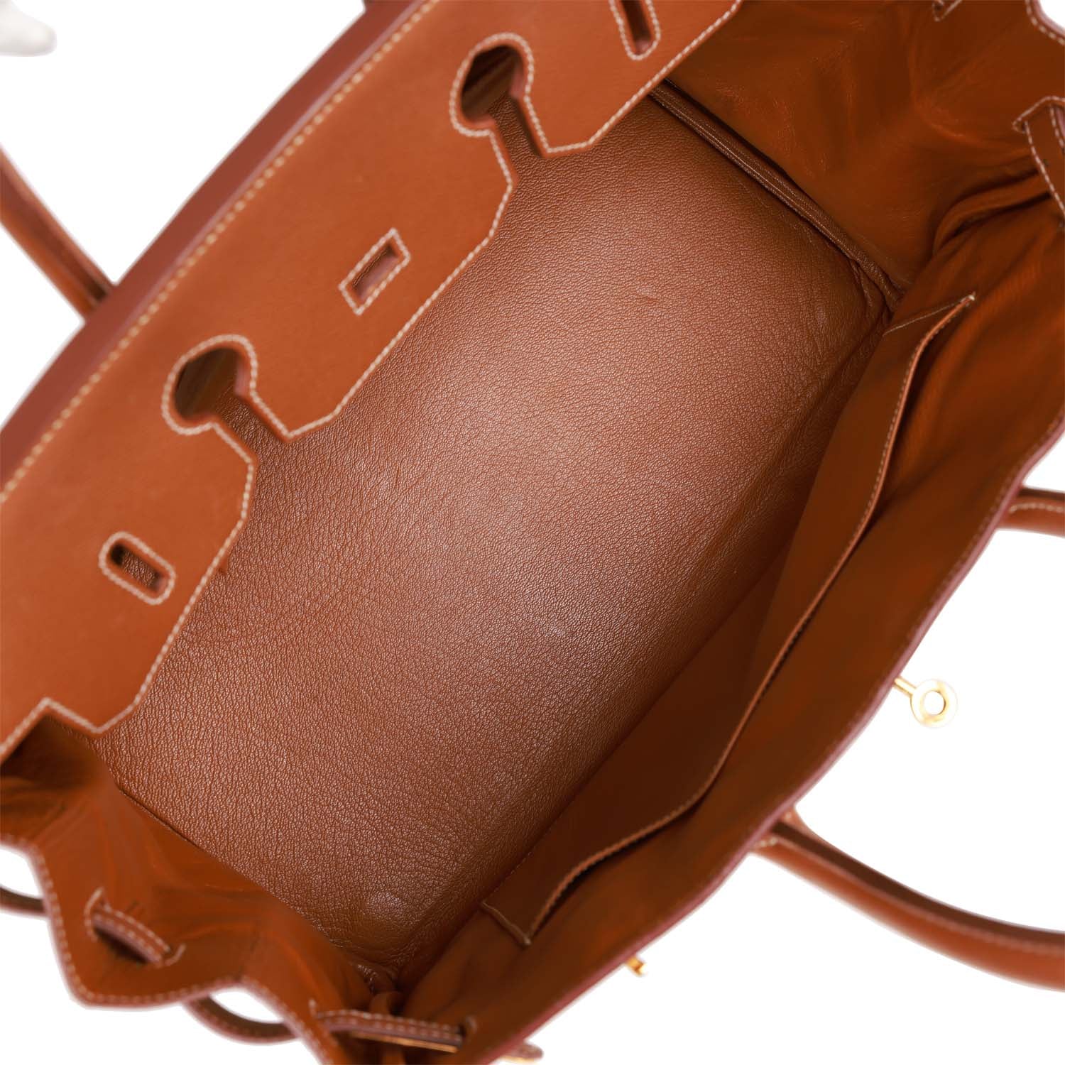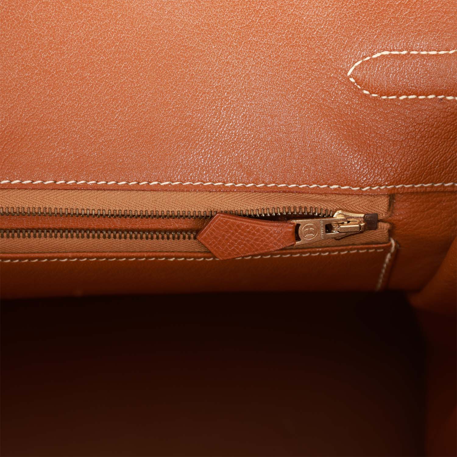 The interior is lined with Gold chevre and has one zip pocket with an Hermes engraved zipper pull and an open pocket on the opposite side.