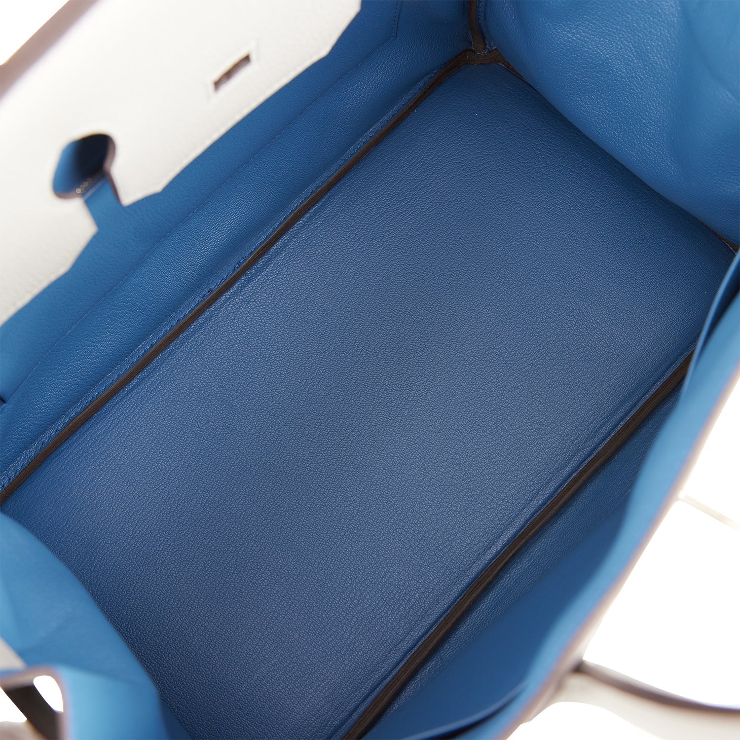 The interior is lined with Bleu Agate chevre and has one zip pocket with an Hermes engraved zipper pull and an open pocket on the opposite side.