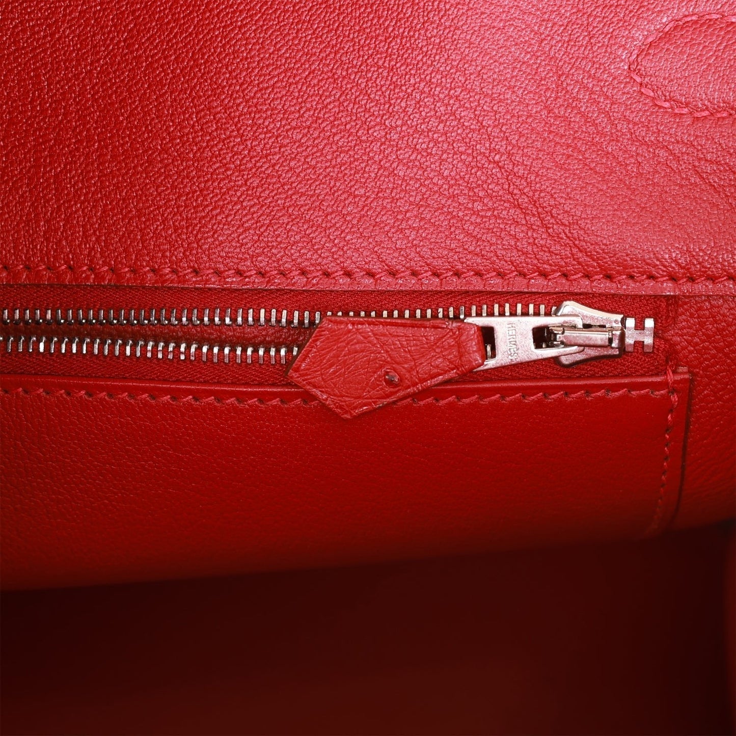 The interior is lined with Rouge Vif chevre and has a zip pocket with an Hermes engraved zipper pull and an open pocket on the opposite side.