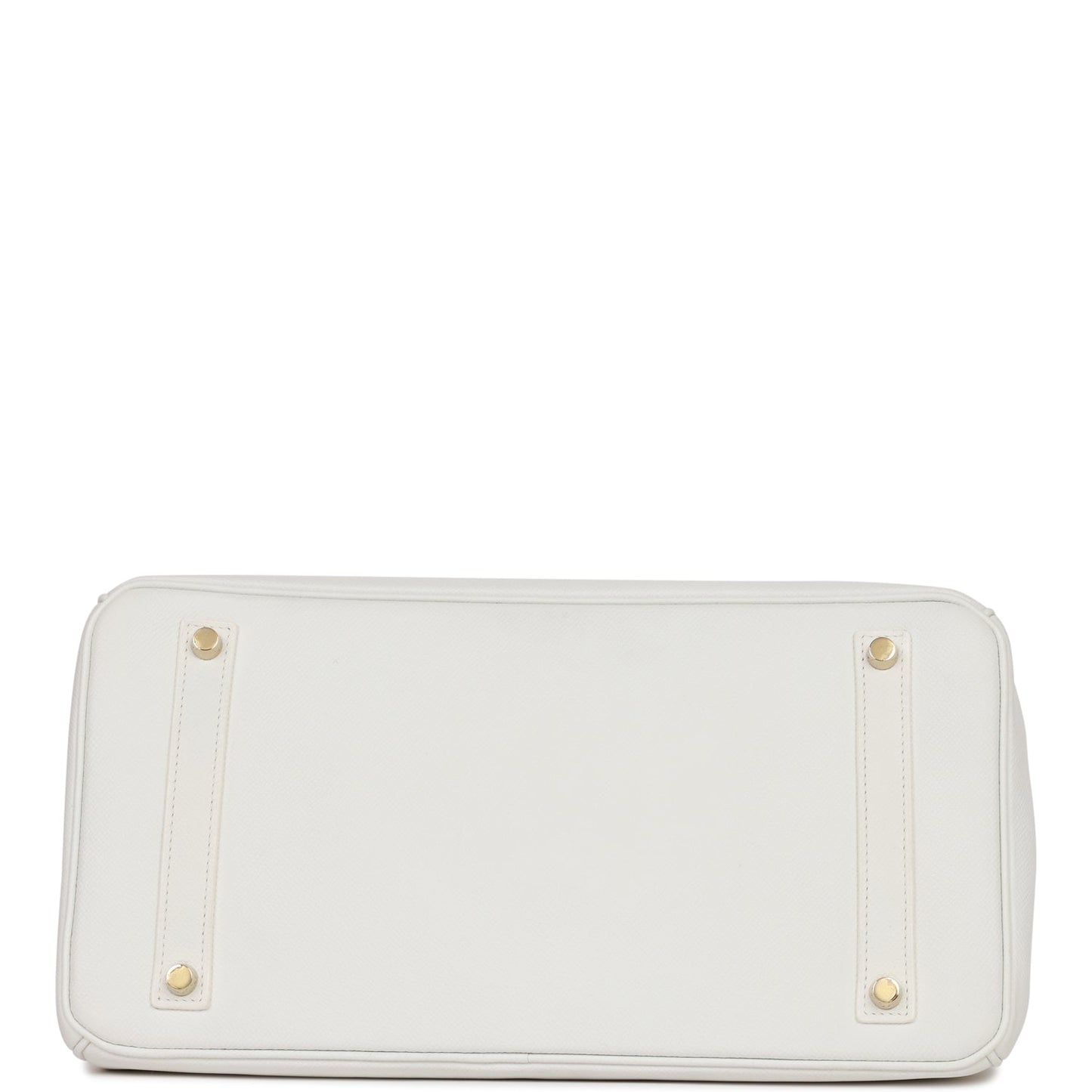 This Birkin is in White epsom leather with gold hardware and has tonal stitching, a front toggle closure, a clochette with lock and two keys, and double rolled handles.