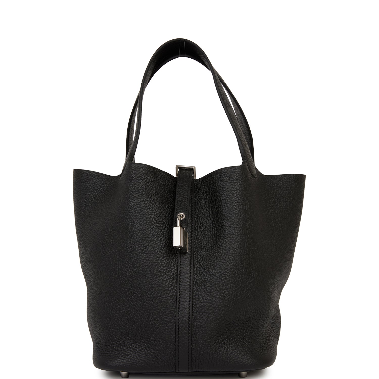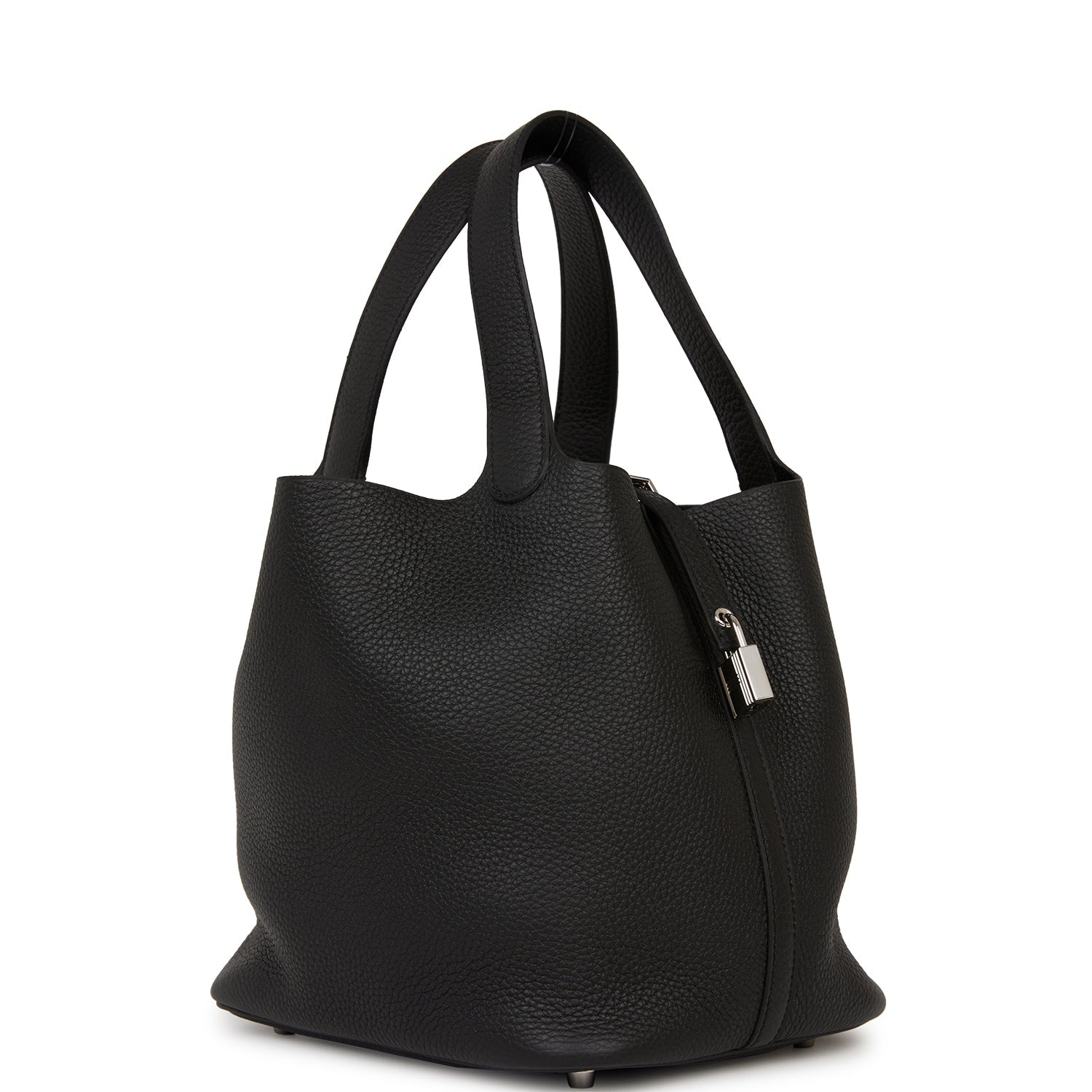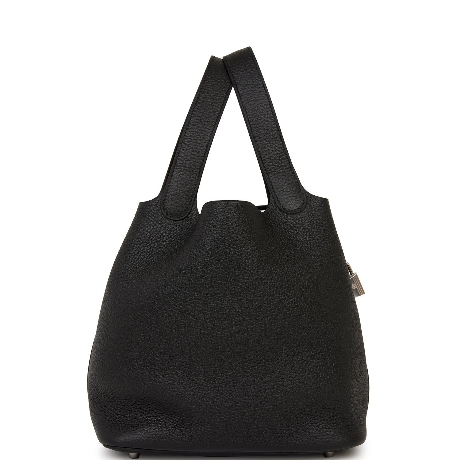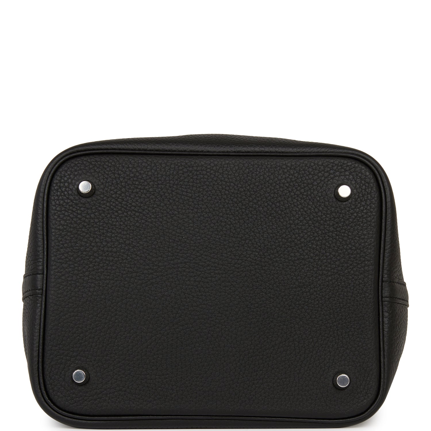 This Picotin is in black clemence leather with palladium hardware and has tonal stitching with two top handles.