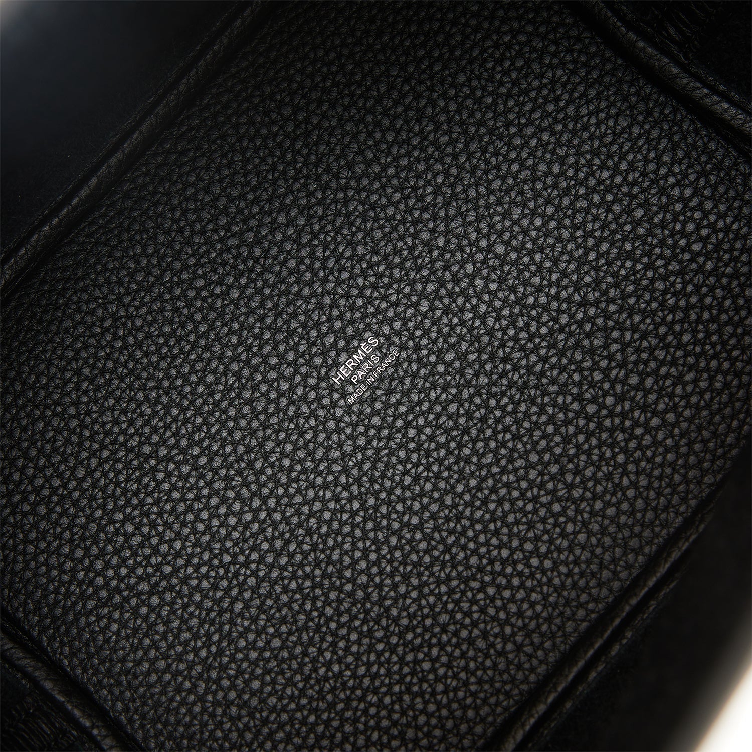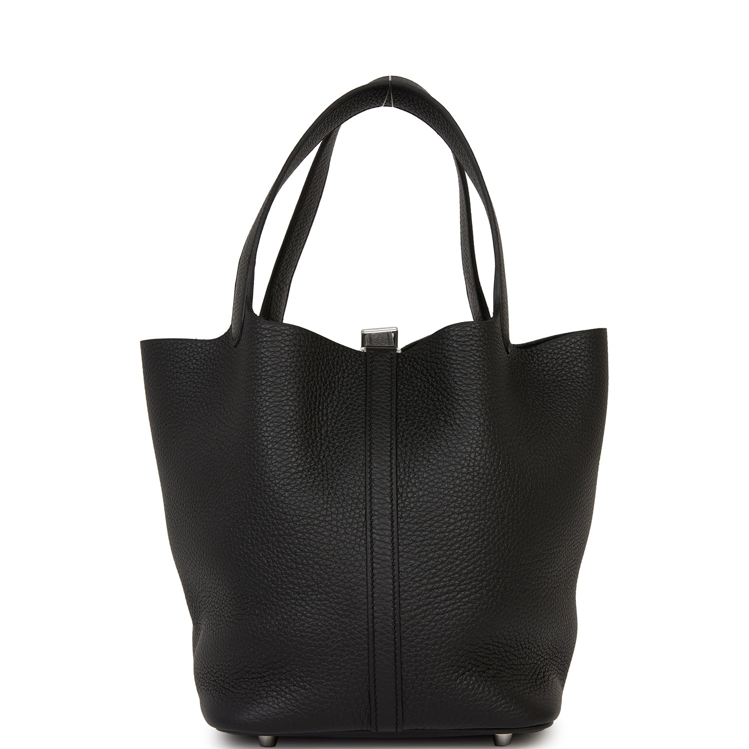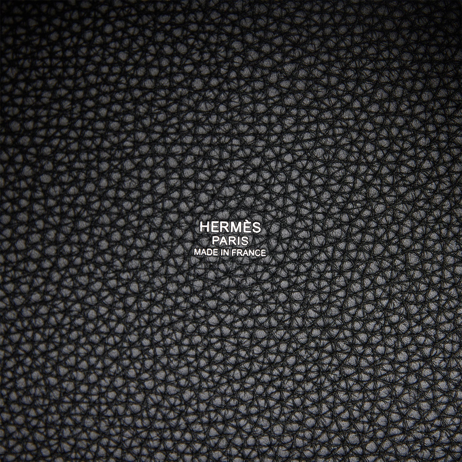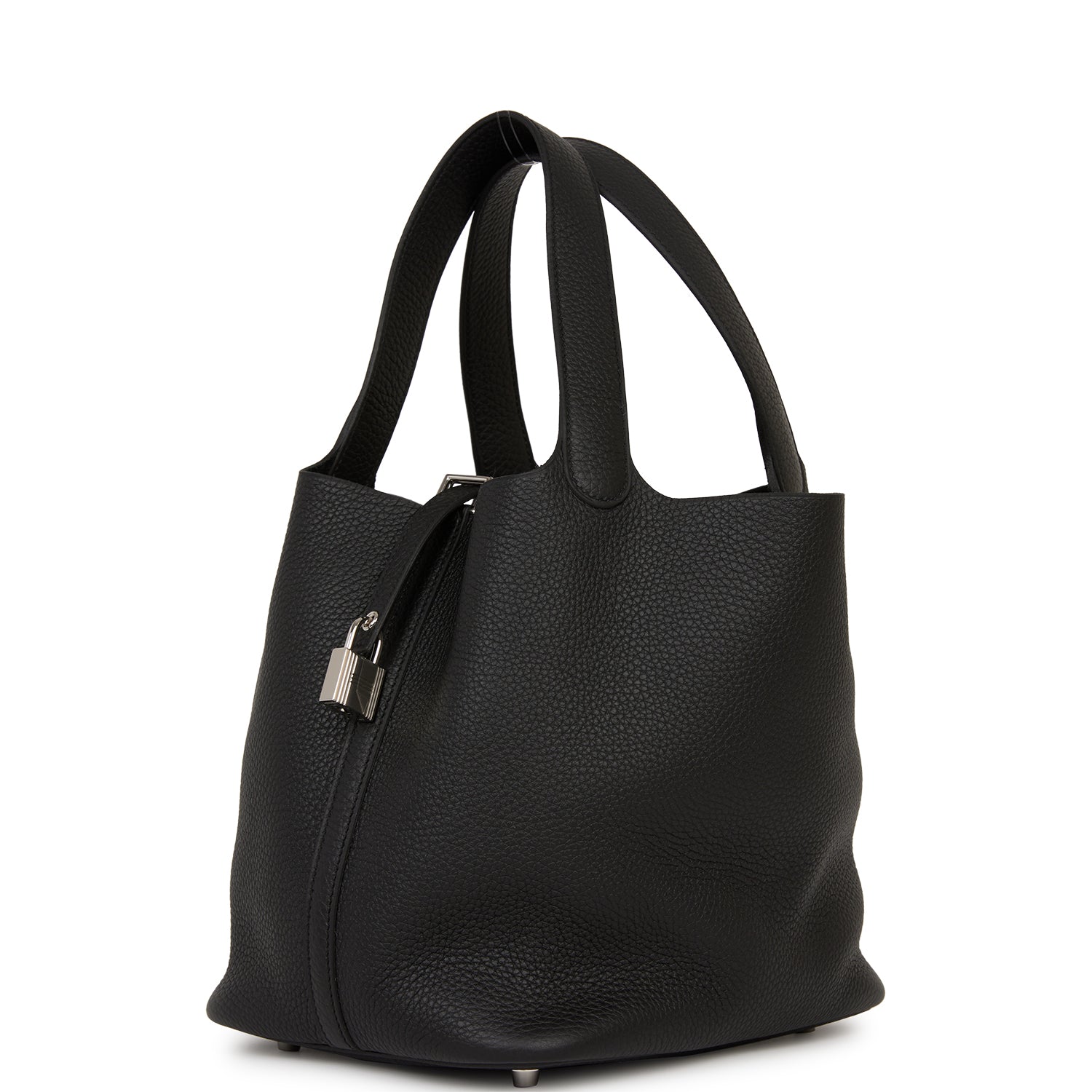 This Picotin is in black clemence leather with palladium hardware and has tonal stitching with two top handles.