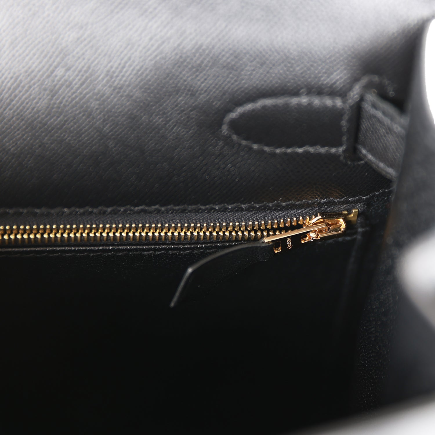 The interior is lined with black chevre leather and has one zip pocket with an Hermes engraved pull and two open pockets on the opposite side.
