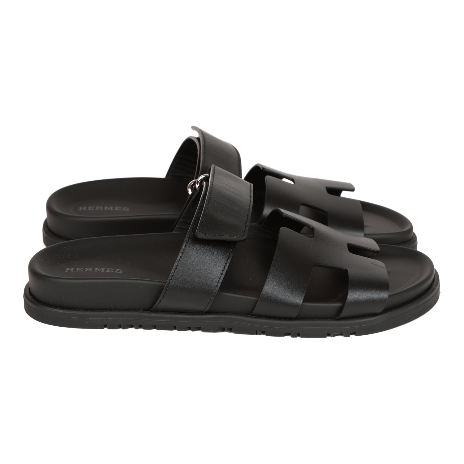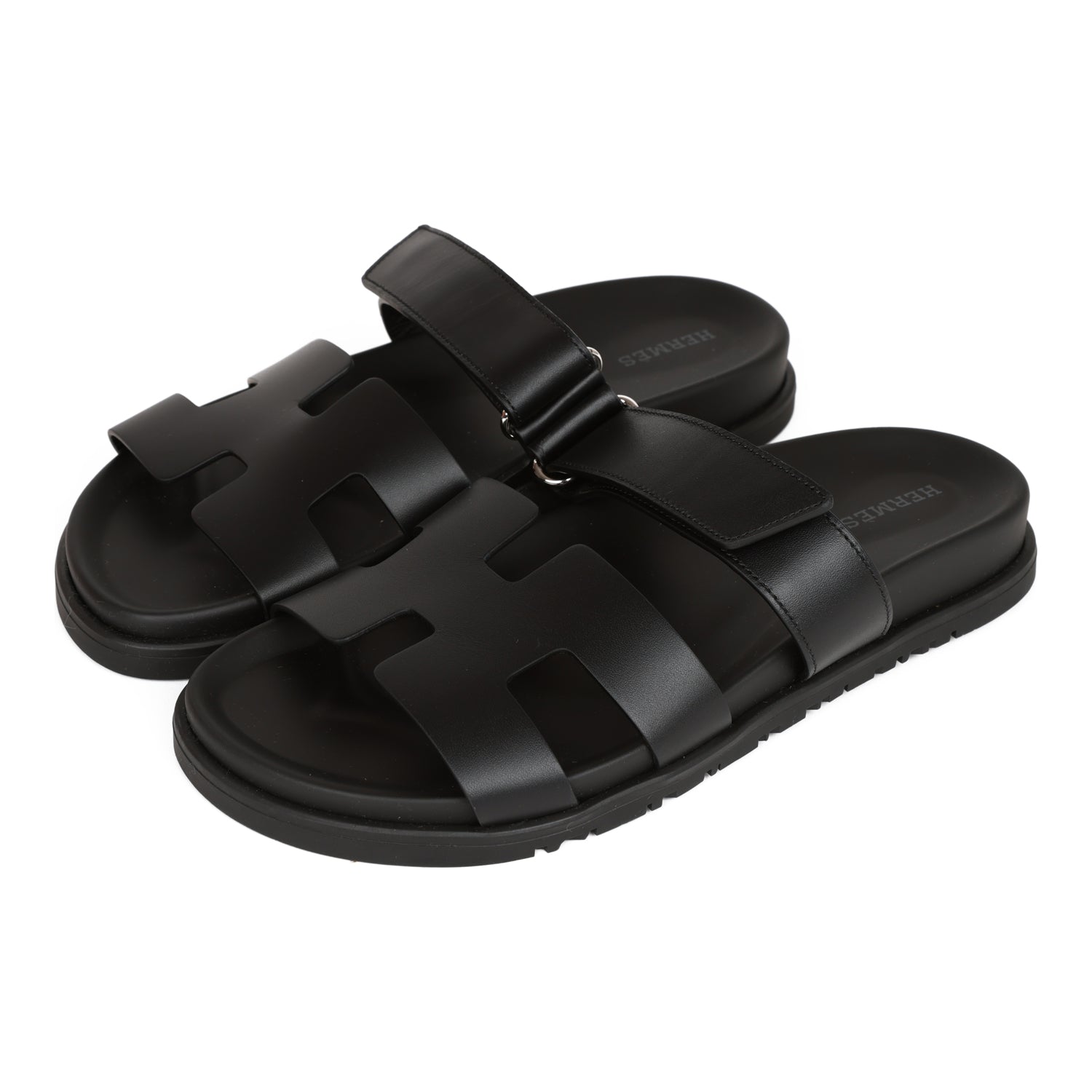 This pair of Cypre sandals are in black calfskin and feature the iconic H and a velcro crossover strap.