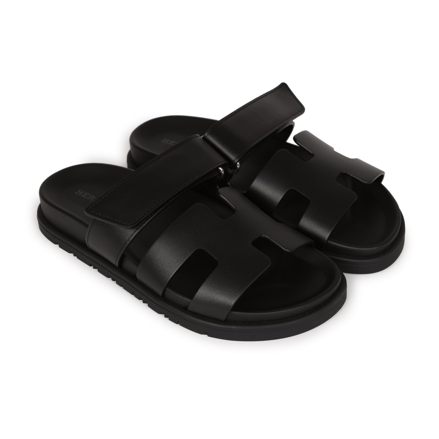This pair of Cypre sandals are in Black calfskin and feature the iconic H and a velcro crossover strap.