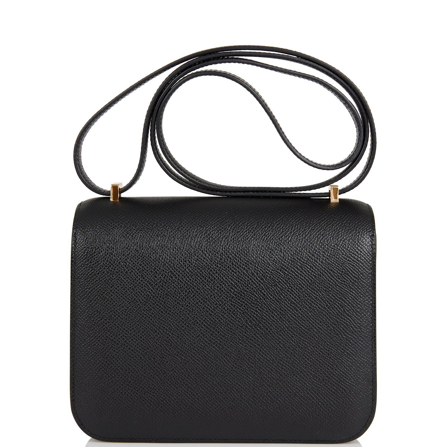 This Constance is in Black epsom leather with gold hardware and has tonal stitching, a metal "H" snap lock closure and adjustable shoulder strap.