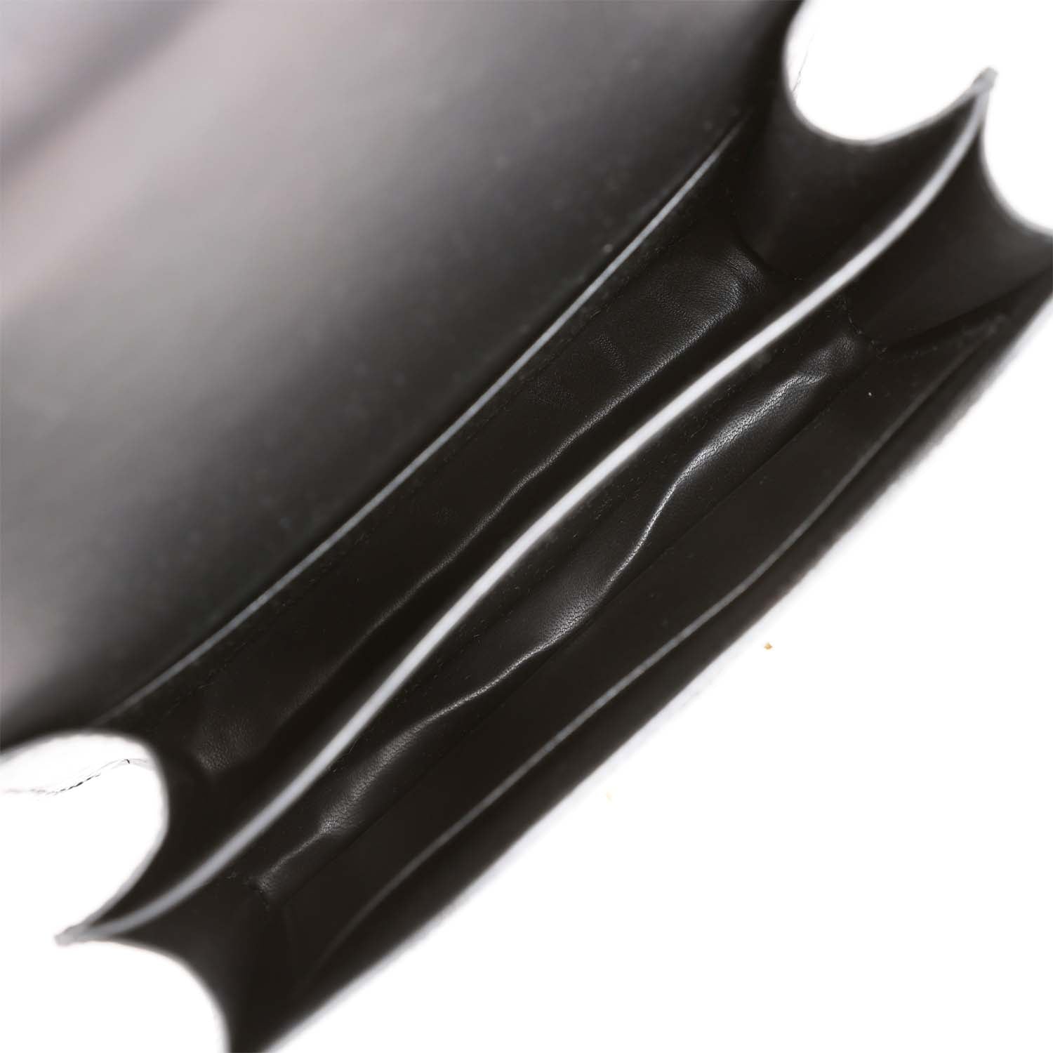 This Constance is of Black shiny alligator with gold hardware and features tonal stitching, a "H" snap lock closure, and an adjustable shoulder strap.