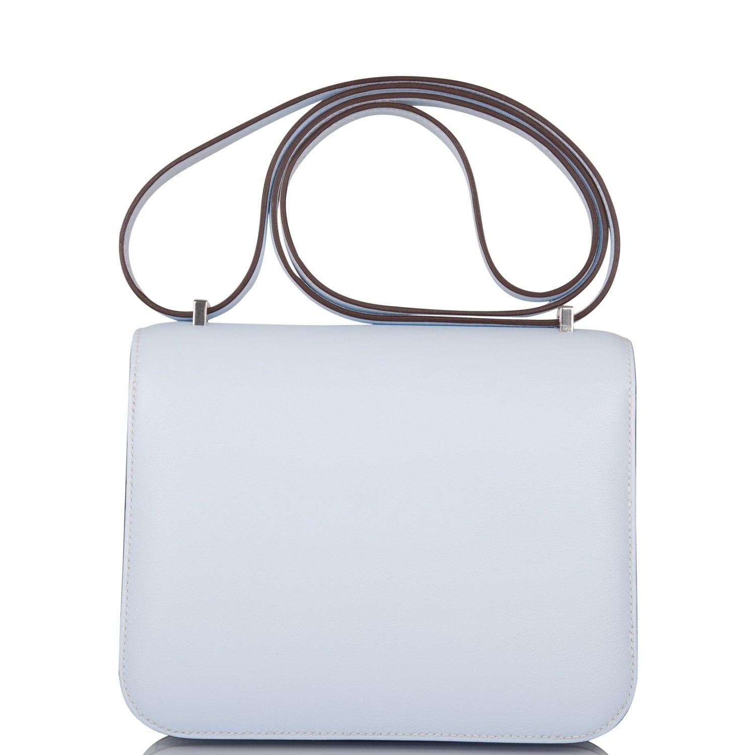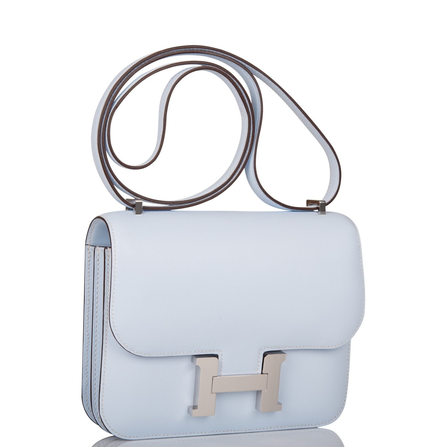 This Constance is in Bleu Brume swift leather with palladium hardware and has tonal stitching, a metal "H" snap lock closure and adjustable shoulder strap.