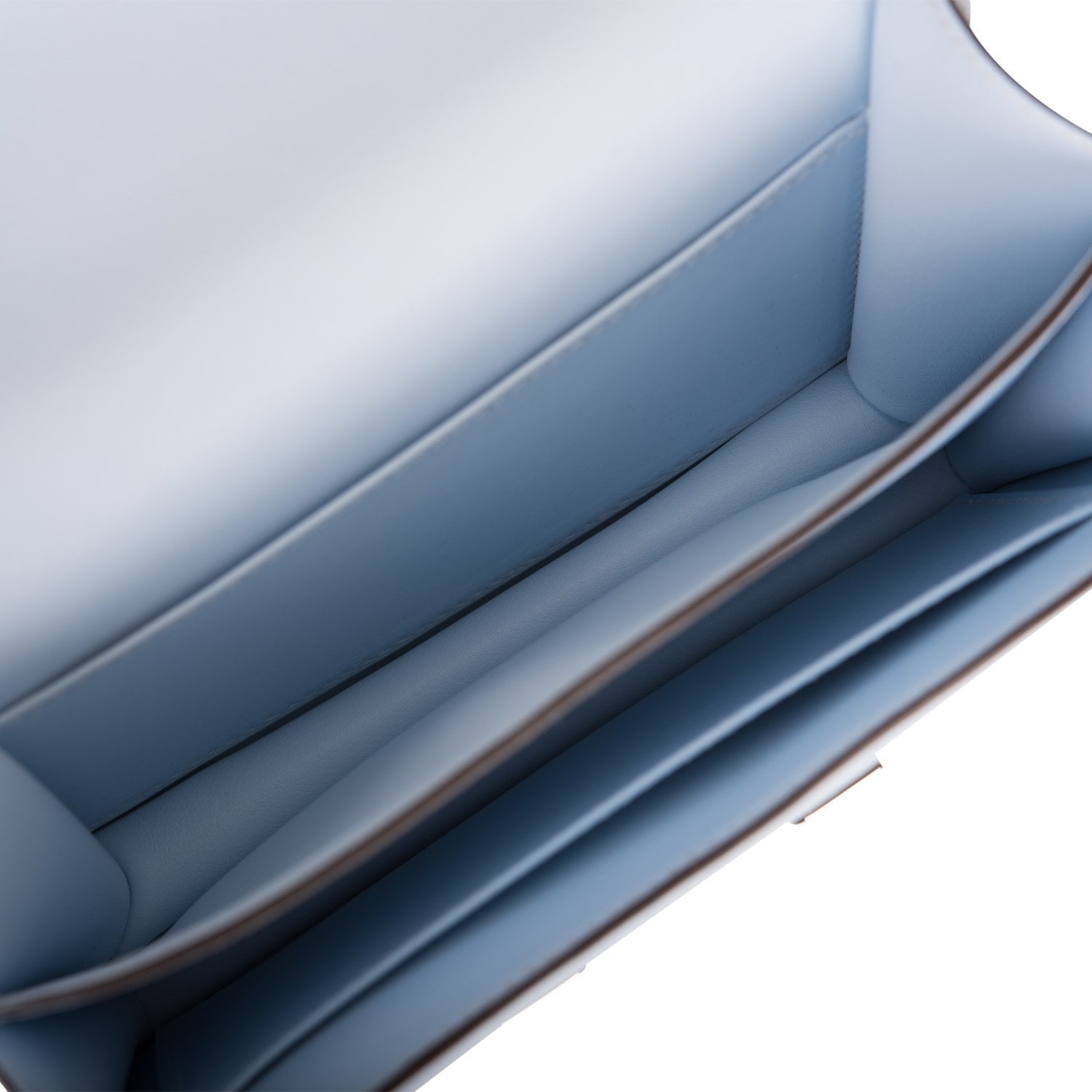 The interior is lined with Bleu Brume lambskin and has an open pocket on the front wall, a center divide, and a slit pocket on the back wall.