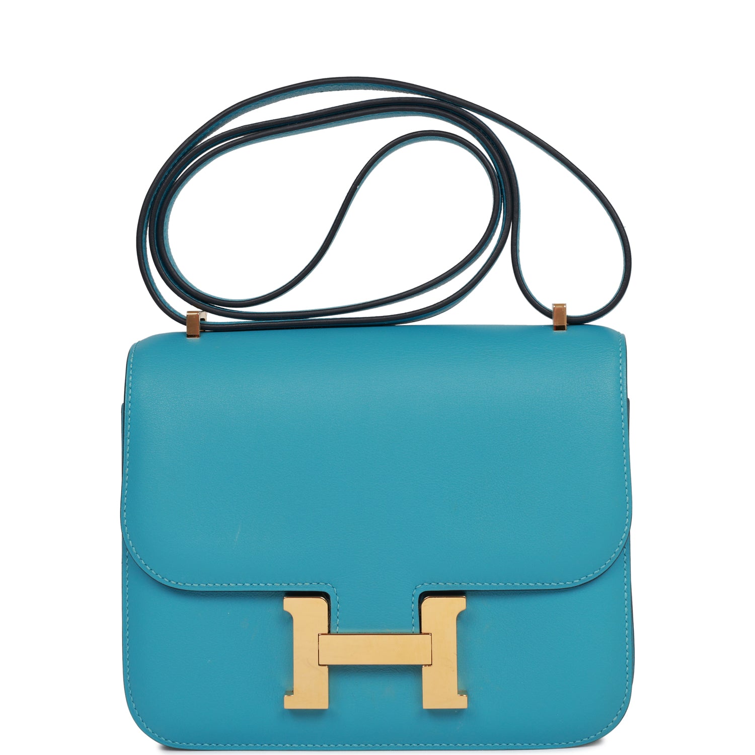 This Constance is in Bleu du Nord swift leather with gold hardware and has tonal stitching, a metal "H" snap lock closure and adjustable shoulder strap.