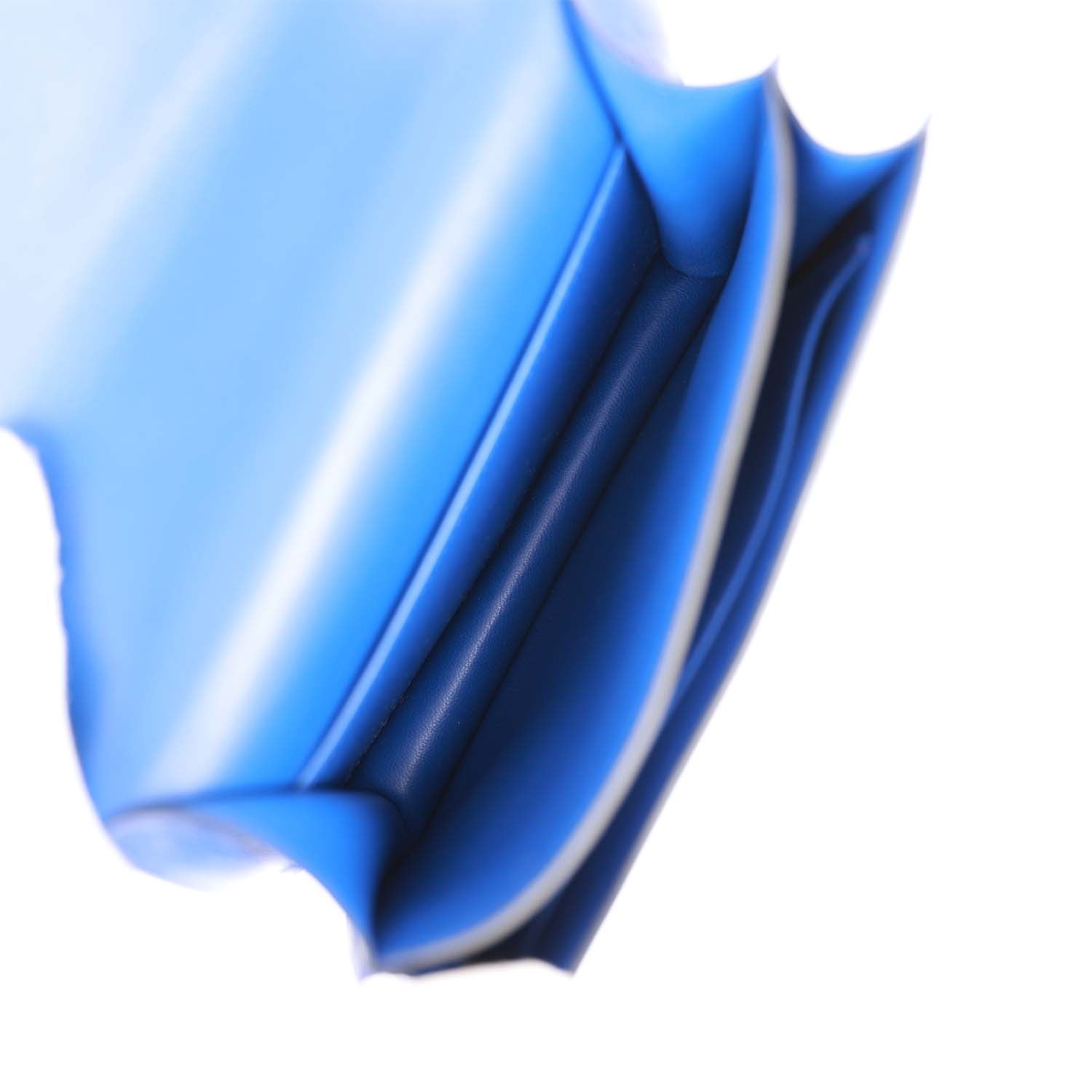 The interior is lined with Bleu Electric lambskin and has an open pocket on the front wall, a center divide, and a slit pocket on the back wall.